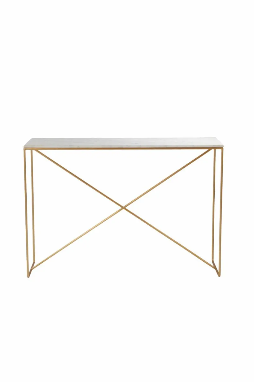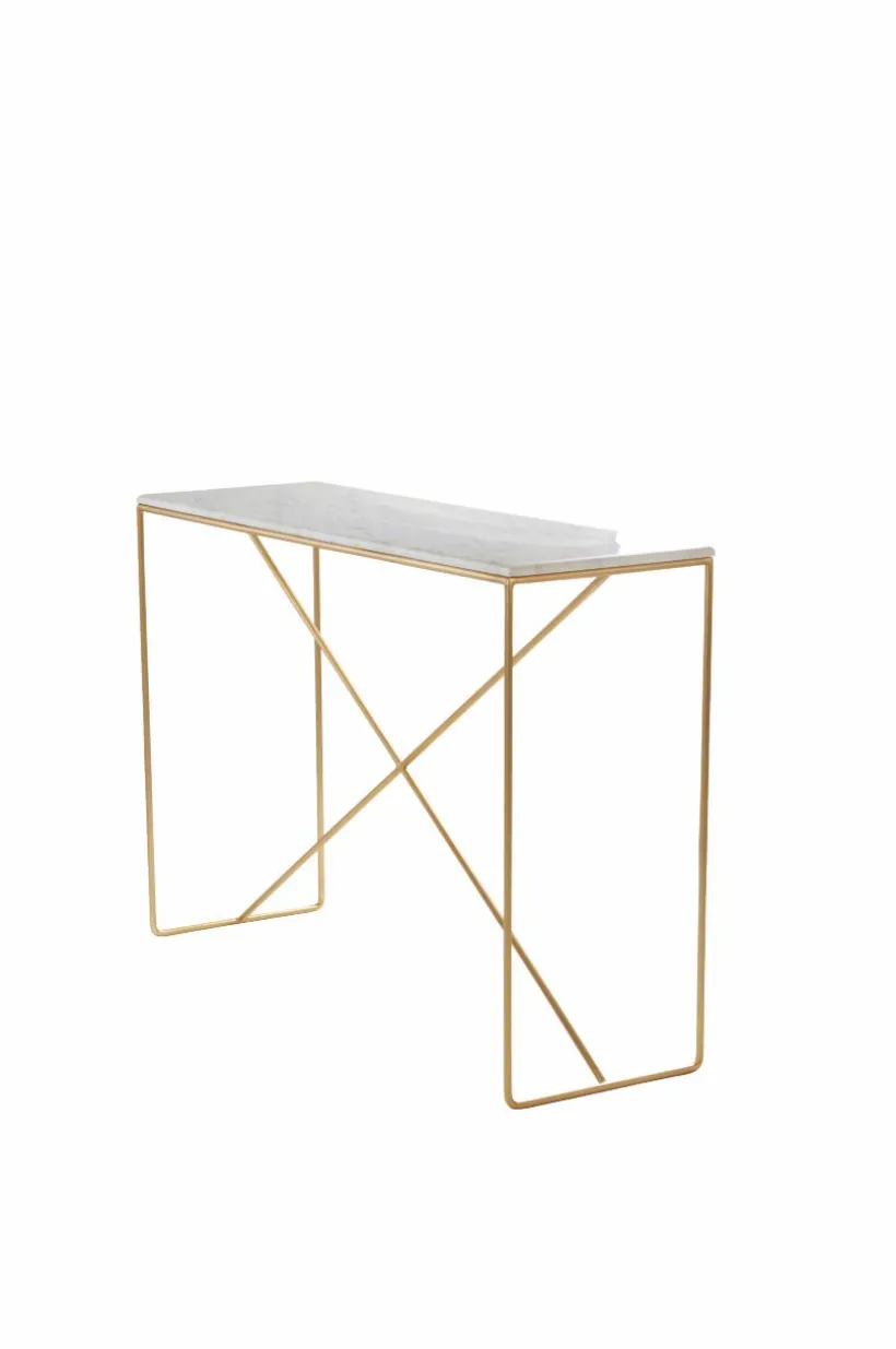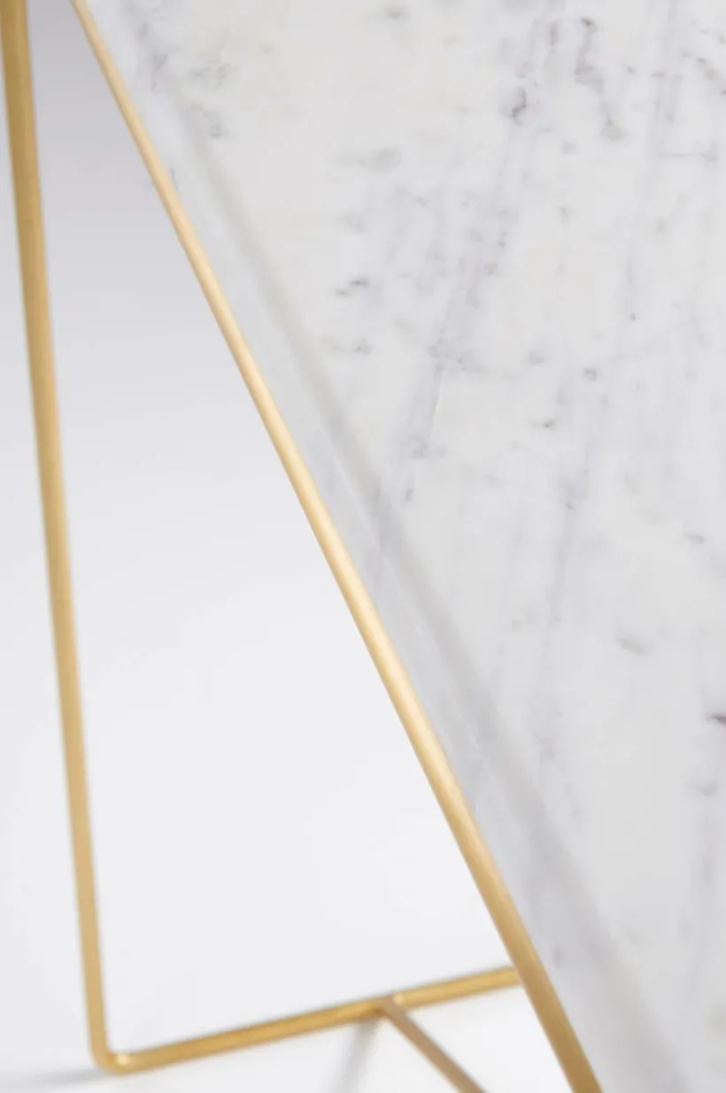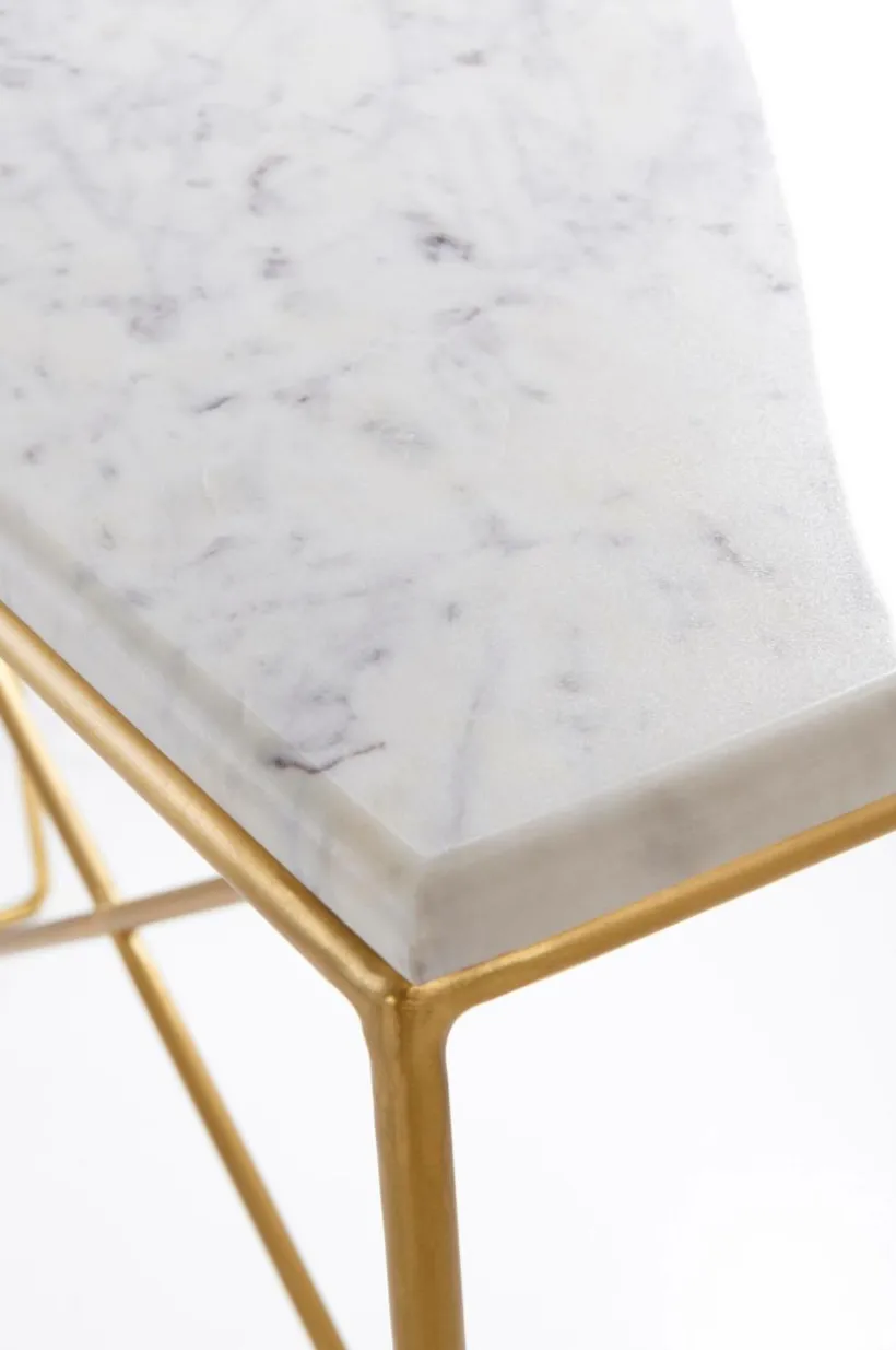 Sidobord av metall med bordsskiva av marmor. Det dekorativa mötet med benen gör att det annars avskalade bordet får en vacker detalj.