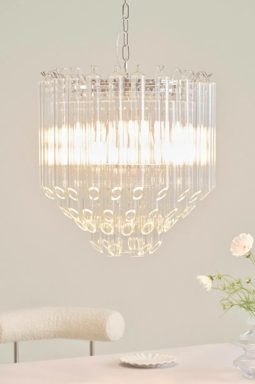 Taklampa som består av glasstavar i flera våningar, stommen är av kromfärgad järn. Stavarna av glas ger lampan fint sken. Lampan hänger i en kedja med justerbar längd.