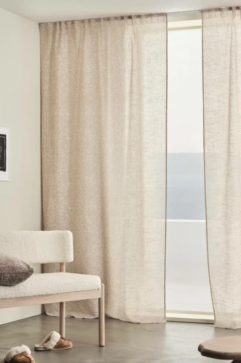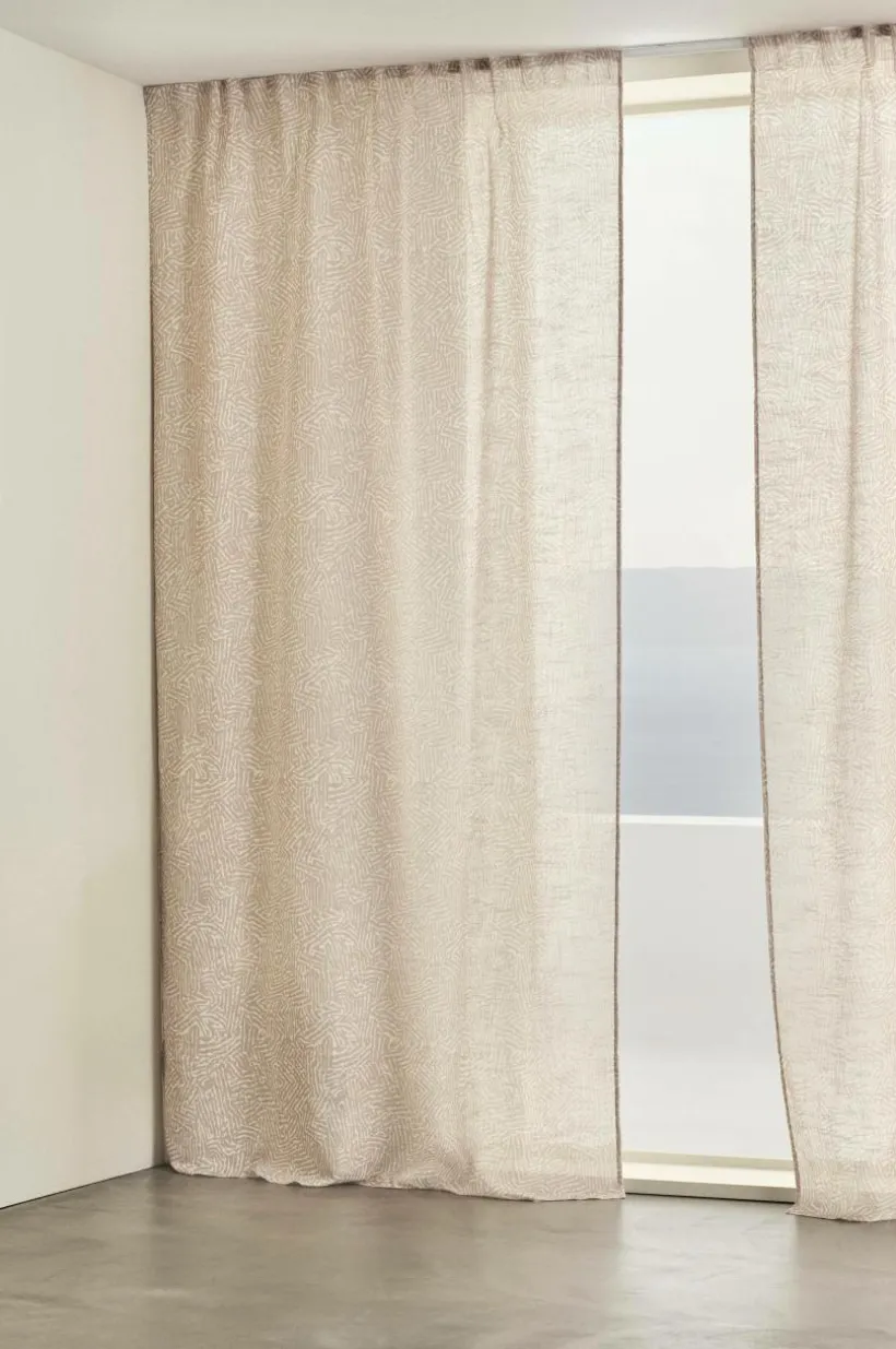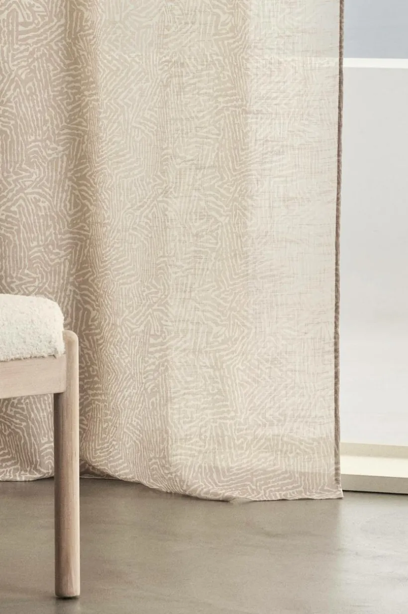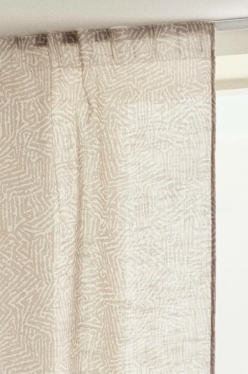 Två gardinlängder i mönstertryckt polyester som är snyggt glesvävd och lite skirare. Det läckra mönstret, som associerar till naturen på många sätt, i kombination med en lätt och smidig kvalité ger ditt fönster skön karaktär. Påsytt multifunktionsband och gardinen kan hängas upp med fingerkrokar, kanal samt dold hälla.