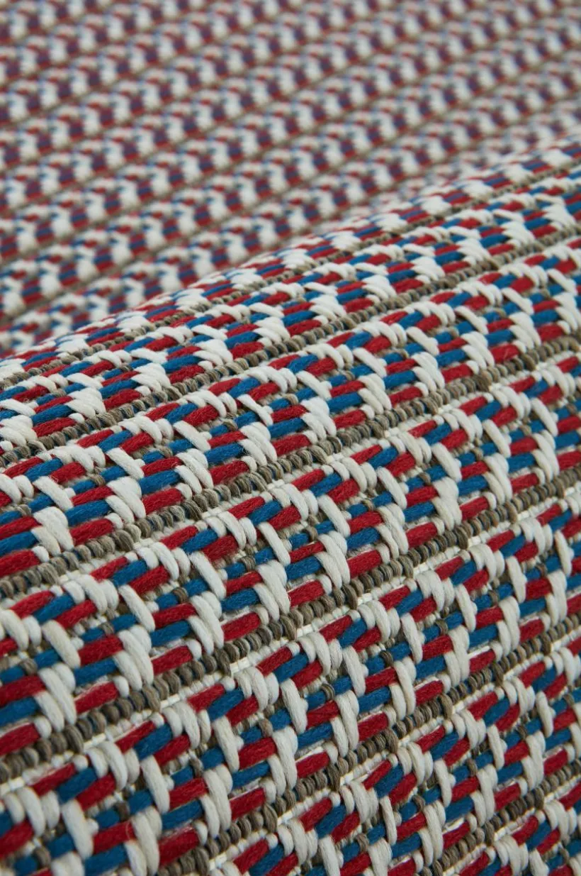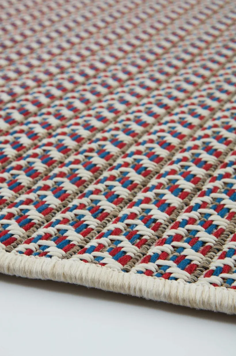 Förvandla ditt kök, veranda eller balkong med den livfulla BASIL utomhusmattan. Mattan är vävd av UV-beständig polypropylen och de sammanflätade röda, blå och vita trådarna skapar ett fängslande mönster som inte bleknar. BASIL:s mångsidiga design och tålighet gör den till ett perfekt val för inomhusutrymmen som utsätts för spill och smuts. Lyft dina golv med denna färgstarka och tåliga accent.