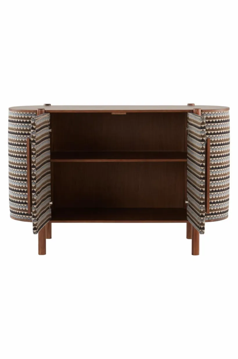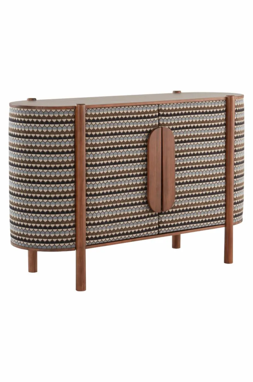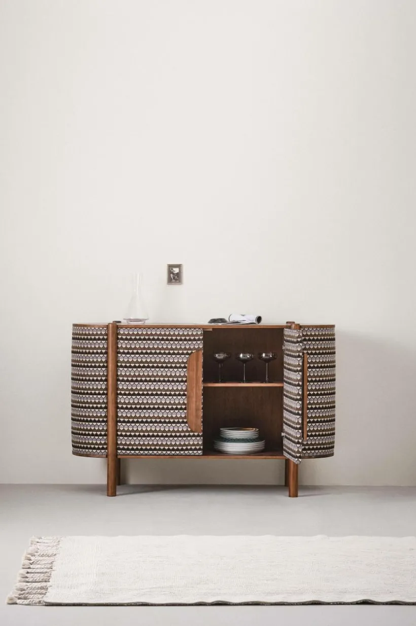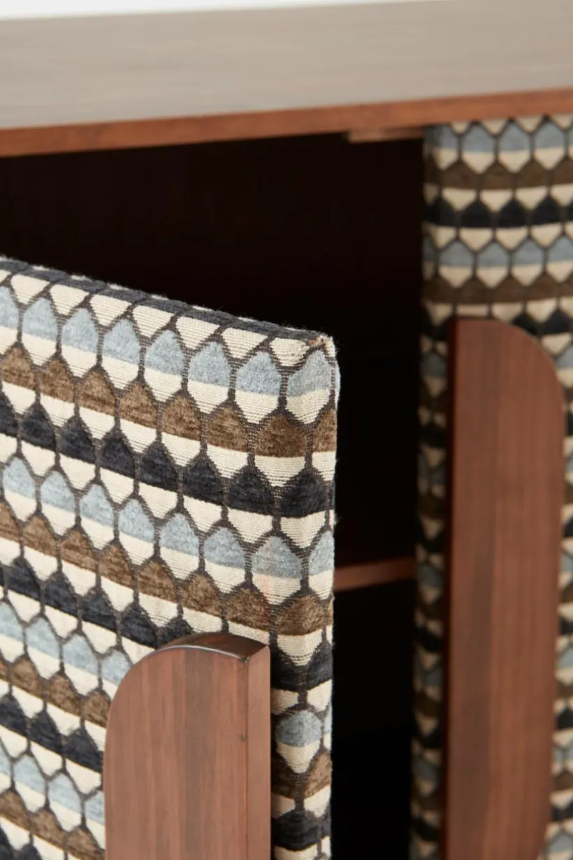 BLESSANO är ett mycket speciellt och stilfullt skåp. Träslaget är massiv furu som kombinerats med textilklädda sidor, tillsammans med rundade former är skåpet uppseendeväckande samtidigt som det har en mjuk framtoning. Tyget är otroligt detaljerat och fint, det har vävt mönster med horisontell randning i jordnära färger.