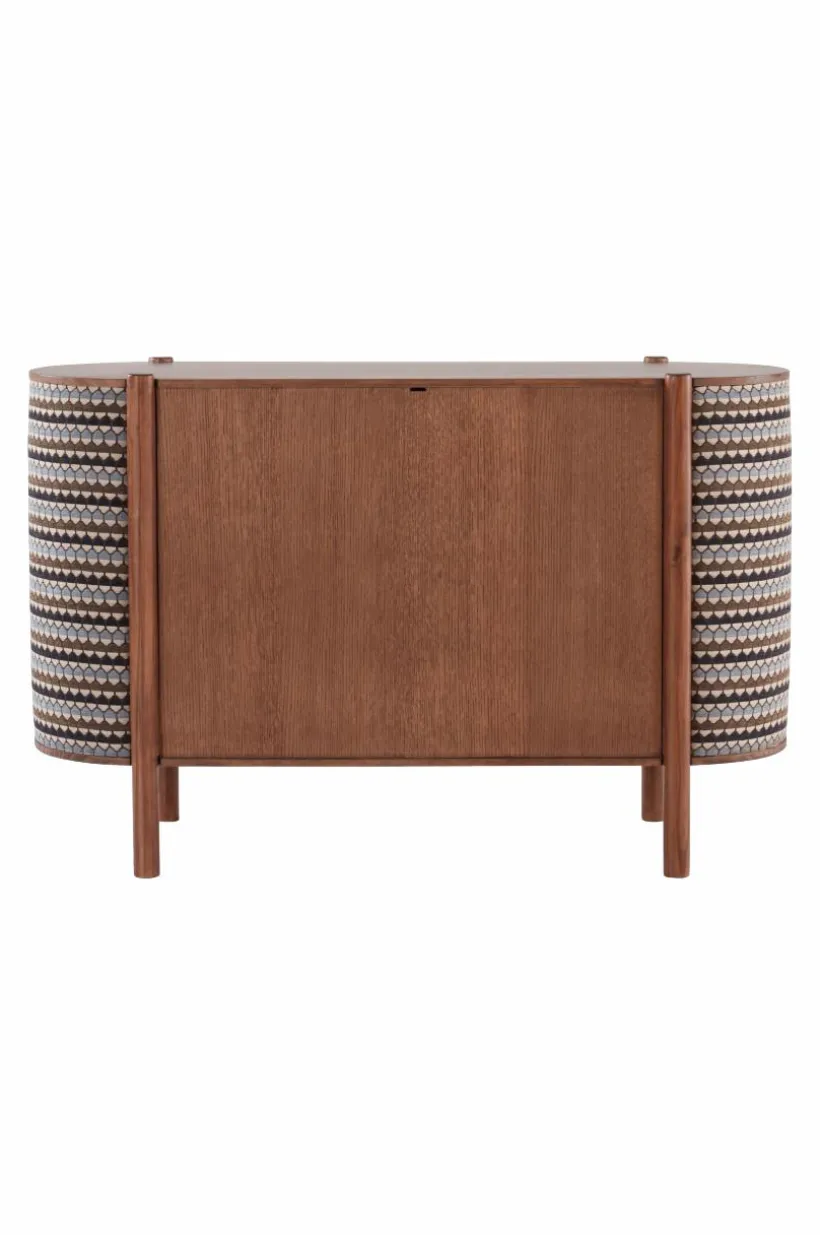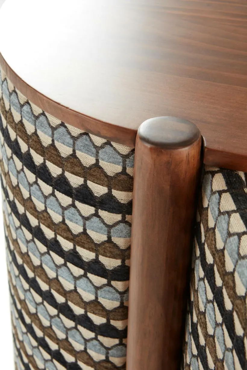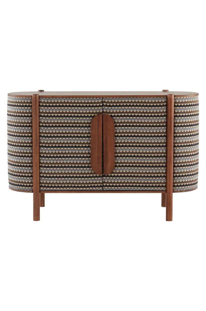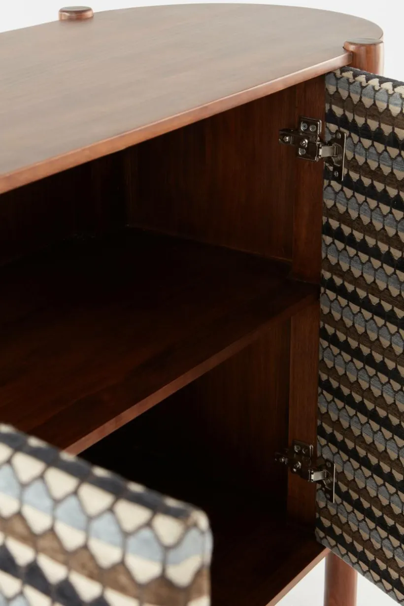 BLESSANO är ett mycket speciellt och stilfullt skåp. Träslaget är massiv furu som kombinerats med textilklädda sidor, tillsammans med rundade former är skåpet uppseendeväckande samtidigt som det har en mjuk framtoning. Tyget är otroligt detaljerat och fint, det har vävt mönster med horisontell randning i jordnära färger.