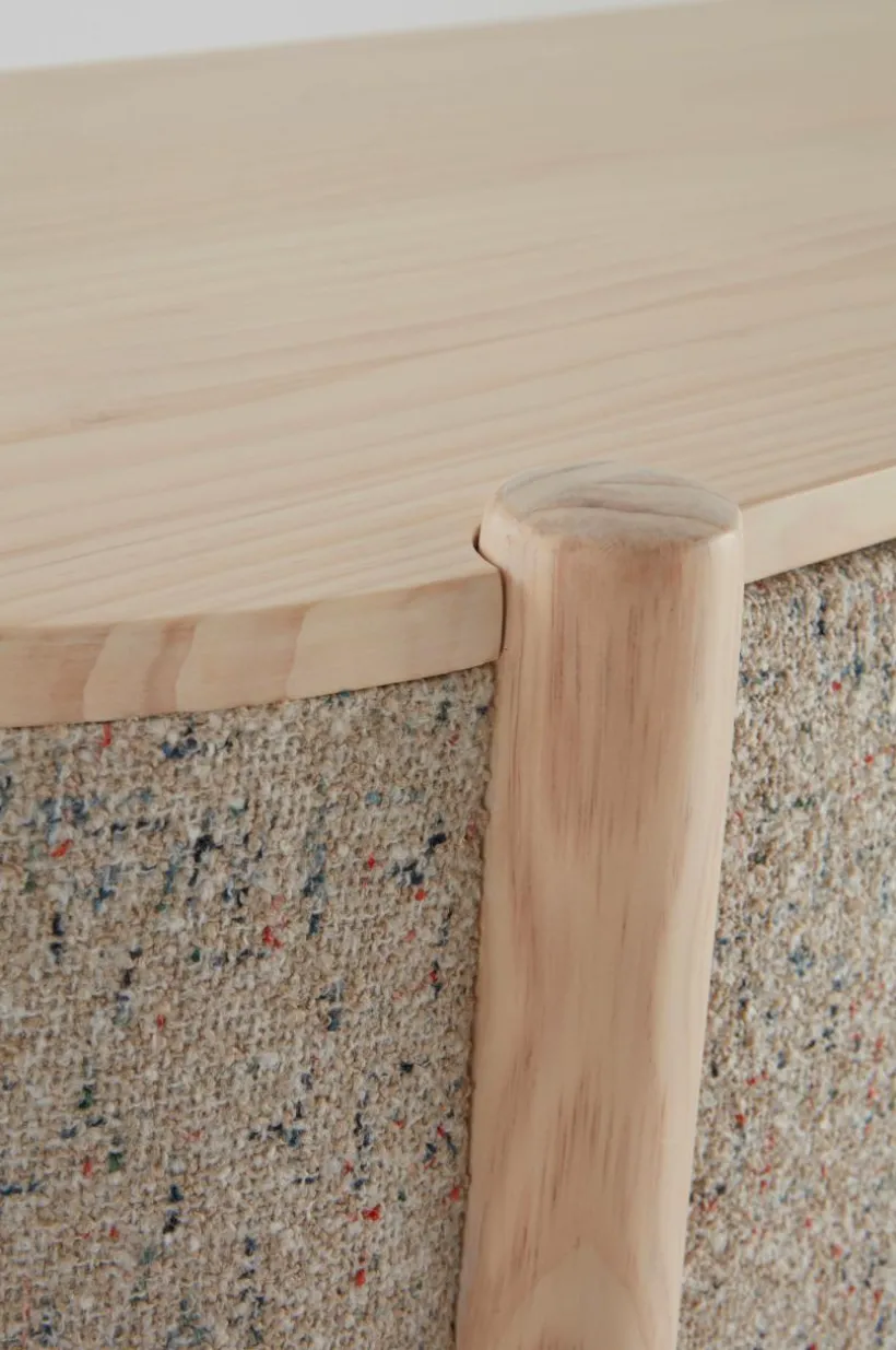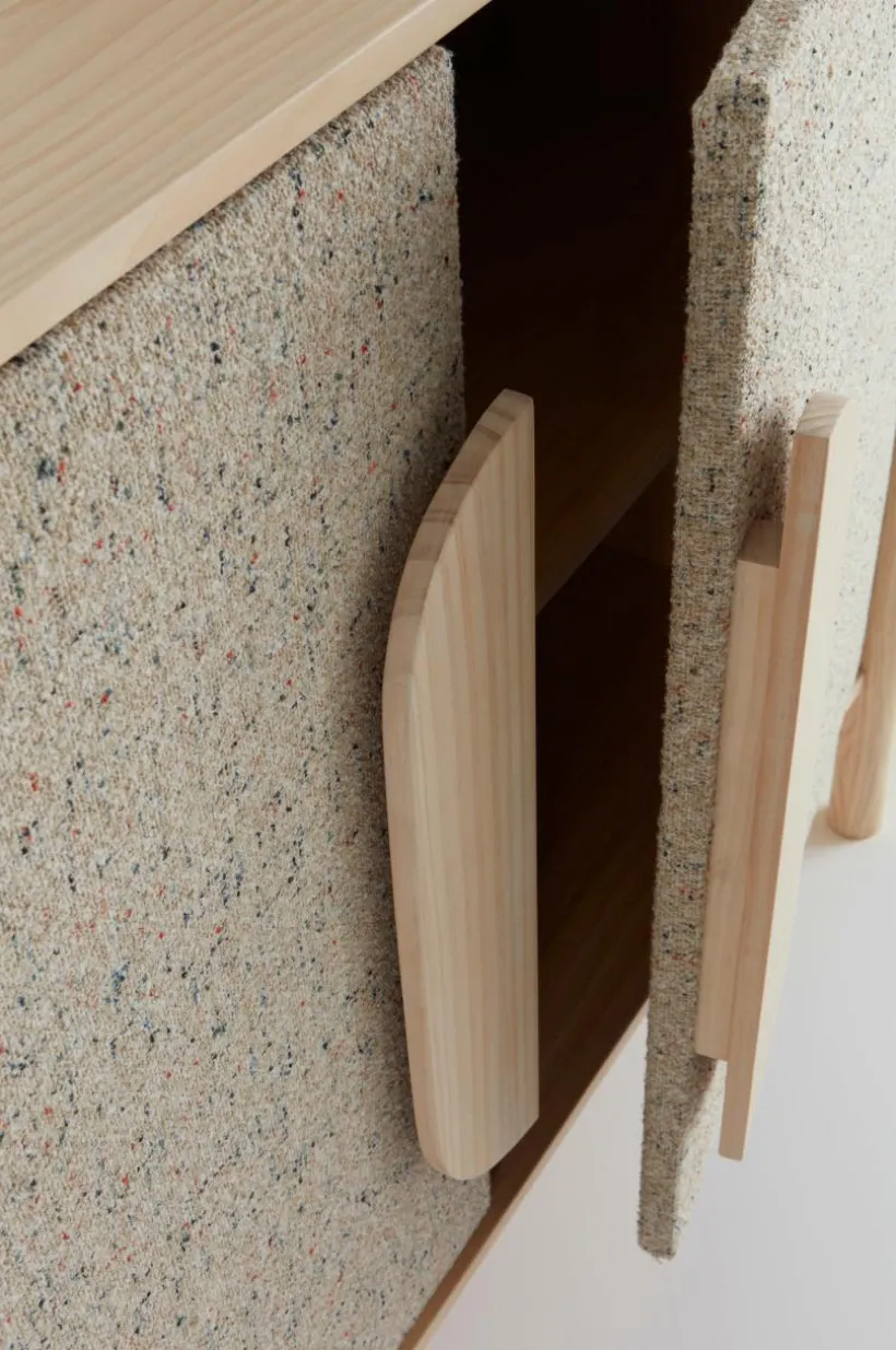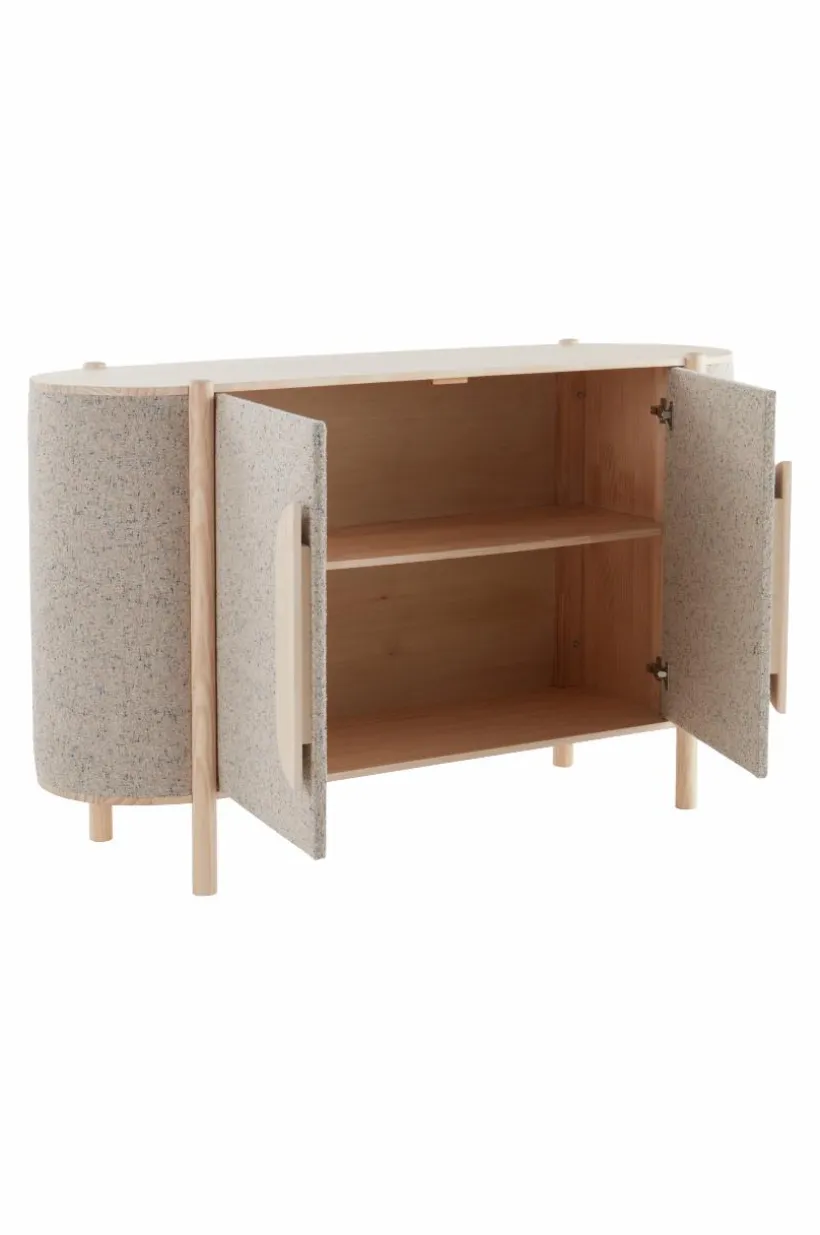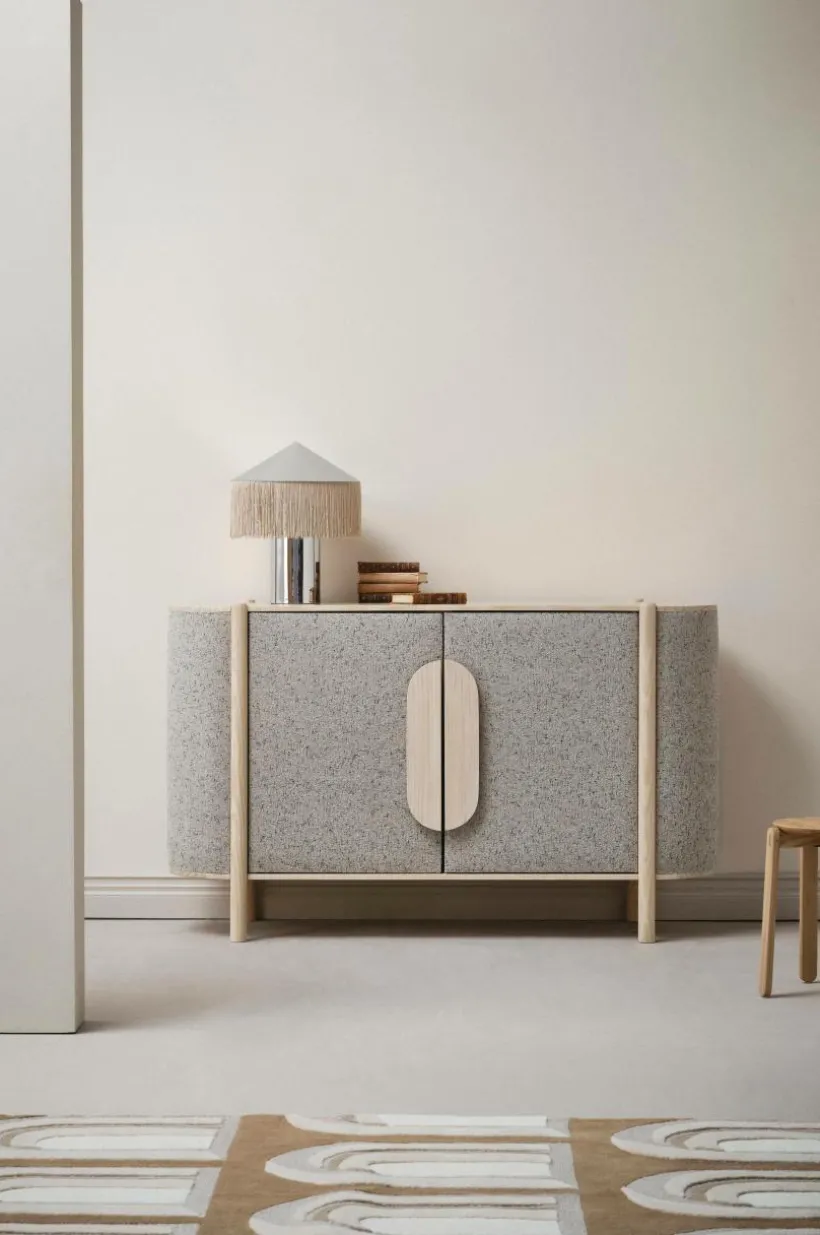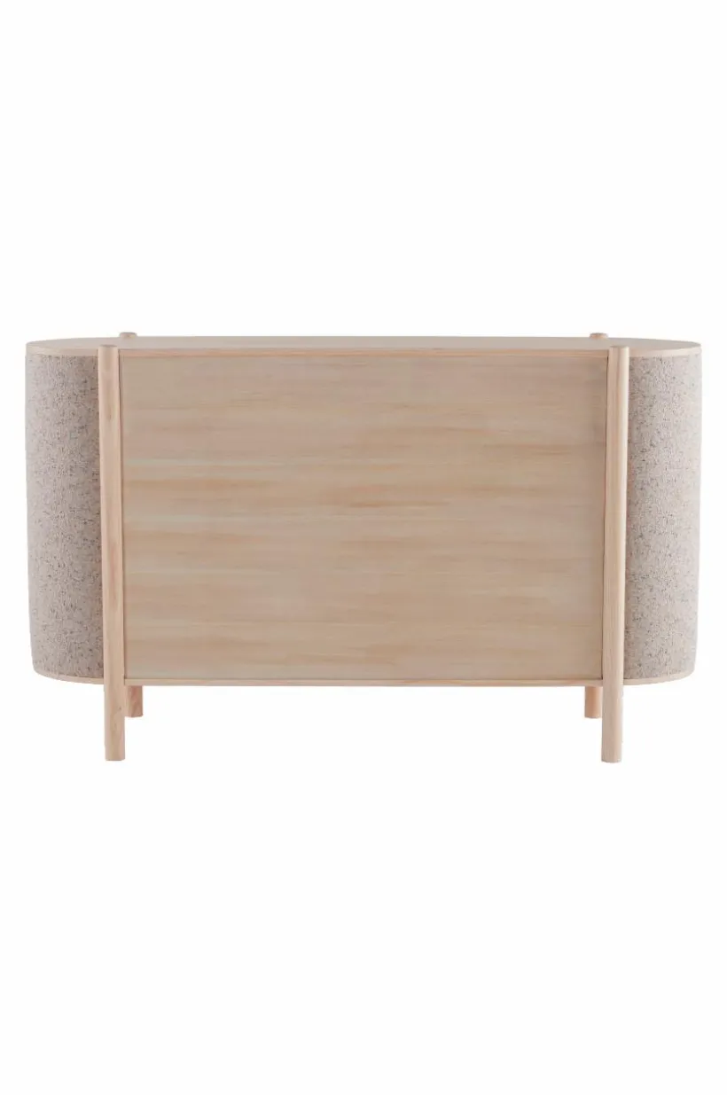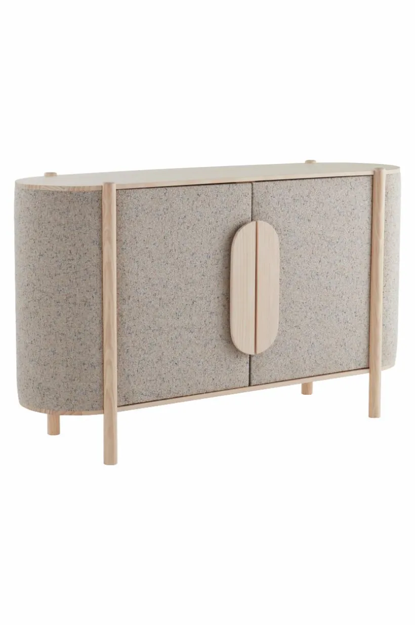 BLESSANO är ett mycket speciellt och stilfullt skåp. Träslaget är massiv furu som kombinerats med textilklädda sidor, tillsammans med rundade former är skåpet uppseendeväckande samtidigt som det har en mjuk framtoning. Tyget är en snygg bouclé med melerat mönster.