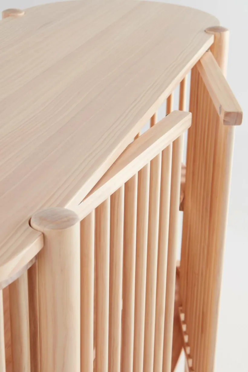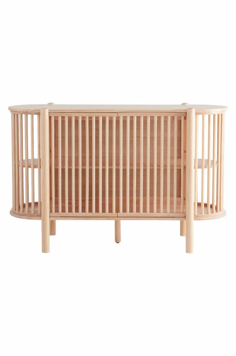 Storlek: Höjd 90 cm, bredd 140 cm, djup 50 cm. Frihöjd under möbel: 19 cm. Ribbor ø 9 cm.