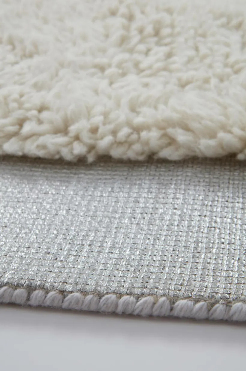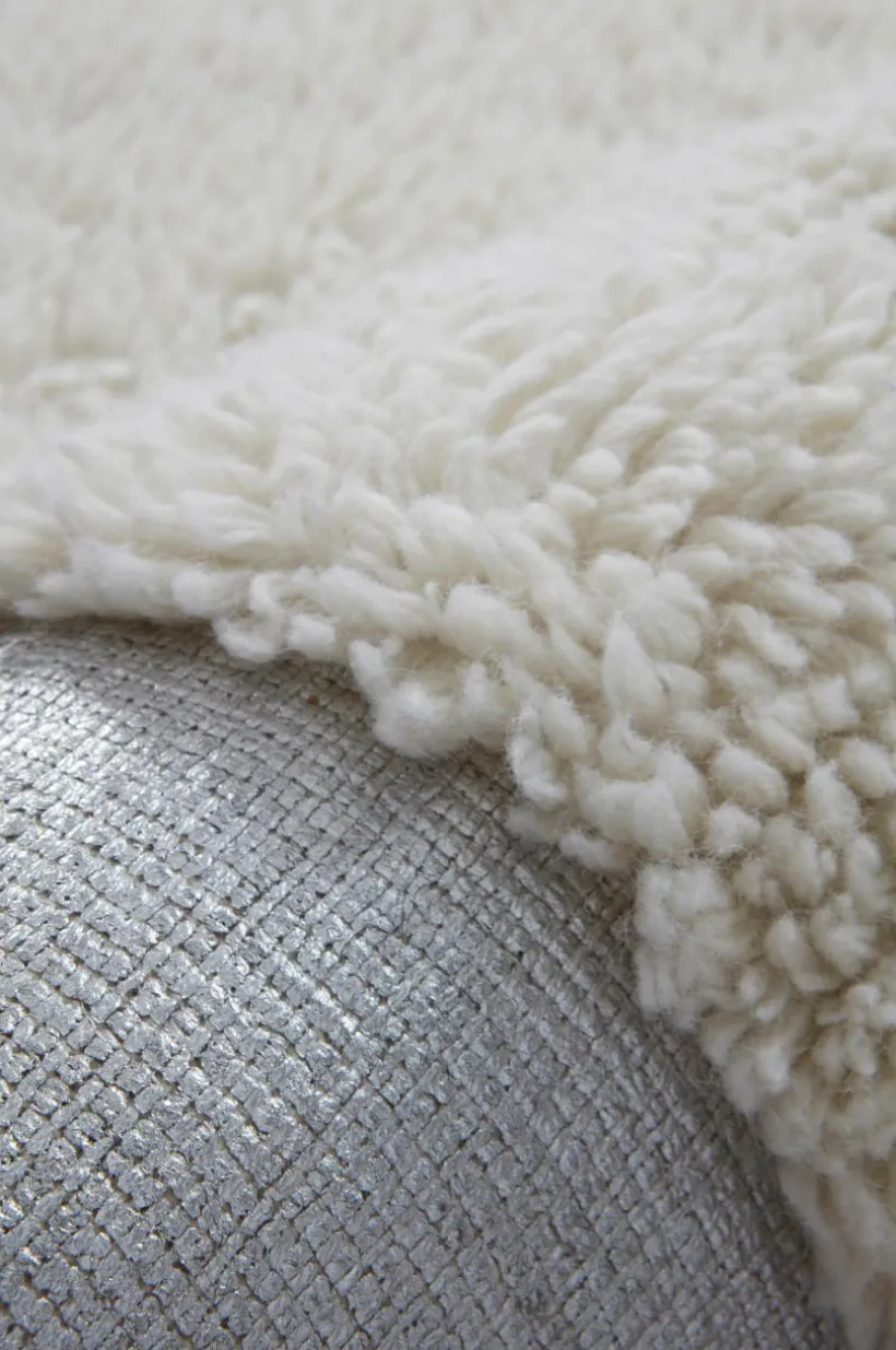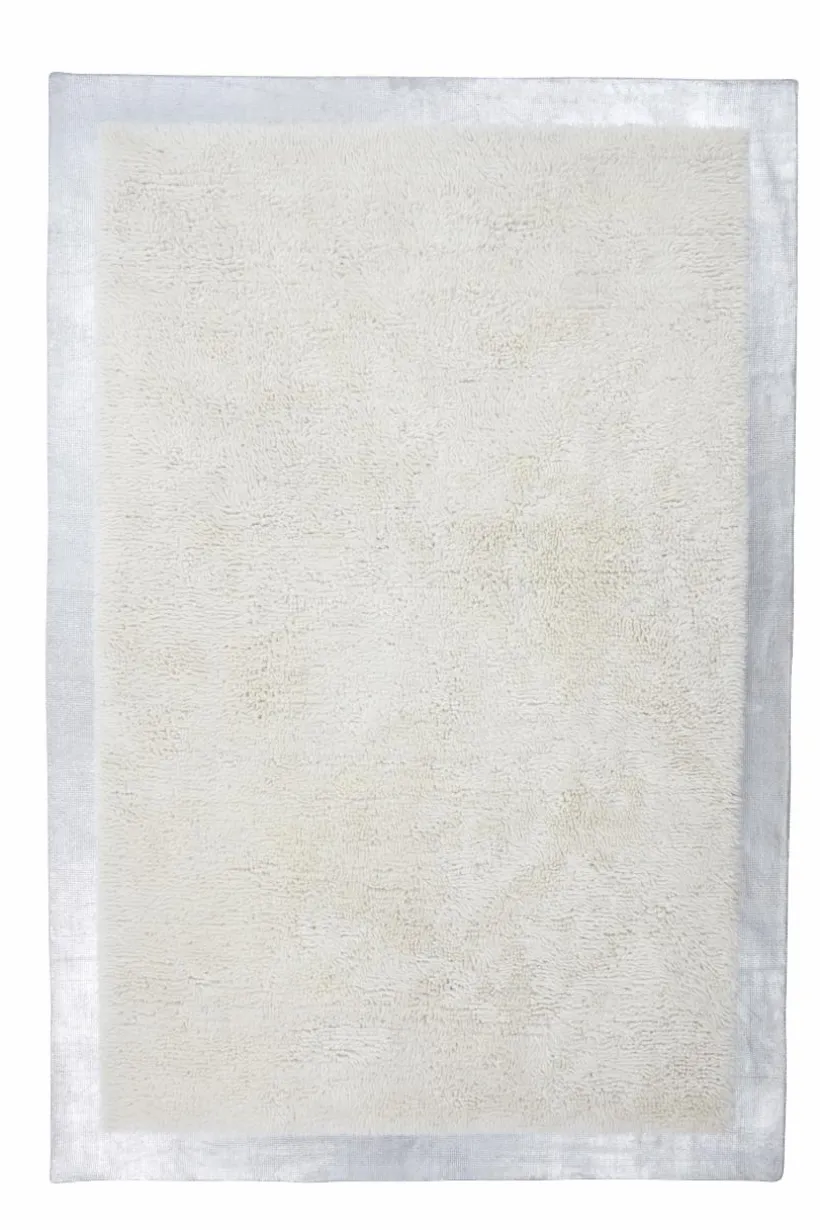 BOB är en handtuftad ullmatta i uppseendeväckande snygg modell med en bred silverfärgad bård runt om den tuftade delen. Bården är färgad i silverfärg och kommer att få patina och åldras på ett snyggt slitet sätt. En kraftig, laskad kant är sydd runt om den silverfärgade bården. Luggen är tät och mjuk och värmer skönt eftersom det är äkta ull. Ull är naturligt värmande och ett behagligt och lättskött material i en matta. Ull är naturligt smutsavvisande, mycket praktiskt. Tjocklek bård runt om 1-1,2 cm. Tjocklek delen med lugg 2,4-2,6 cm. 3200-3400 g/m².