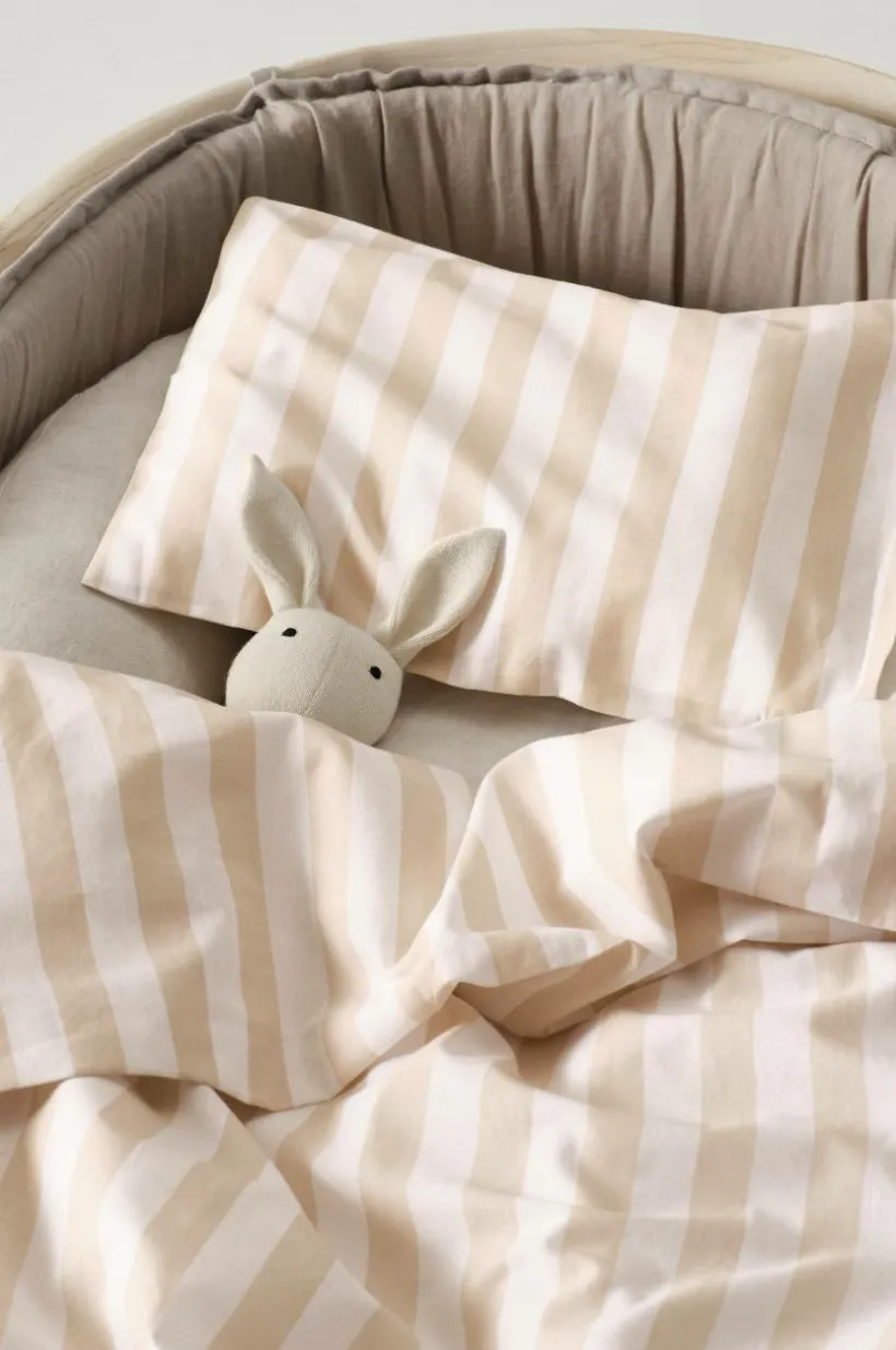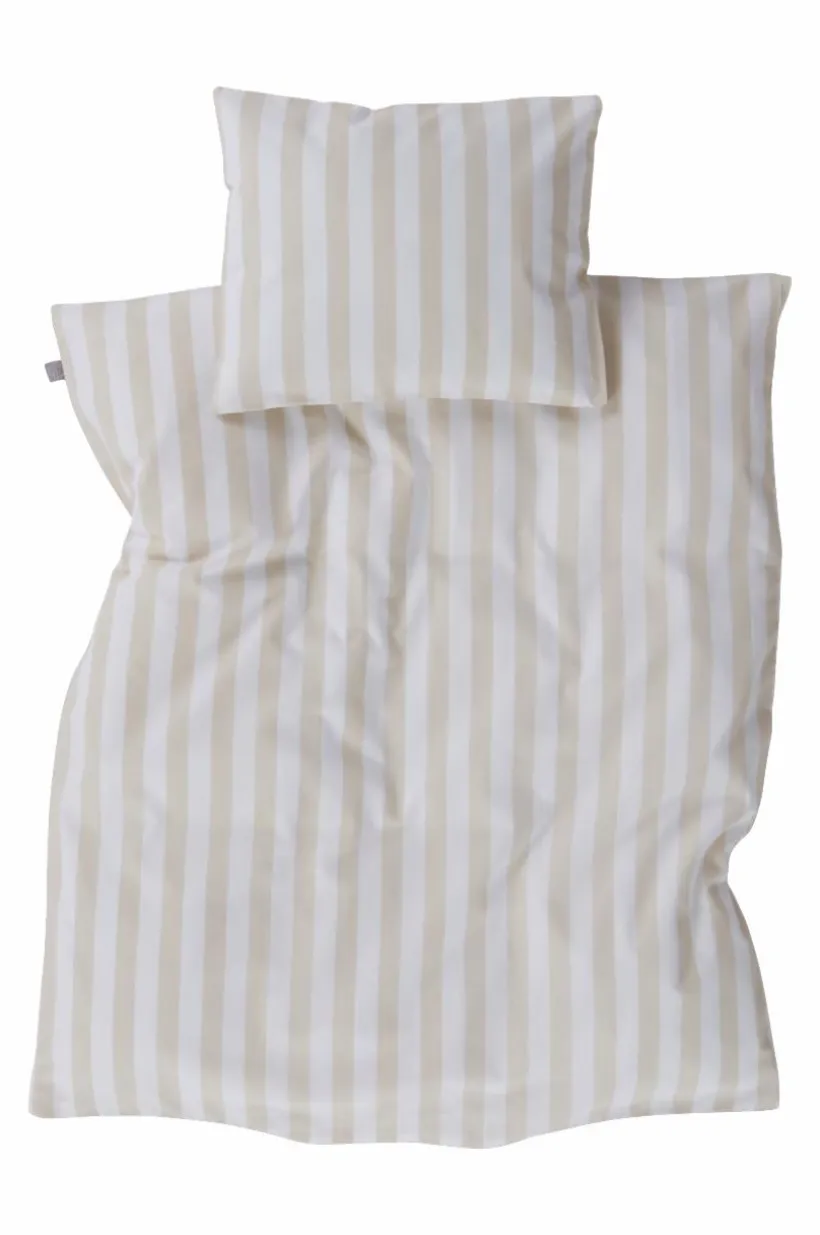 Smalrandigt påslakanset med ett påslakan och ett örngott i ekologisk bomull. Setet passar till barnvagn och vagga. Tyget har ett behagligt tryck, bomull är svalt och skönt mot huden. Randmönstret är tryckt i klara, glada färger mixat med varannan rand vit. De klassiska ränderna fungerar lika bra till liten som stor. Trådtäthet på 144 tc. (Trådtätheten talar om antalet trådar, thread counts, per kvadrattum i ett tyg. Ju högre trådtäthet desto högre kvalité.)