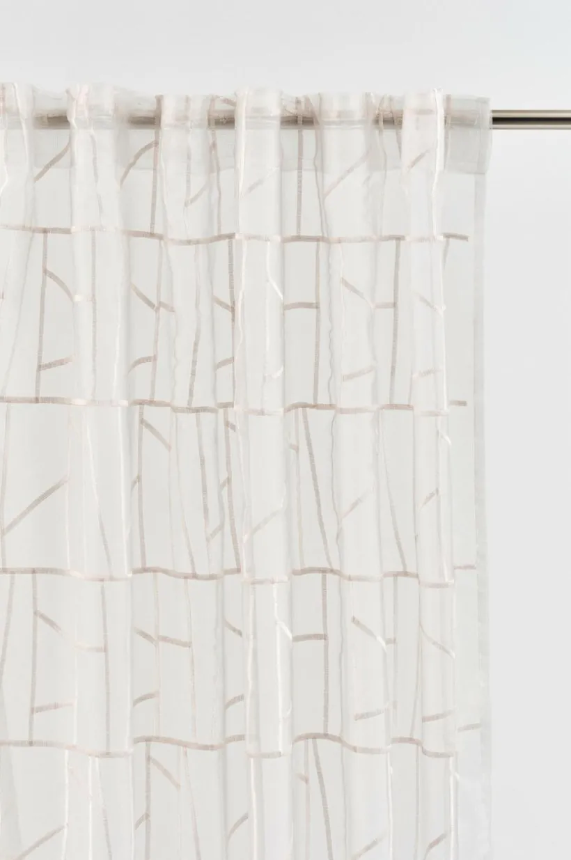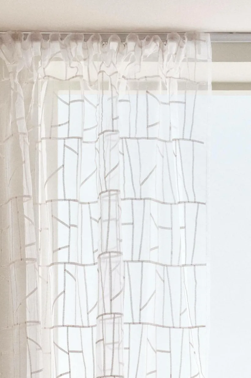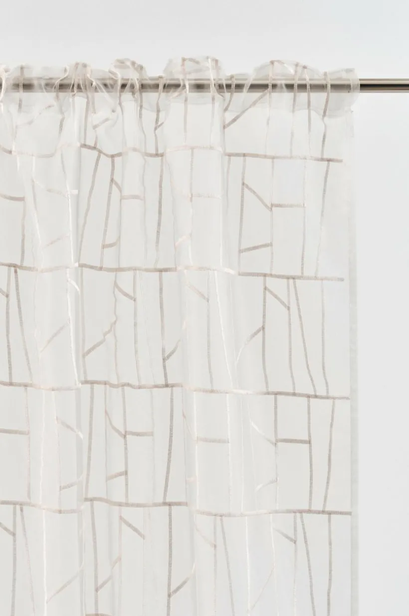En gardinlängd i organza av polyester och polyamid med broderat, oregelbundet nätmönster. Mönstret har inspirerats av bojagi som är koreansk lappteknik. Den skira längden har påsytt multifunktionsband och kan hängas upp med fingerkrokar, kanal samt dold hälla.