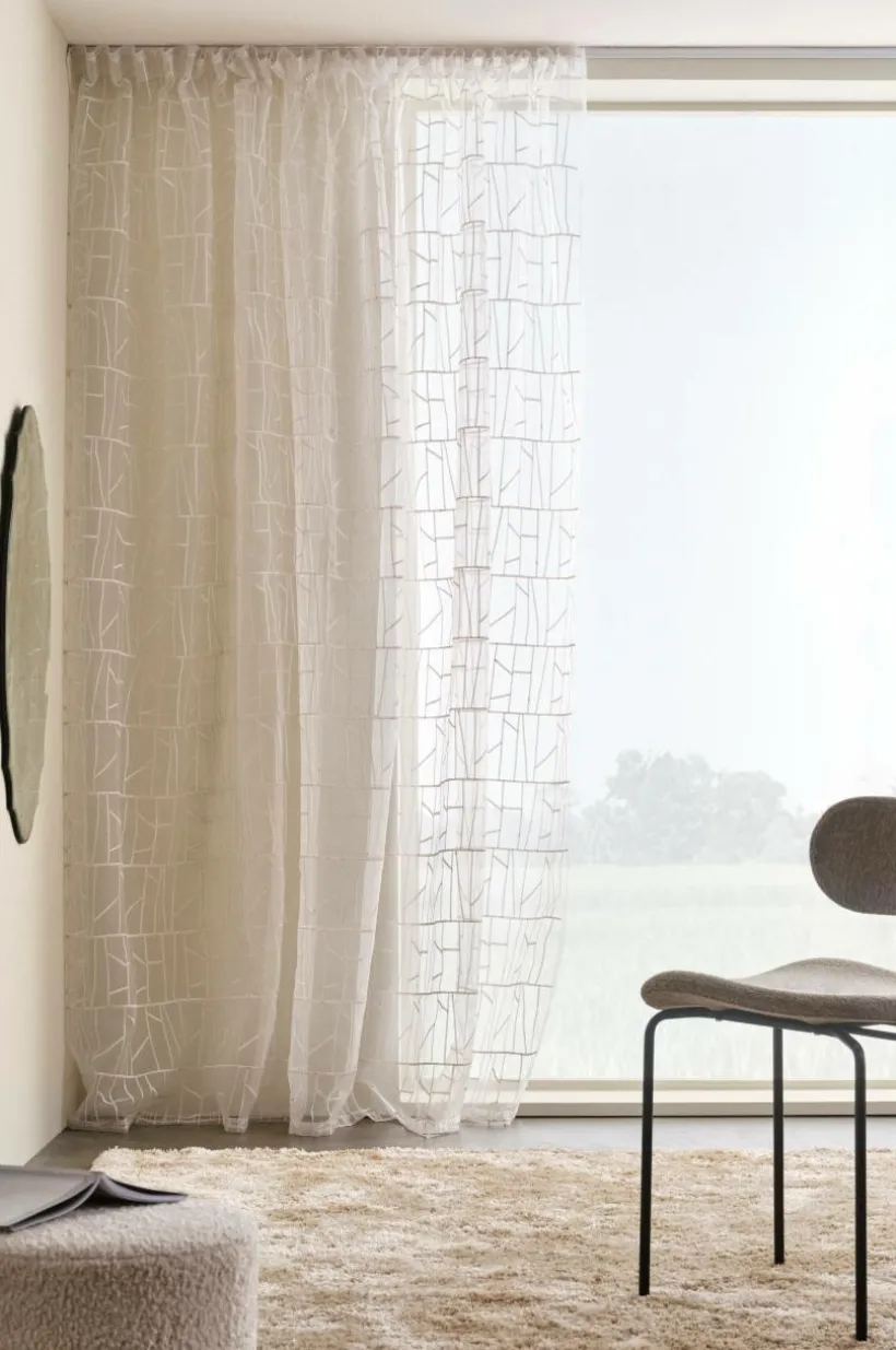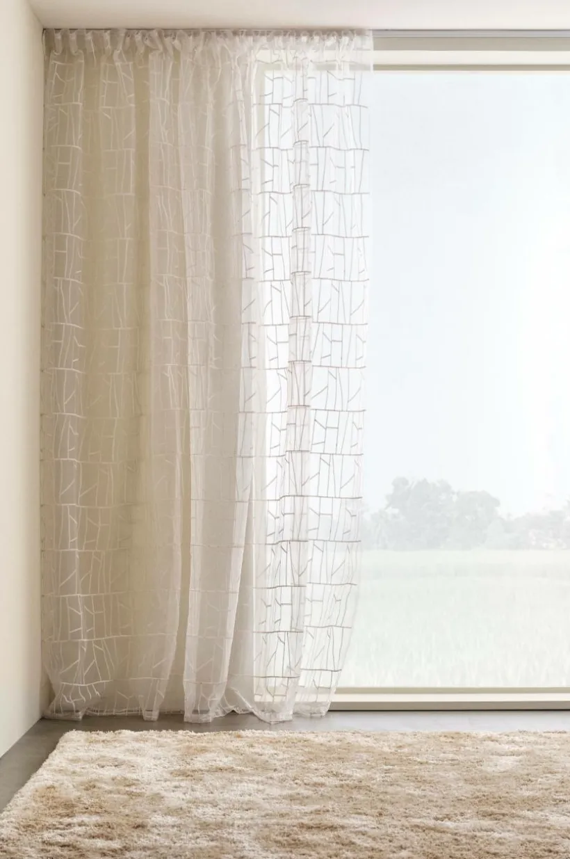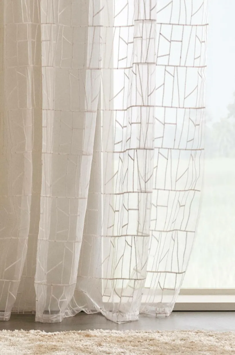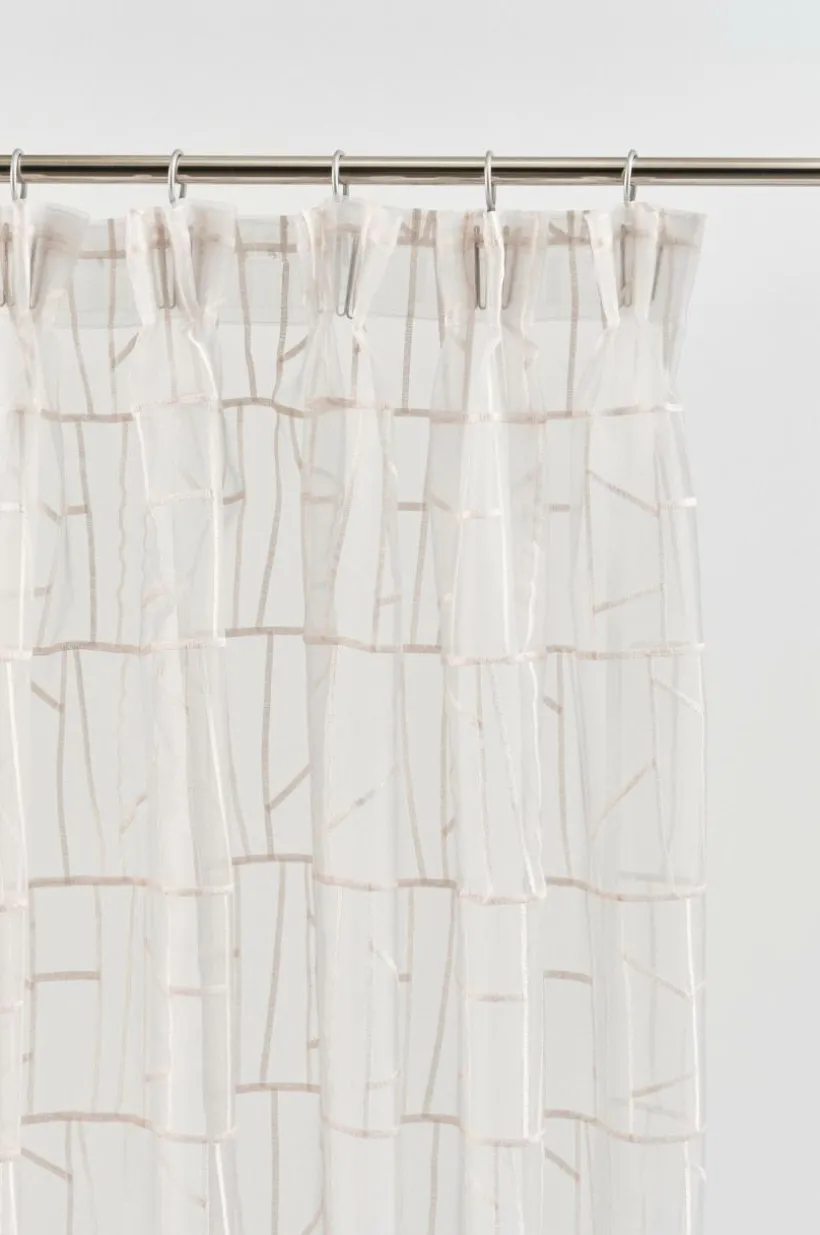 En gardinlängd i organza av polyester och polyamid med broderat, oregelbundet nätmönster. Mönstret har inspirerats av bojagi som är koreansk lappteknik. Den skira längden har påsytt multifunktionsband och kan hängas upp med fingerkrokar, kanal samt dold hälla.