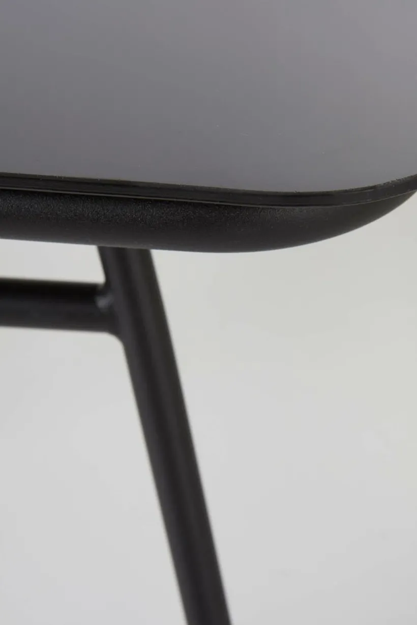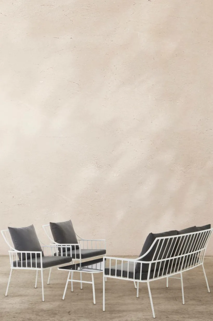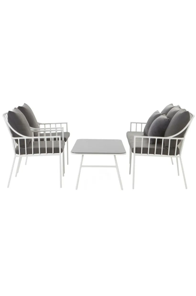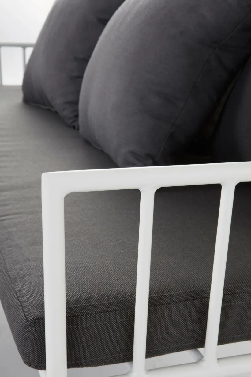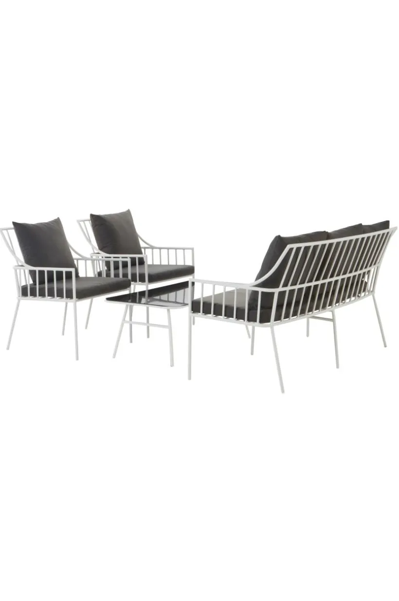 Loungemöbel i fyra delar av pulverlackerad aluminium med matt yta som inte bländar i solskenet. Loungegruppen innehåller ett soffbord, två fåtöljer, en soffa samt kuddar och sittdynor. Fåtöljerna och soffan har sittdynor och kuddar med klädsel av polyester och foam av skumplastgummi. Bordet har bordsskiva av svart glas.