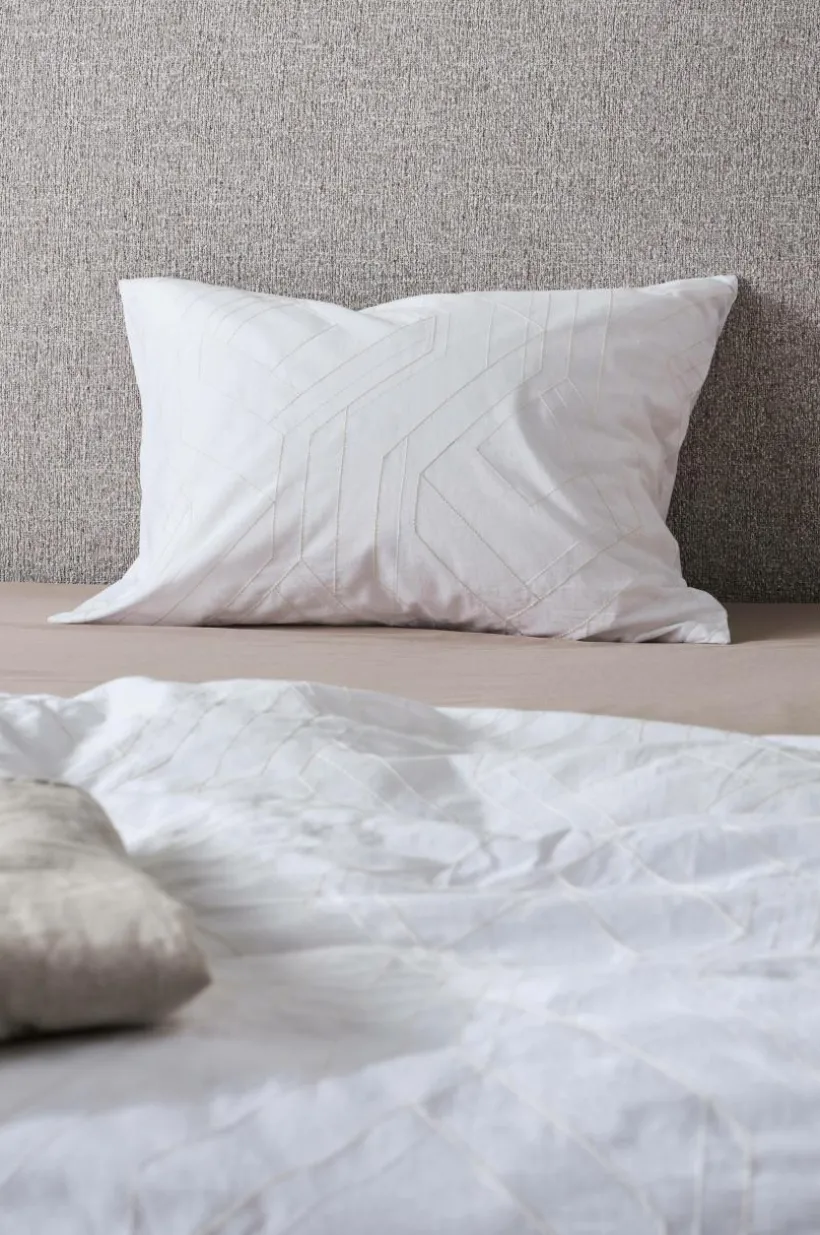 Örngott i behaglig bomull. Örngottet har broderat mönster med tunn tråd i närliggande färg som ger ett fint, diskret mönster. Baksidan är enfärgad i samma tyg som framsidan. Bomull är behagligt att sova i, upplevs svalt och mjukt mot huden. Dragkedja för tillslutning. Trådtäthet på 144 tc. (Trådtätheten talar om antalet trådar, thread counts, per kvadrattum i ett tyg. Ju högre trådtäthet desto högre kvalité.)
