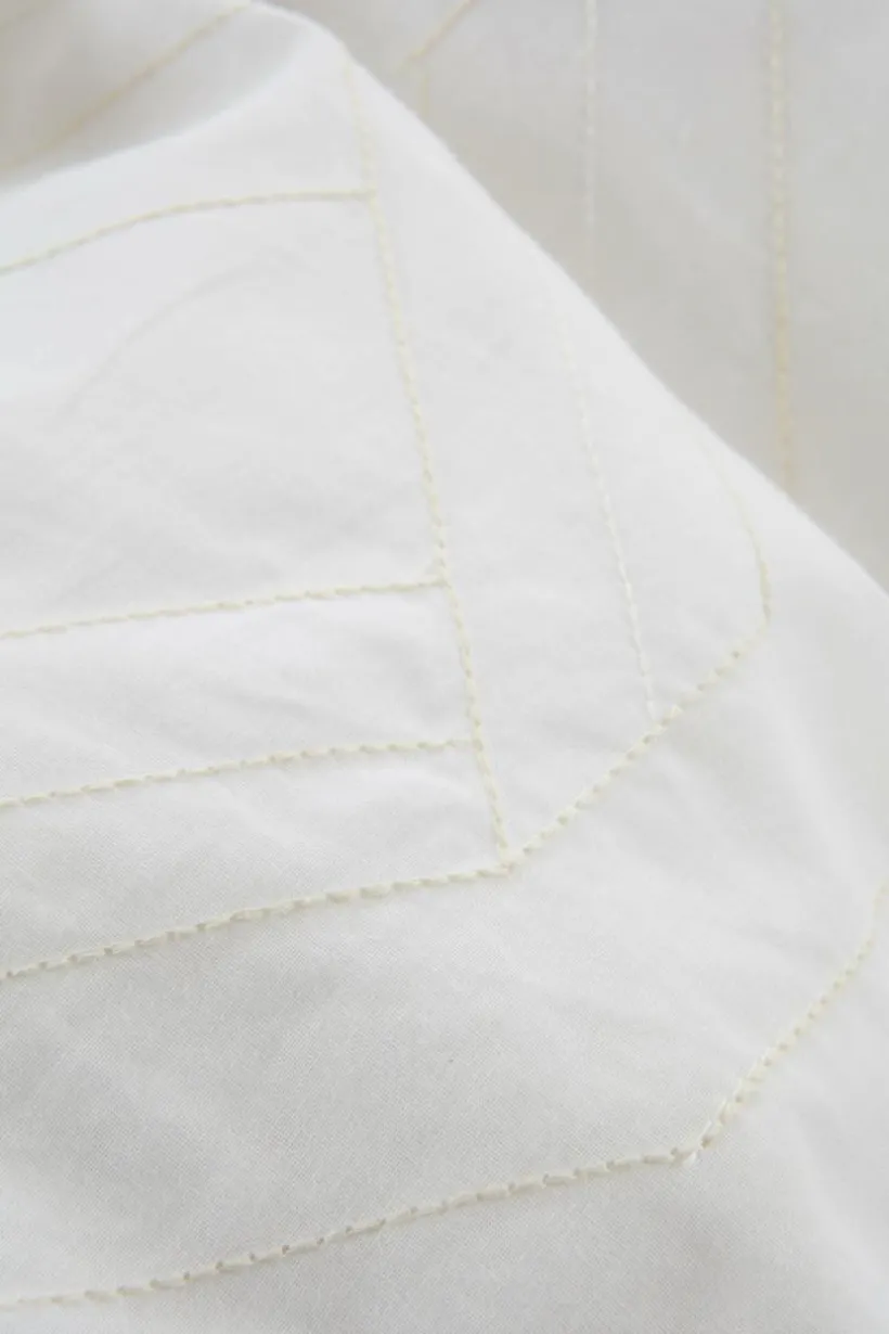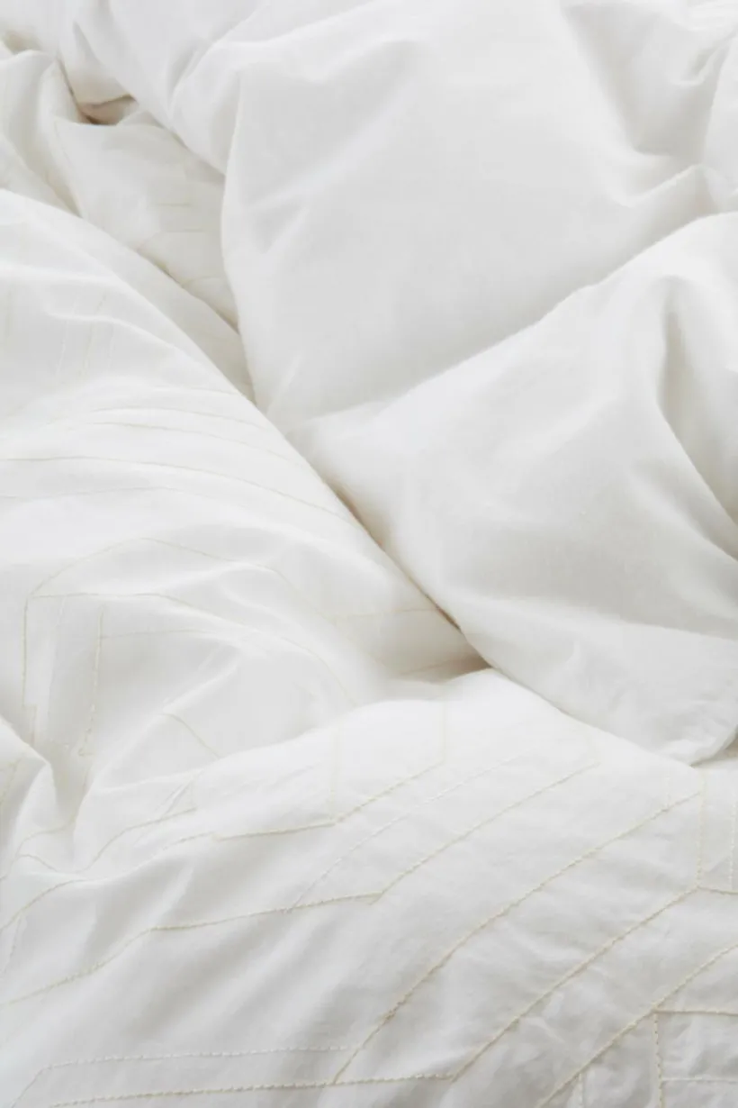 Påslakanset i 3 delar i behaglig bomull. Både påslakan och örngott har broderat mönster med tunn tråd i närliggande färg som ger ett fint, diskret mönster. Baksidan är enfärgad i samma tyg som framsidan. Bomull är behagligt att sova i, upplevs svalt och mjukt mot huden. Öppning i övre hörnen på påslakanet, som underlättar att trä påslakanet över täcket. Dragkedja för tillslutning. Trådtäthet på 144 tc. (Trådtätheten talar om antalet trådar, thread counts, per kvadrattum i ett tyg. Ju högre trådtäthet desto högre kvalité.)