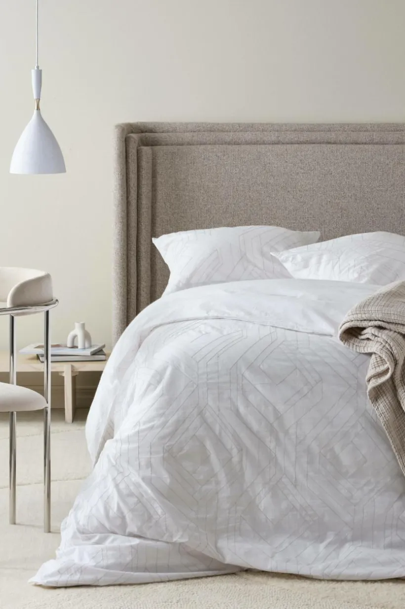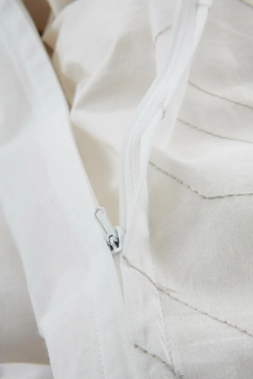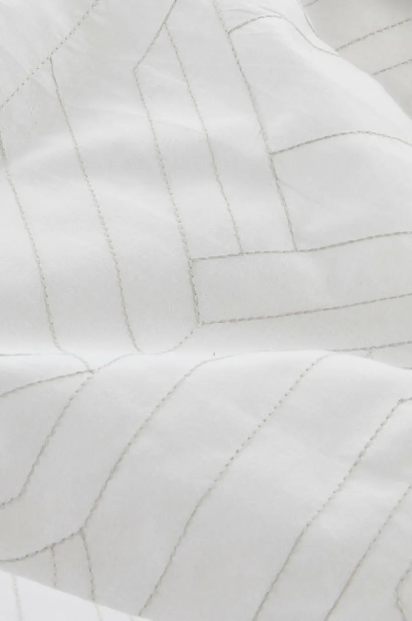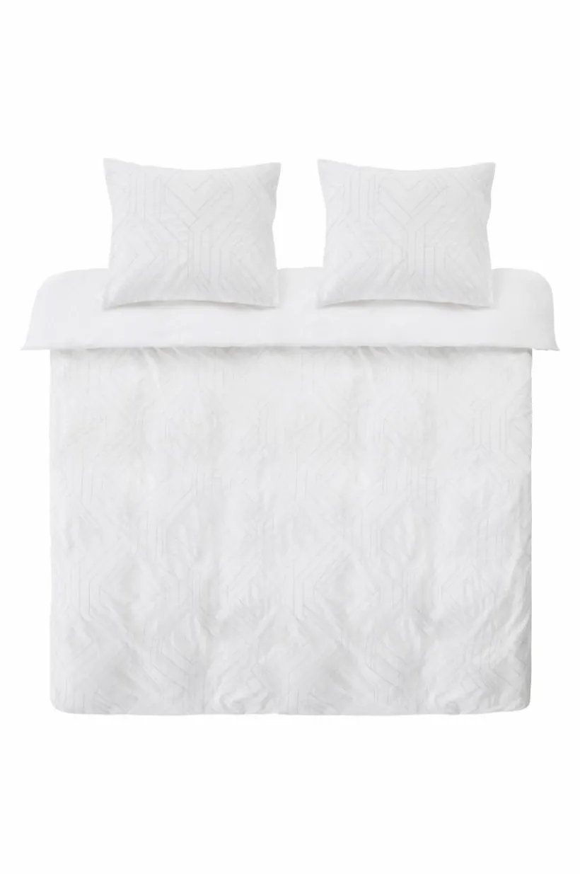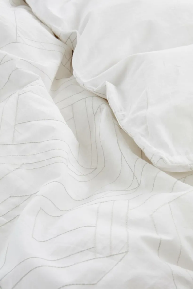 Påslakanset i 3 delar i behaglig bomull. Både påslakan och örngott har broderat mönster med tunn tråd i närliggande färg som ger ett fint, diskret mönster. Baksidan är enfärgad i samma tyg som framsidan. Bomull är behagligt att sova i, upplevs svalt och mjukt mot huden. Öppning i övre hörnen på påslakanet, som underlättar att trä påslakanet över täcket. Dragkedja för tillslutning. Trådtäthet på 144 tc. (Trådtätheten talar om antalet trådar, thread counts, per kvadrattum i ett tyg. Ju högre trådtäthet desto högre kvalité.)