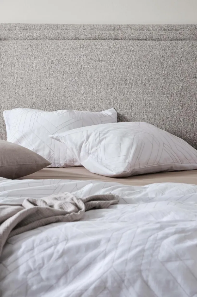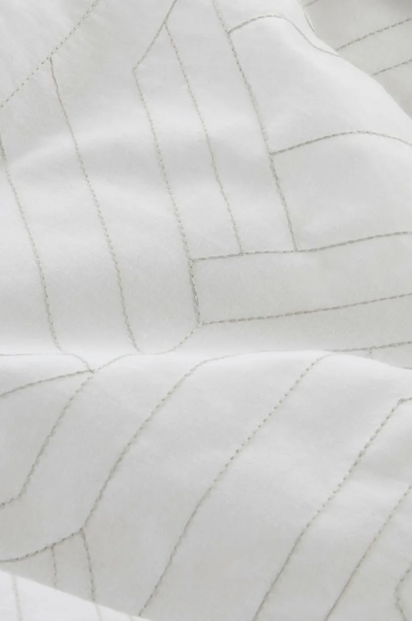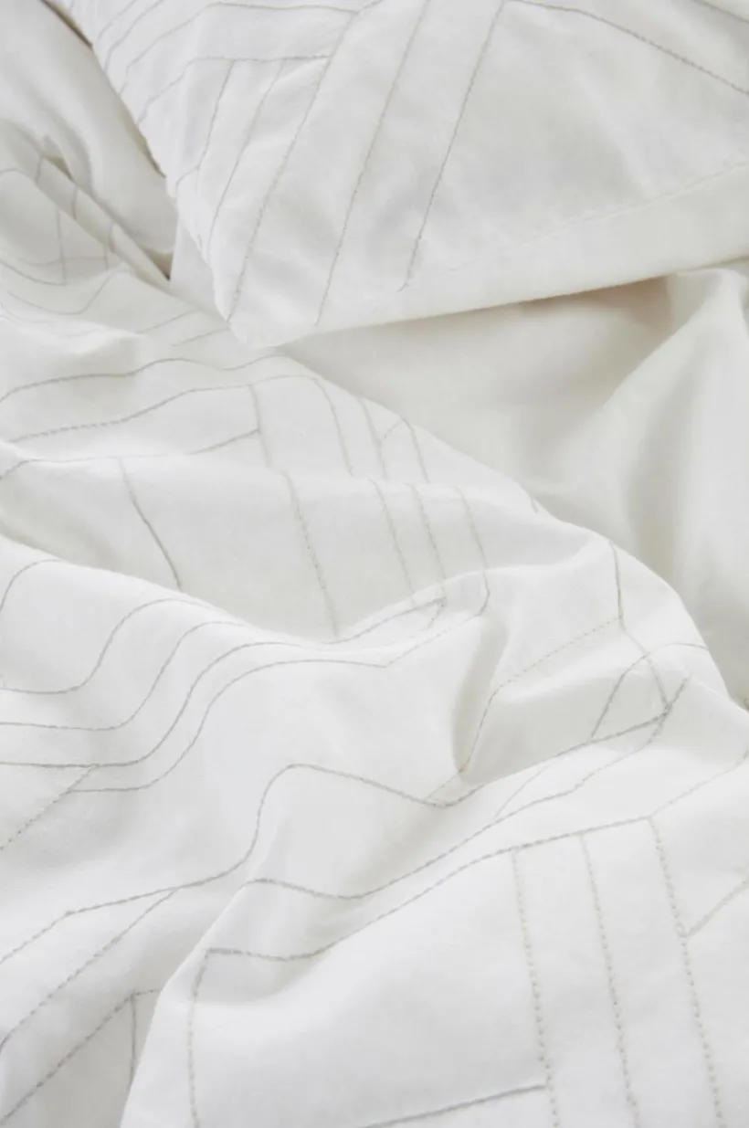 Påslakanset i 2 delar i behaglig bomull. Både påslakan och örngott har broderat mönster med tunn tråd i närliggande färg som ger ett fint, diskret mönster. Baksidan är enfärgad i samma tyg som framsidan. Bomull är behagligt att sova i, upplevs svalt och mjukt mot huden. Öppning i övre hörnen på påslakanet, som underlättar att trä påslakanet över täcket. Dragkedja för tillslutning. Trådtäthet på 144 tc. (Trådtätheten talar om antalet trådar, thread counts, per kvadrattum i ett tyg. Ju högre trådtäthet desto högre kvalité.)