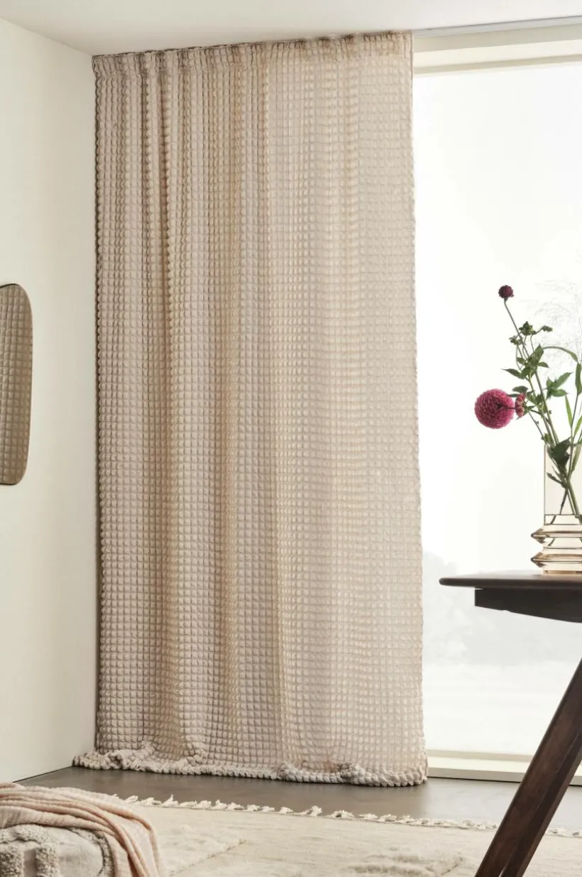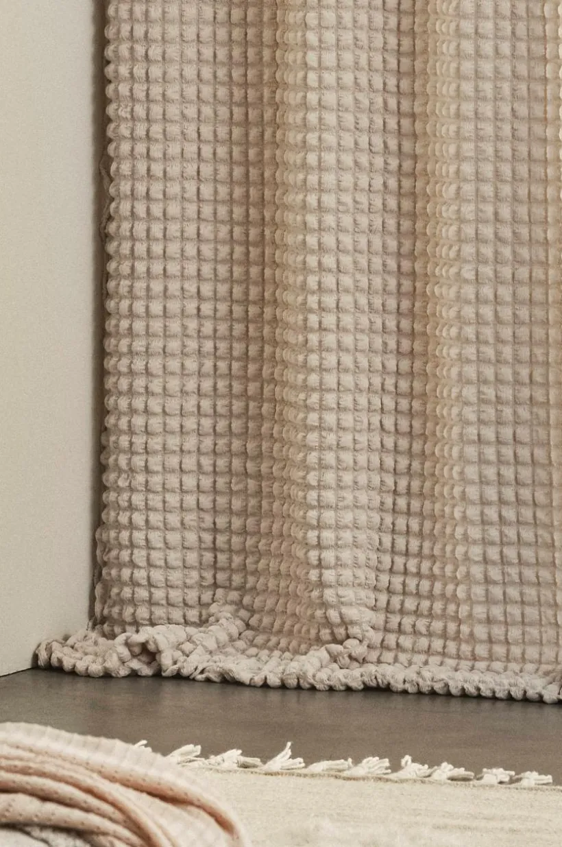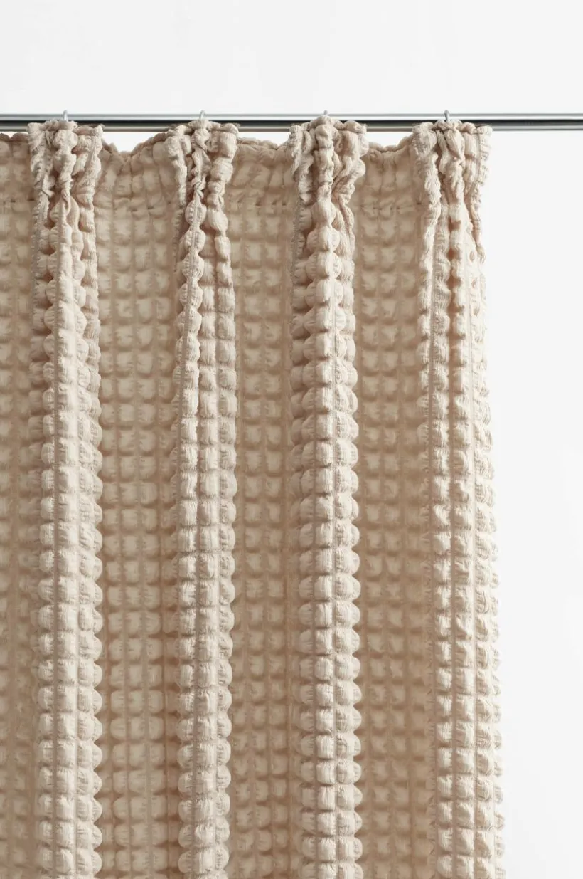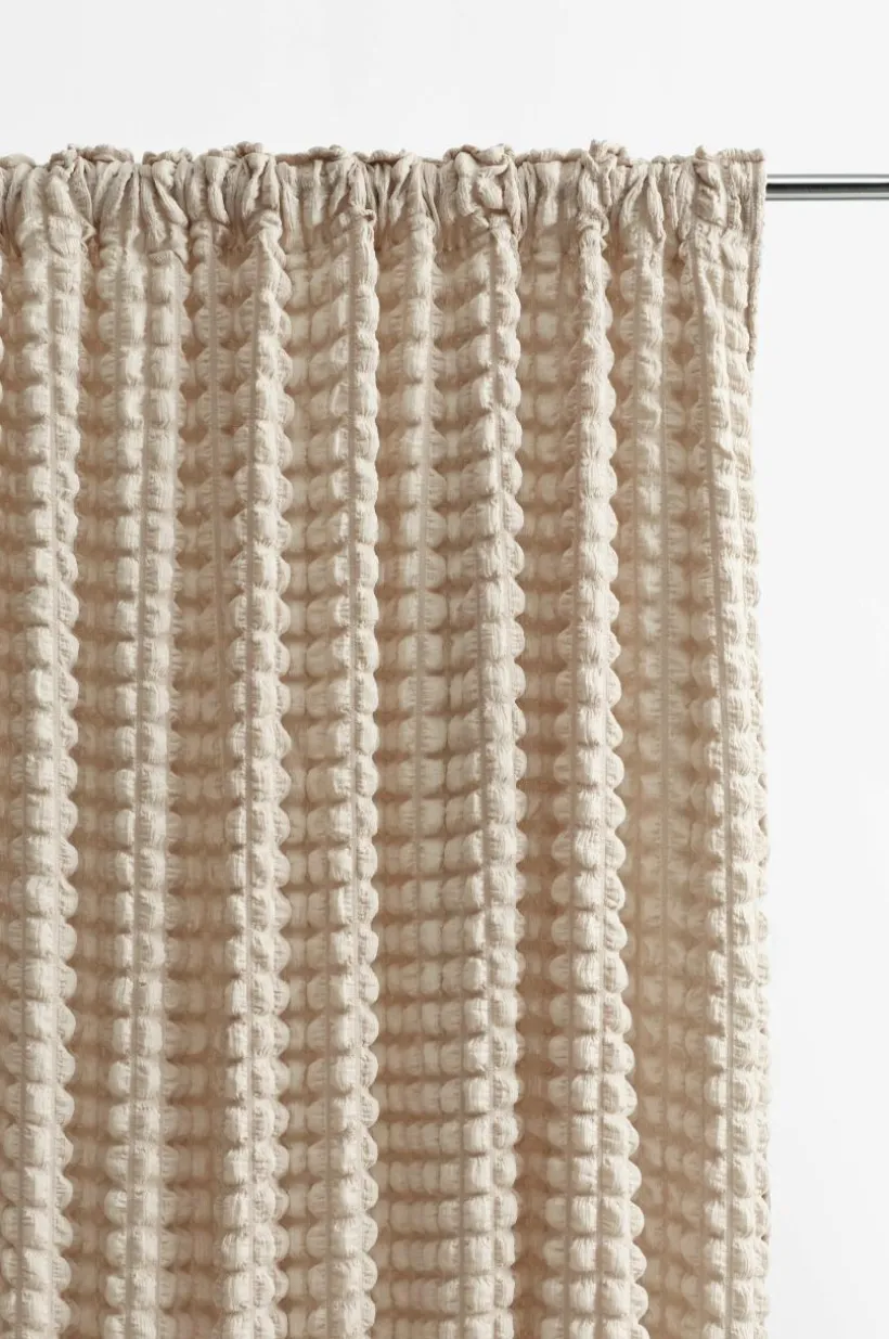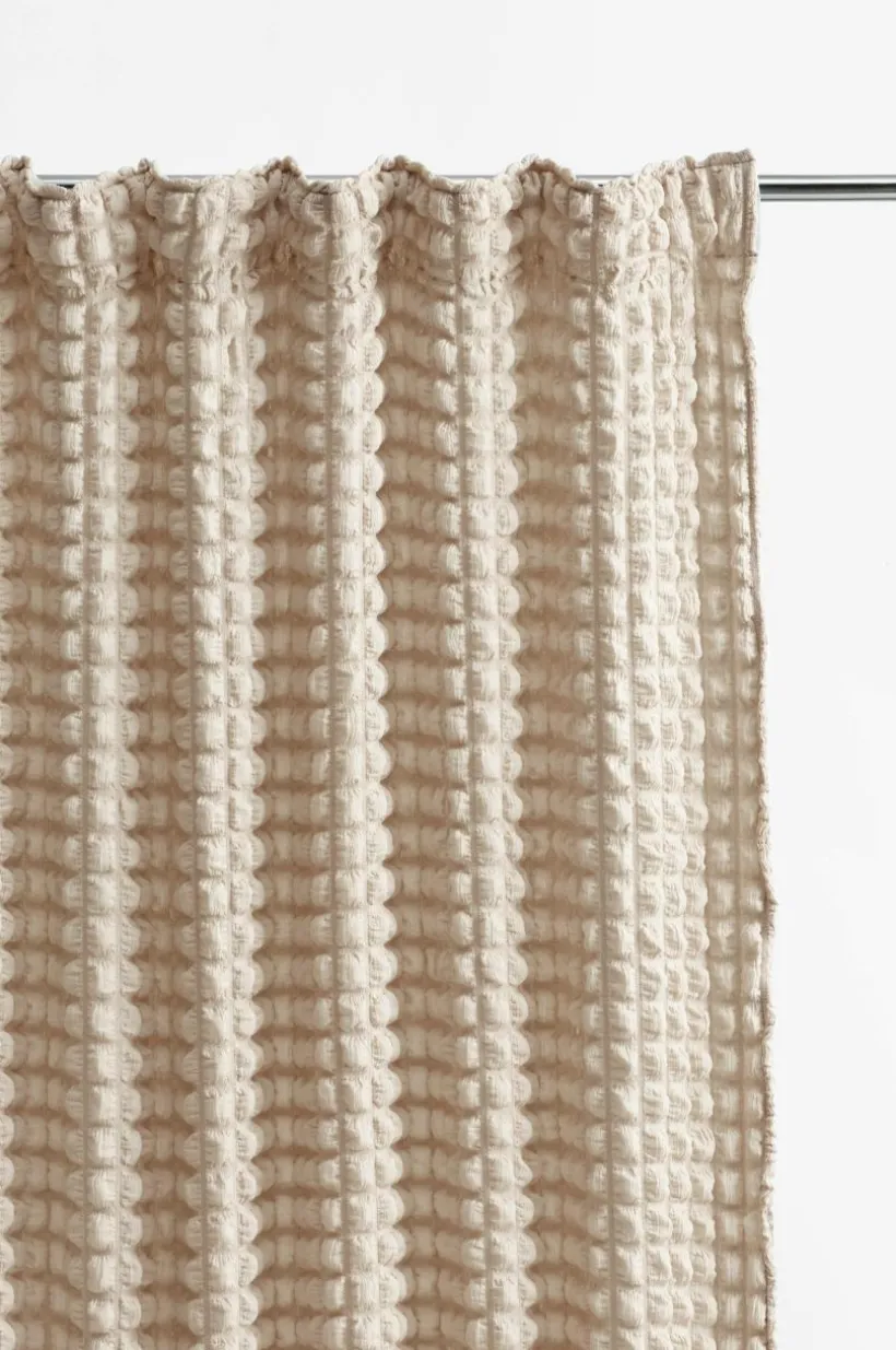 En gardinlängd i ett bubbligt, uppseendeväckande tyg av polyester med inblandning av spandex. Kvalitén i kombination med vävtekniken ger tyget sin läckra effekt, det har mjuka bubblor och det är dessutom elastiskt. Overlocksöm i nederkant. Längden har påsytt multifunktionsband och kan hängas upp med fingerkrokar, kanal samt dold hälla.