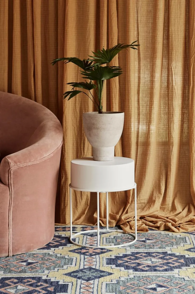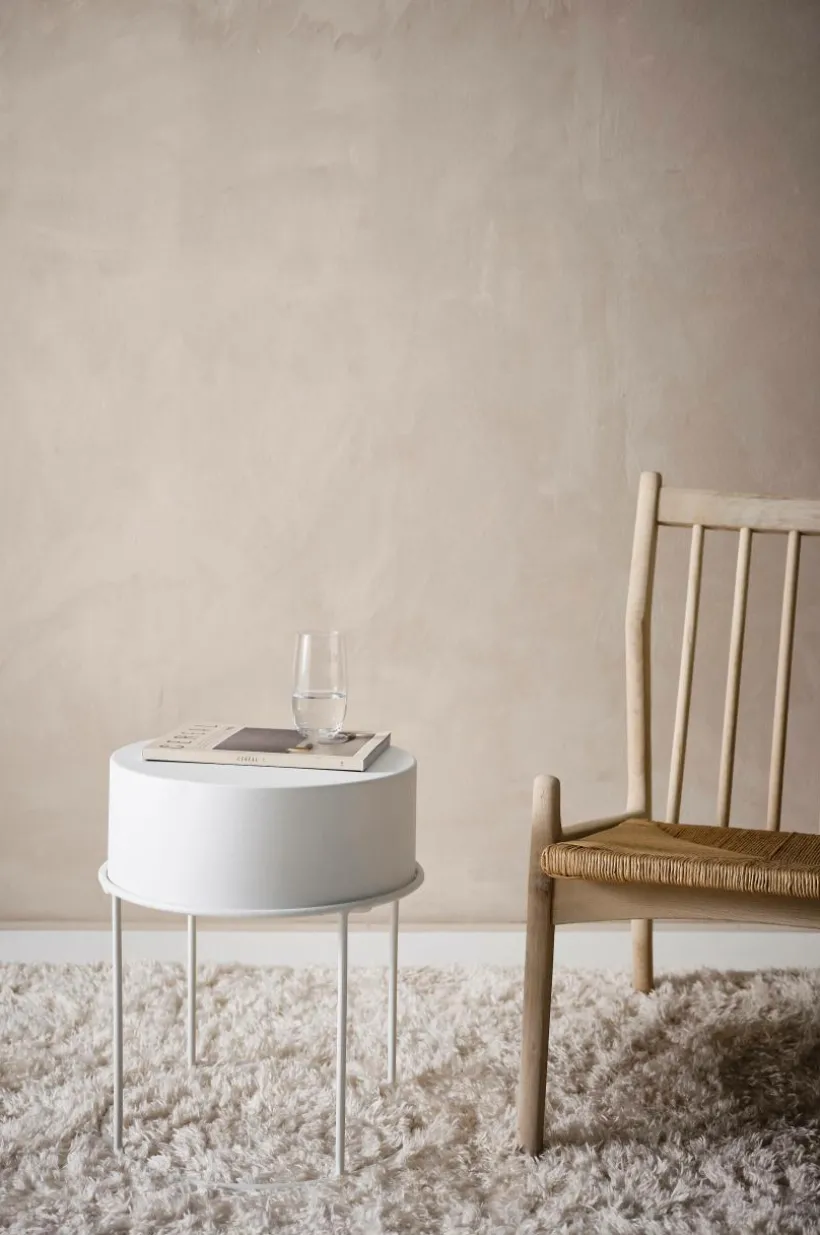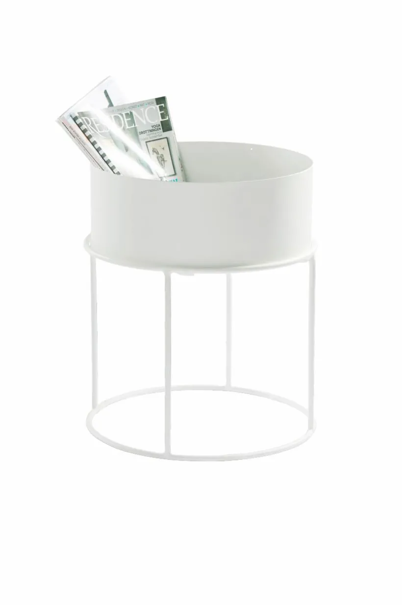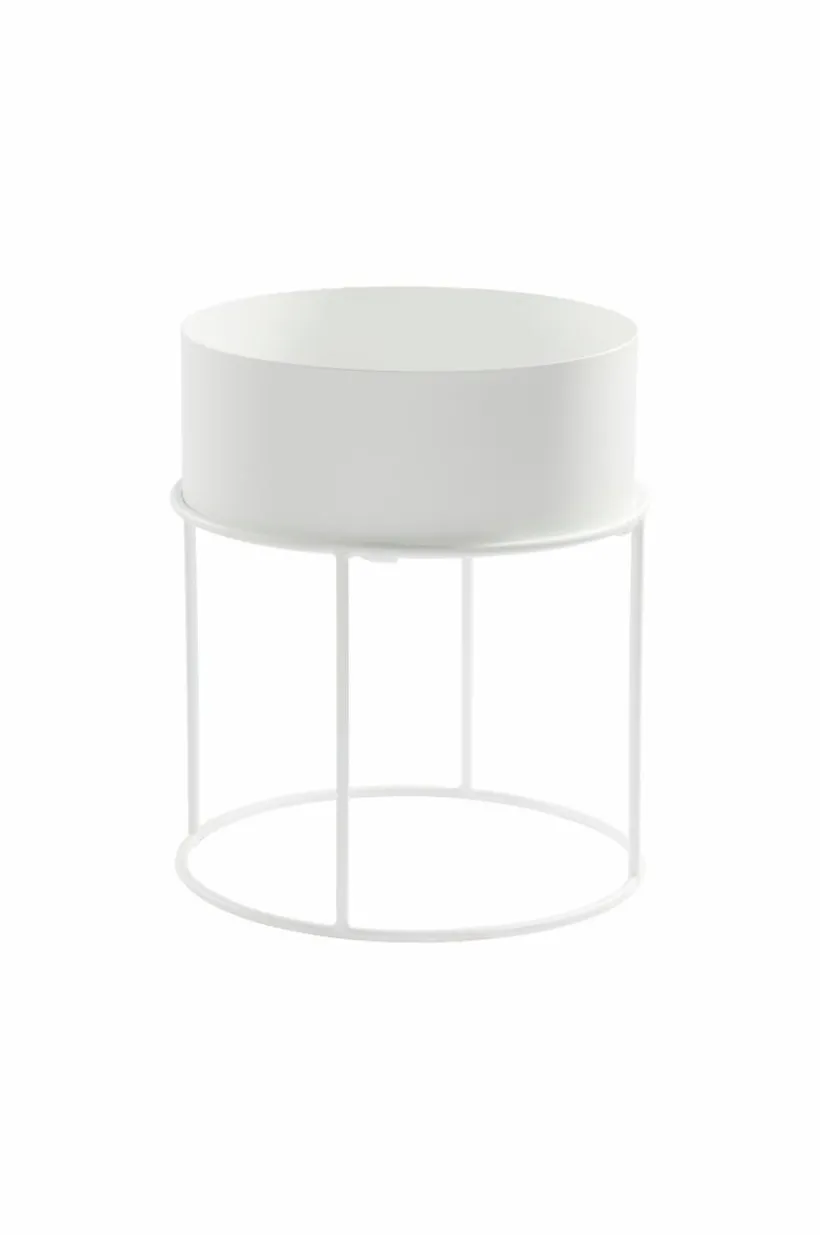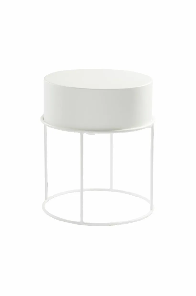 Runt sidobord av pulverlackerat järn. Bordsskivan är lös och kan lyftas av och användas som bricka. Den kan dessutom vändas upp och ned, och du bestämmer om bordet ska ha en sarg eller inte. Väljer du att ha vända bordsskivan så den får en sarg runtom är det fint att placera blomkrukor i och ha det som blombord. Ett bord för dig som är kreativ, det kan användas på många olika sätt. Viss montering krävs.