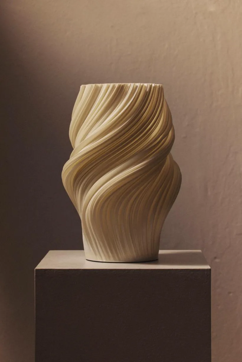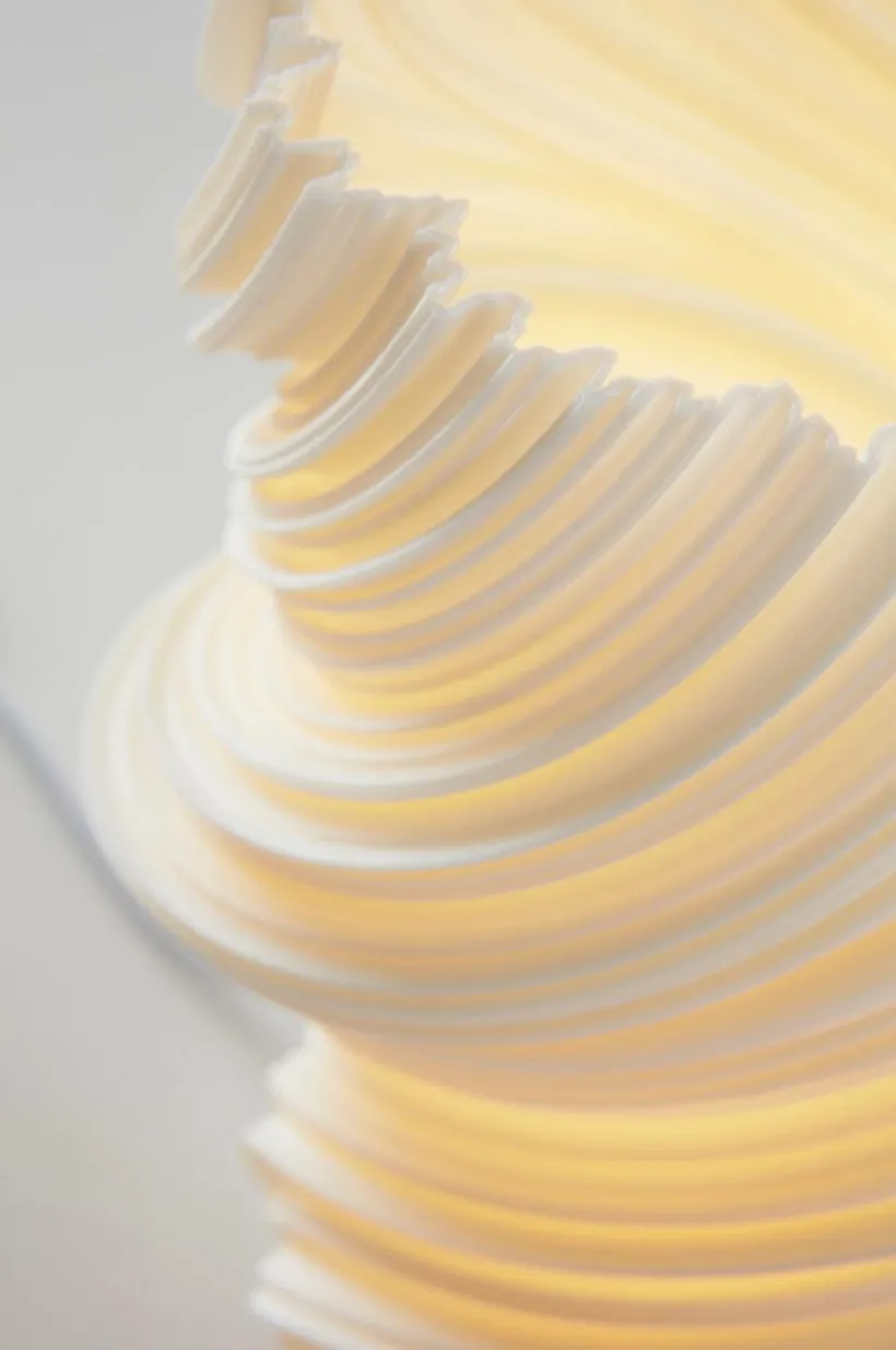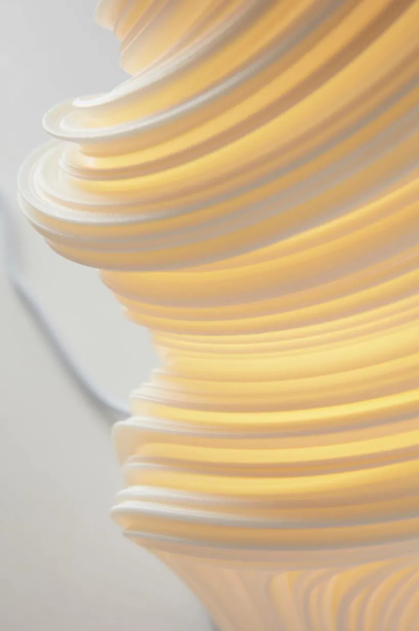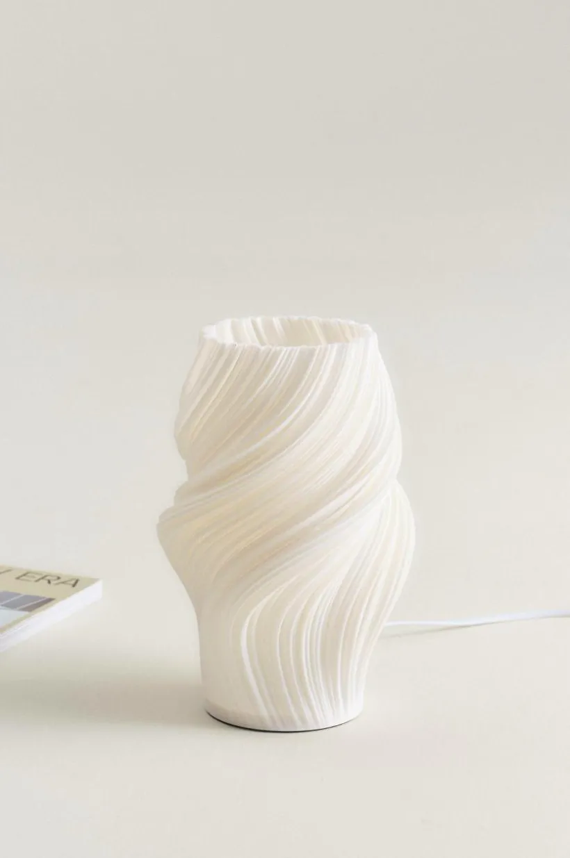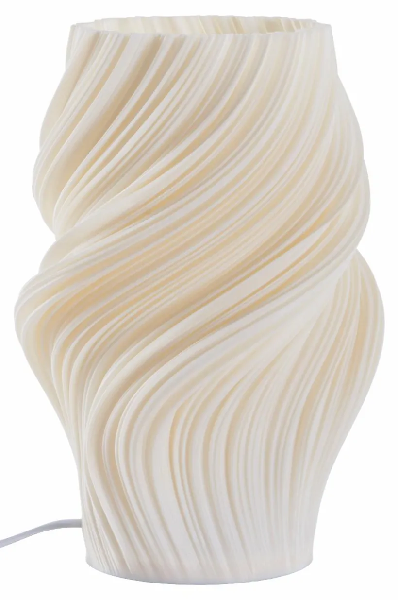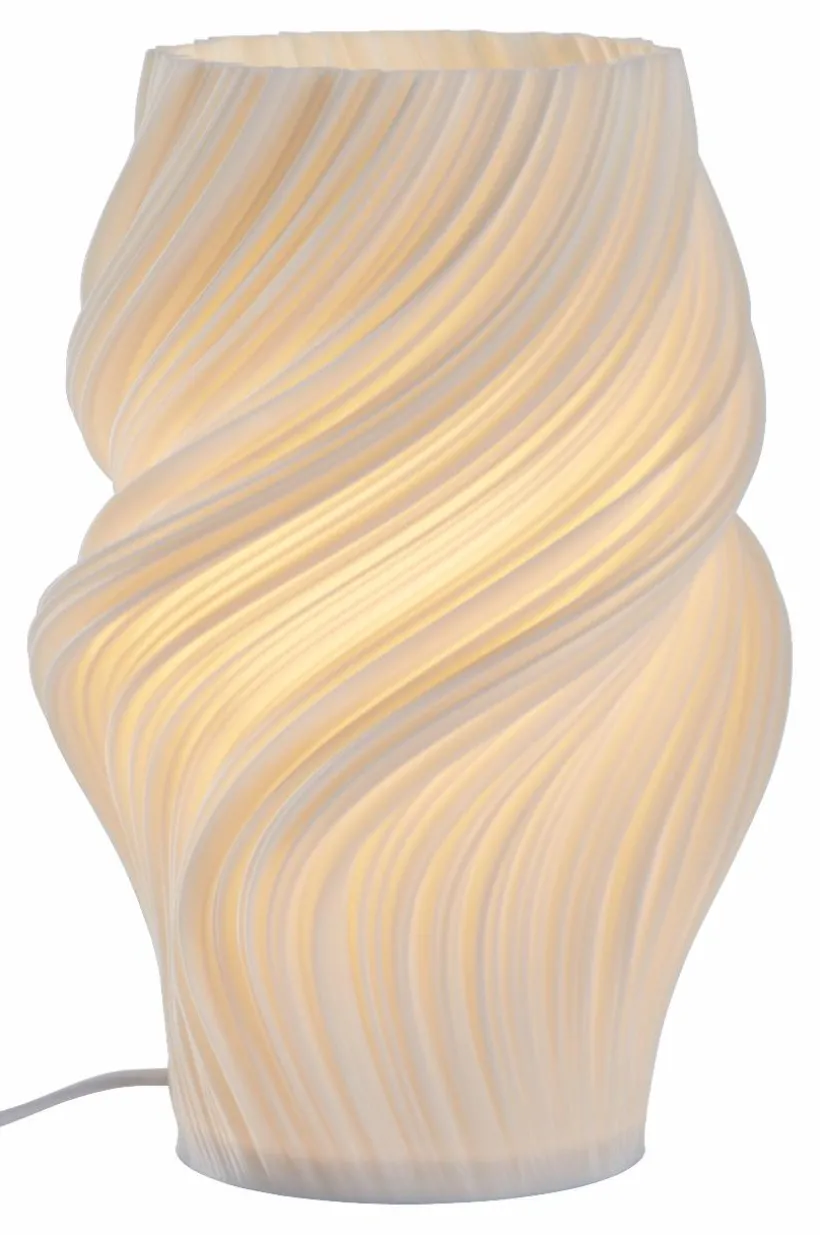 Bordslampa som är 3D-printad av PLA. PLA är en typ av plast som är fossilfri och framställd av dextros från biologiska material. Lampans form är härligt spritsad och den ljusa skärmen sprider ett mysigt sken. Strömbrytaren sitter på sladden. Lampan är ojordad, klass 2.