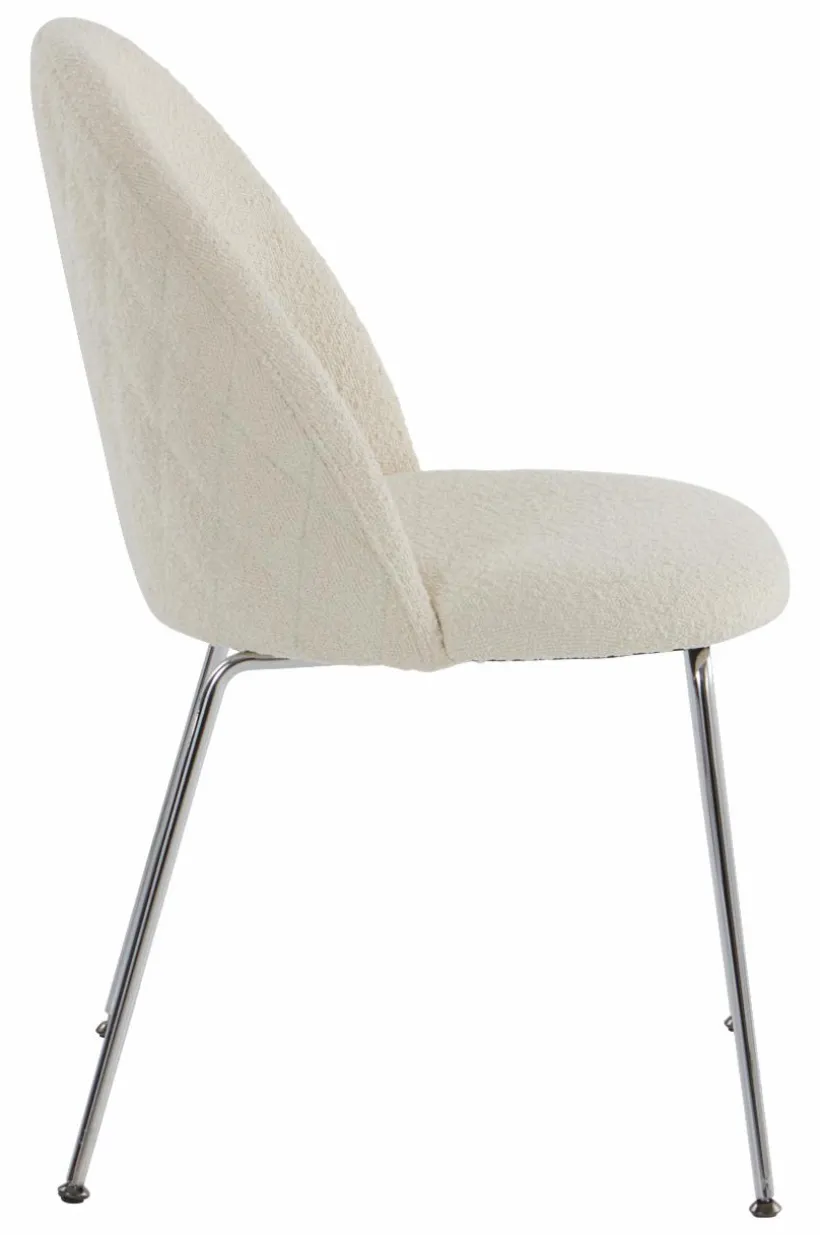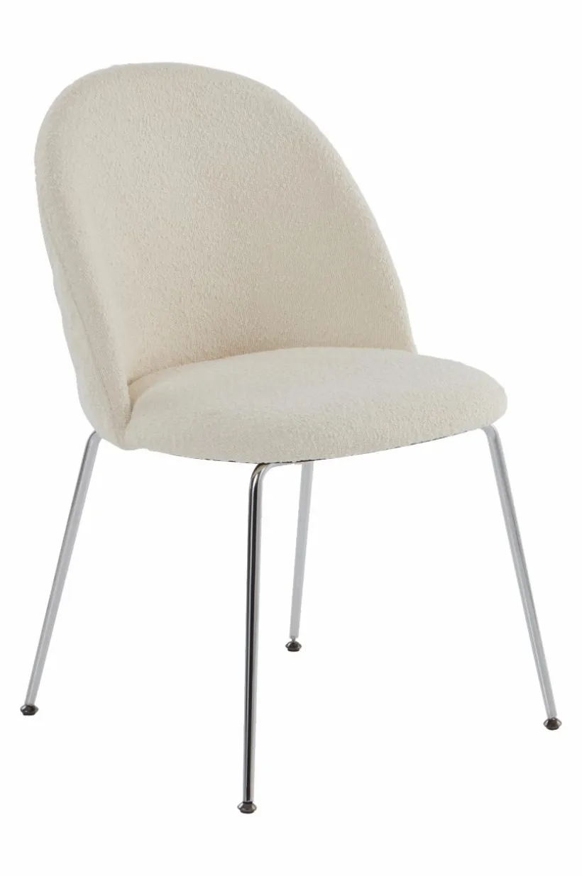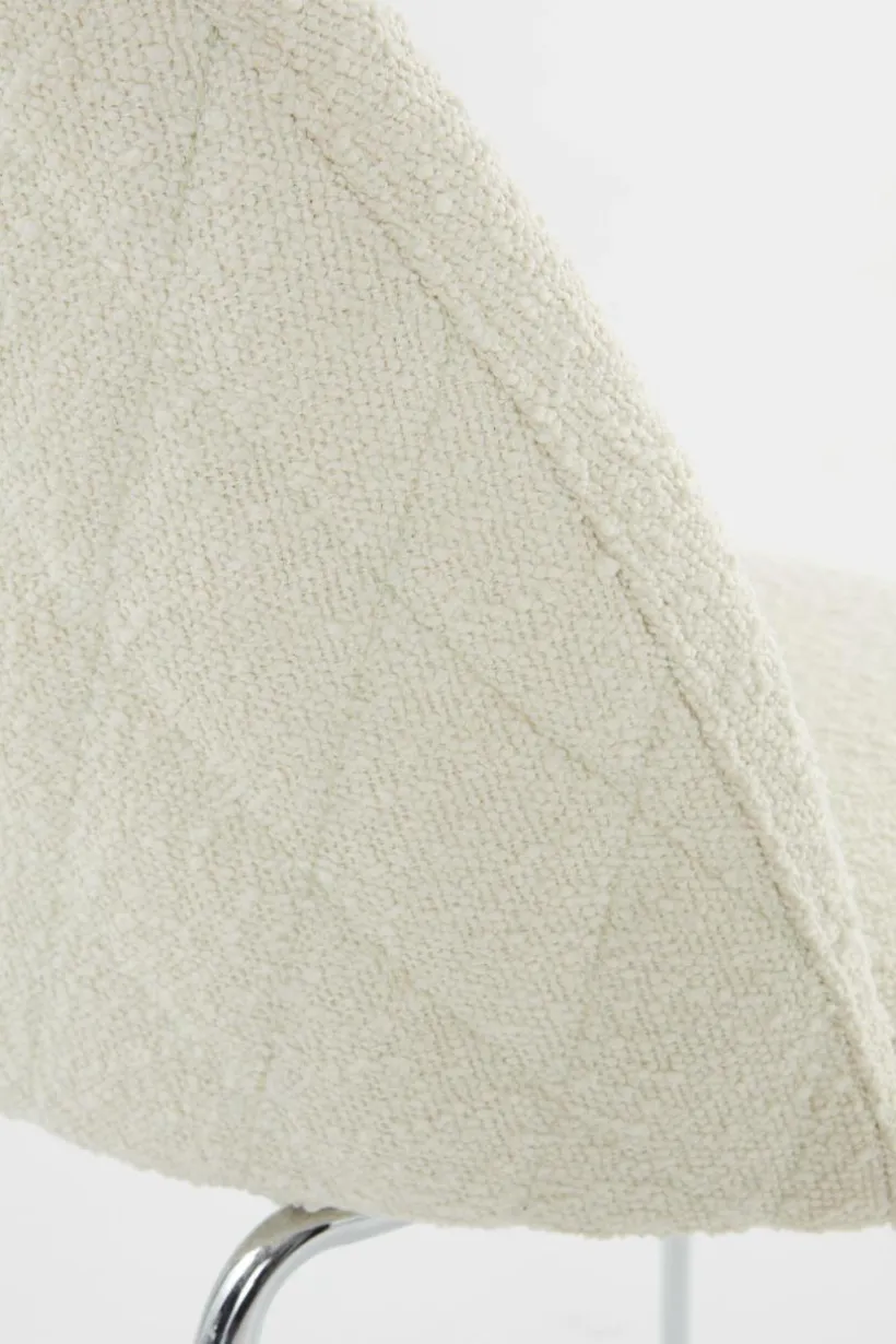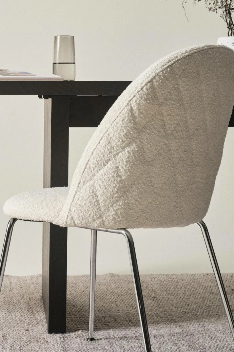 2-pack stolar med klädsel av fint bouclétyg med struktur och kromade, lätt utställda stålben. Baksidan av ryggstödet har dekorativ quiltsöm, vilket gör stolen extra snygg vid ett matbord. Både ryggstöd och sits är bekvämt mjukstoppade med polyesterskum på en stomme av plywood. CALLAHAN är en bekväm stol som passar fint vid långa mysiga middagar, det är lätt att bli sittande länge.