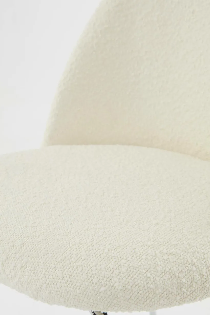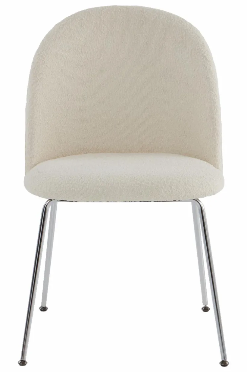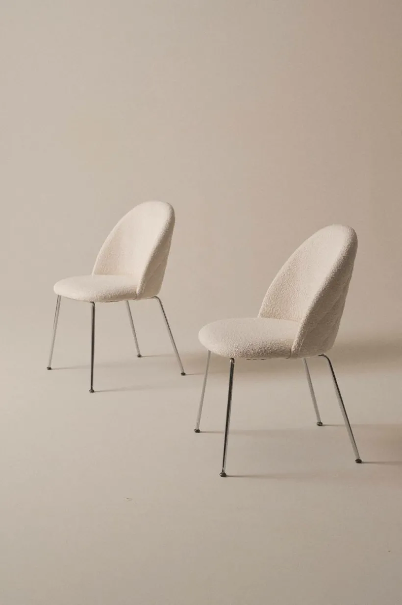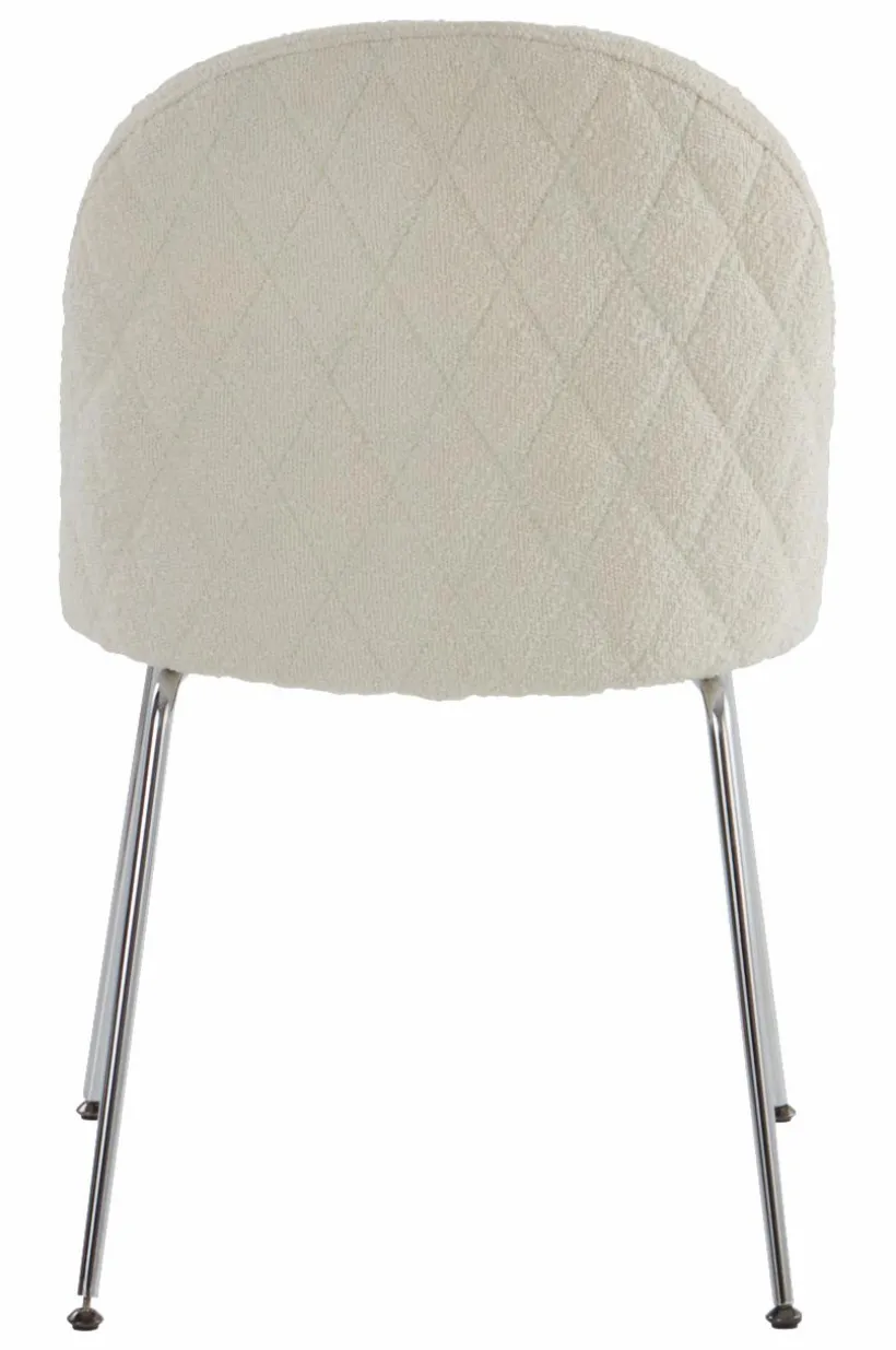 2-pack stolar med klädsel av fint bouclétyg med struktur och kromade, lätt utställda stålben. Baksidan av ryggstödet har dekorativ quiltsöm, vilket gör stolen extra snygg vid ett matbord. Både ryggstöd och sits är bekvämt mjukstoppade med polyesterskum på en stomme av plywood. CALLAHAN är en bekväm stol som passar fint vid långa mysiga middagar, det är lätt att bli sittande länge.