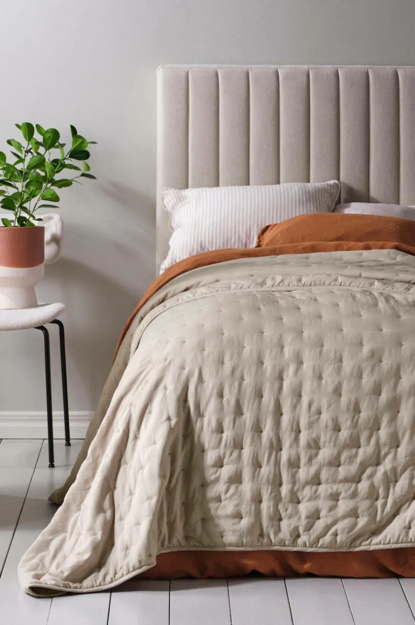 Överkast för enkelsäng, sytt i mjuk polyester som tvättats för att få en skön känsla. Överkastet har enkel quiltning av broderade små kryss som bildar ett diskret mönster vilket ger liv och samtidigt håller fyllningen på plats. Bandkantning runt om förstärker den mjuka stilen. Överkastets baksida är av polyester. Obs! Kuddfodral medföljer ej, köps separat.