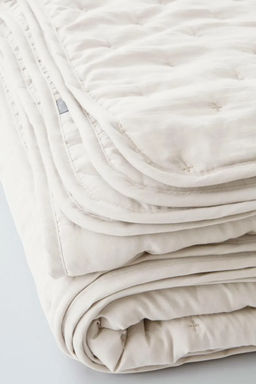 Överkast för enkelsäng, sytt i mjuk polyester som tvättats för att få en skön känsla. Överkastet har enkel quiltning av broderade små kryss som bildar ett diskret mönster vilket ger liv och samtidigt håller fyllningen på plats. Bandkantning runt om förstärker den mjuka stilen. Överkastets baksida är av polyester. Obs! Kuddfodral medföljer ej, köps separat.