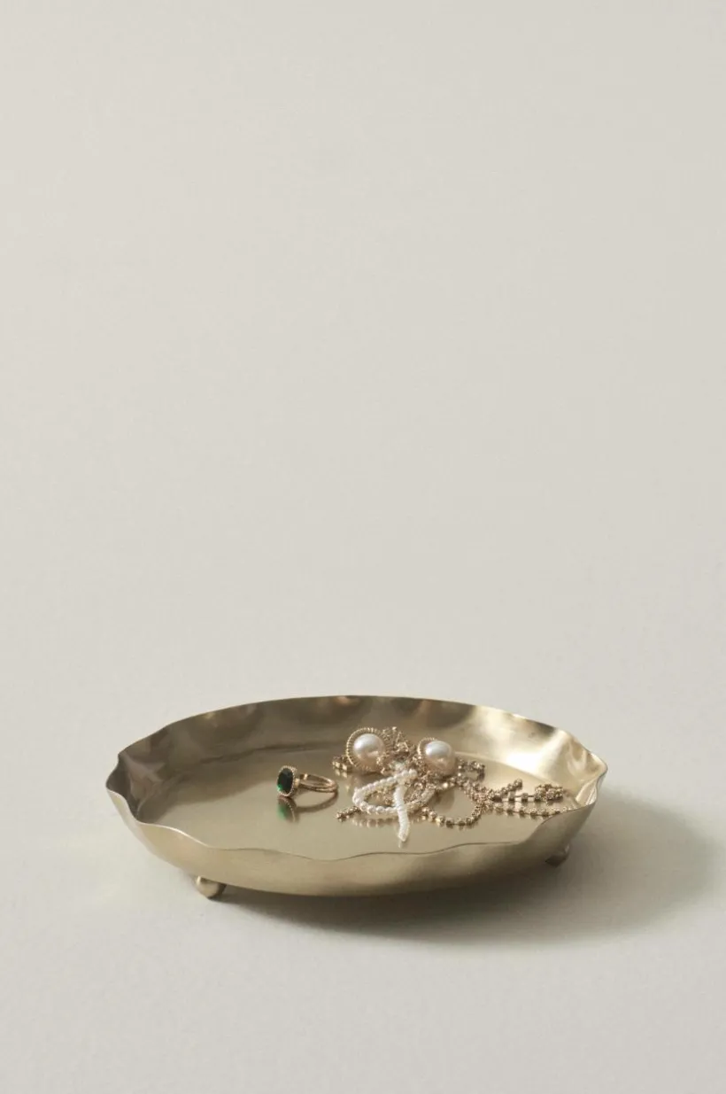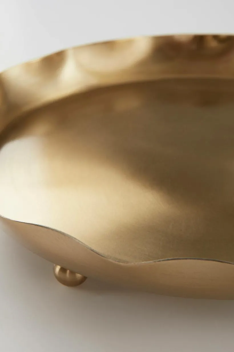 Krukfat av järn med guldglänsande finish. Det fina, runda fatet har lätt böljande form och små runda tassar under och passar perfekt under en blomkruka.