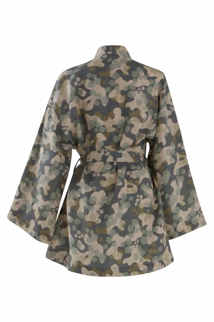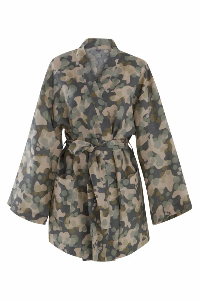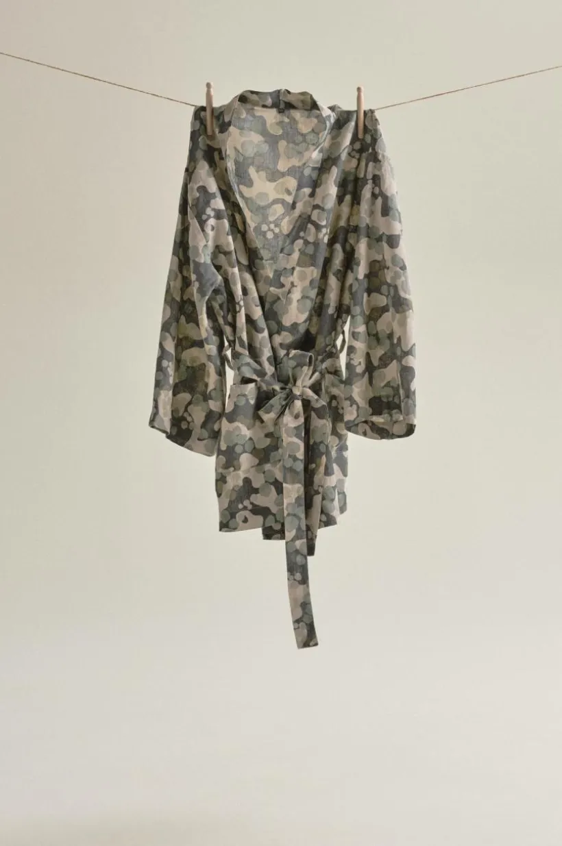 Kimono i kort modell av naturligt och behagligt linne med tryckt mönster som designats av Maria Carlberg. Den sköna linnekvalitén har tvättats för att bli härligt mjuk och skön. Mysig modell knytskärp i midjan och två framfickor. Vikt 160 g/m². Trådtäthet på 94 tc. (Trådtätheten talar om antalet trådar, thread counts, per kvadrattum i ett tyg. Ju högre trådtäthet desto högre kvalité. Med undantag för linne som ofta vävs glesare för att få den rätta känslan.)