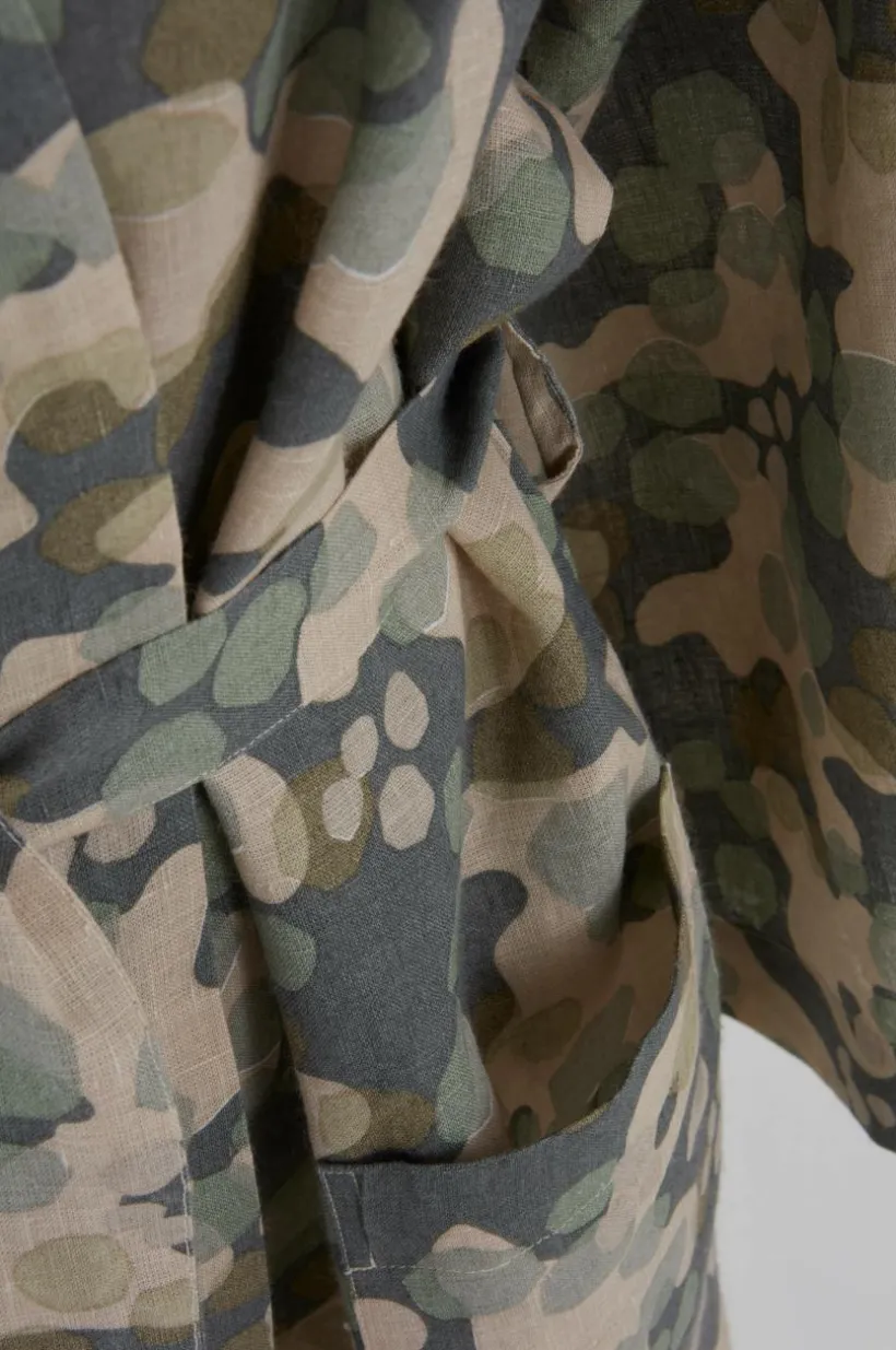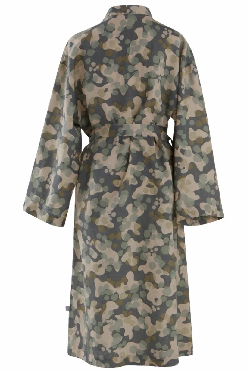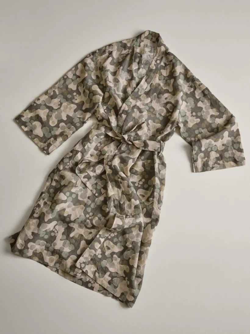 Kimono i lång modell av naturligt och behagligt linne med tryckt mönster som designats av Maria Carlberg. Den sköna linnekvalitén har tvättats för att bli härligt mjuk och skön. Mysig modell knytskärp i midjan och två framfickor. Vikt 160 g/m². Trådtäthet på 94 tc. (Trådtätheten talar om antalet trådar, thread counts, per kvadrattum i ett tyg. Ju högre trådtäthet desto högre kvalité. Med undantag för linne som ofta vävs glesare för att få den rätta känslan.)