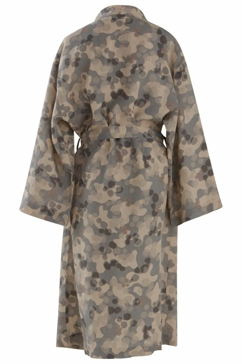 Kimono i lång modell av naturligt och behagligt linne med tryckt mönster som designats av Maria Carlberg. Den sköna linnekvalitén har tvättats för att bli härligt mjuk och skön. Mysig modell knytskärp i midjan och två framfickor. Vikt 160 g/m². Trådtäthet på 94 tc. (Trådtätheten talar om antalet trådar, thread counts, per kvadrattum i ett tyg. Ju högre trådtäthet desto högre kvalité. Med undantag för linne som ofta vävs glesare för att få den rätta känslan.)