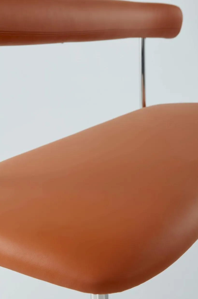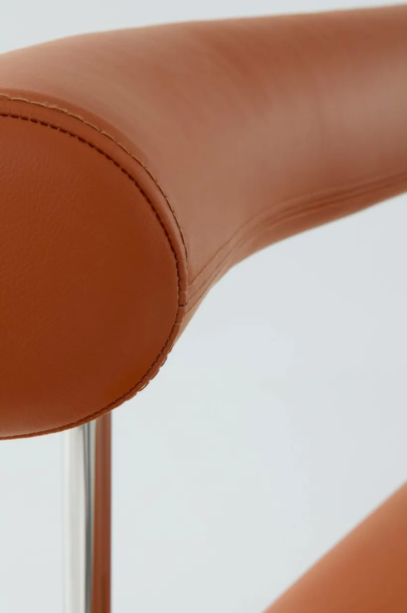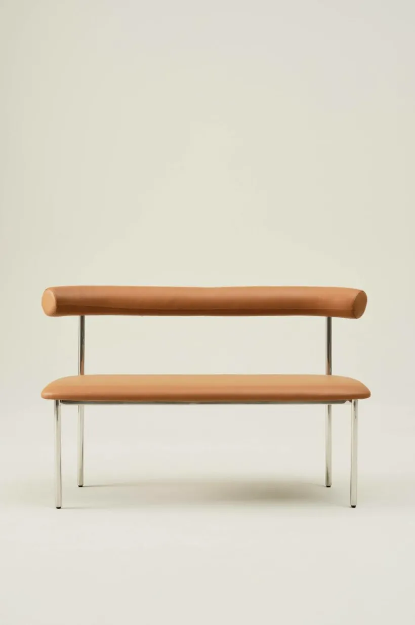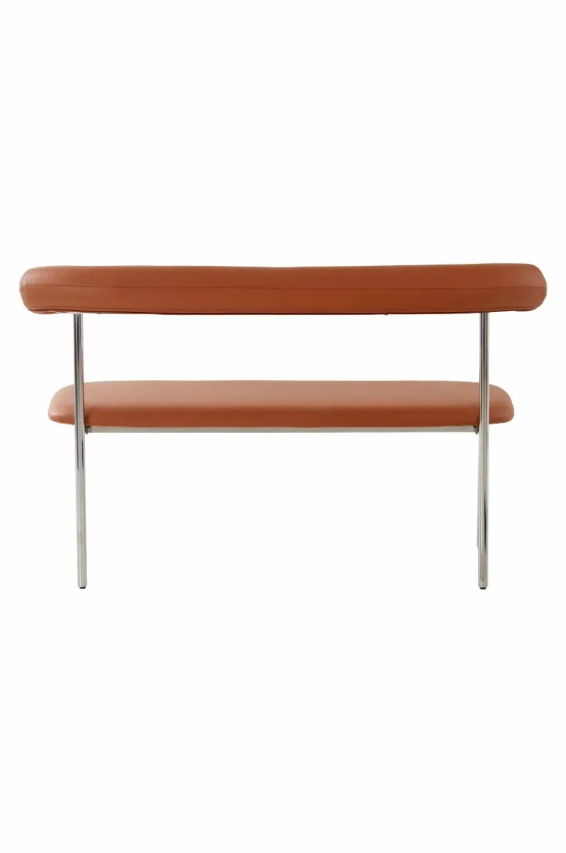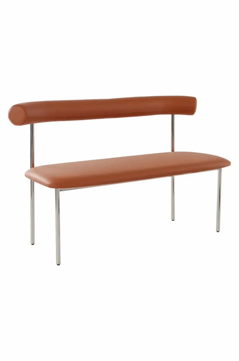 Soffa med stilren läderklädsel i smakfull kombination med kromat stål. Sitsen och det mjuka, rundade ryggstödet är mjukt stoppade, vilket gör soffan bekväm att sitta i, perfekt för långa, härliga måltider. Sitsens ram är tillverkad av plywood som är certifierad med FSC. Läder är ett slitstarkt material som du enkelt kan torka av vid behov.