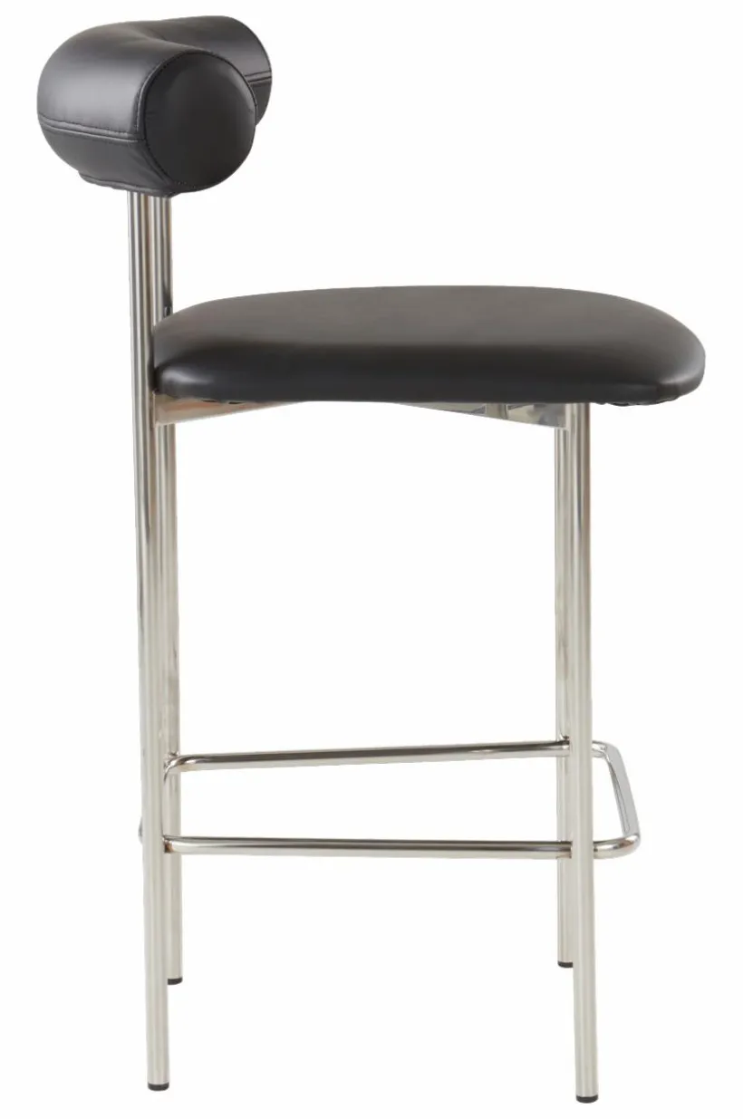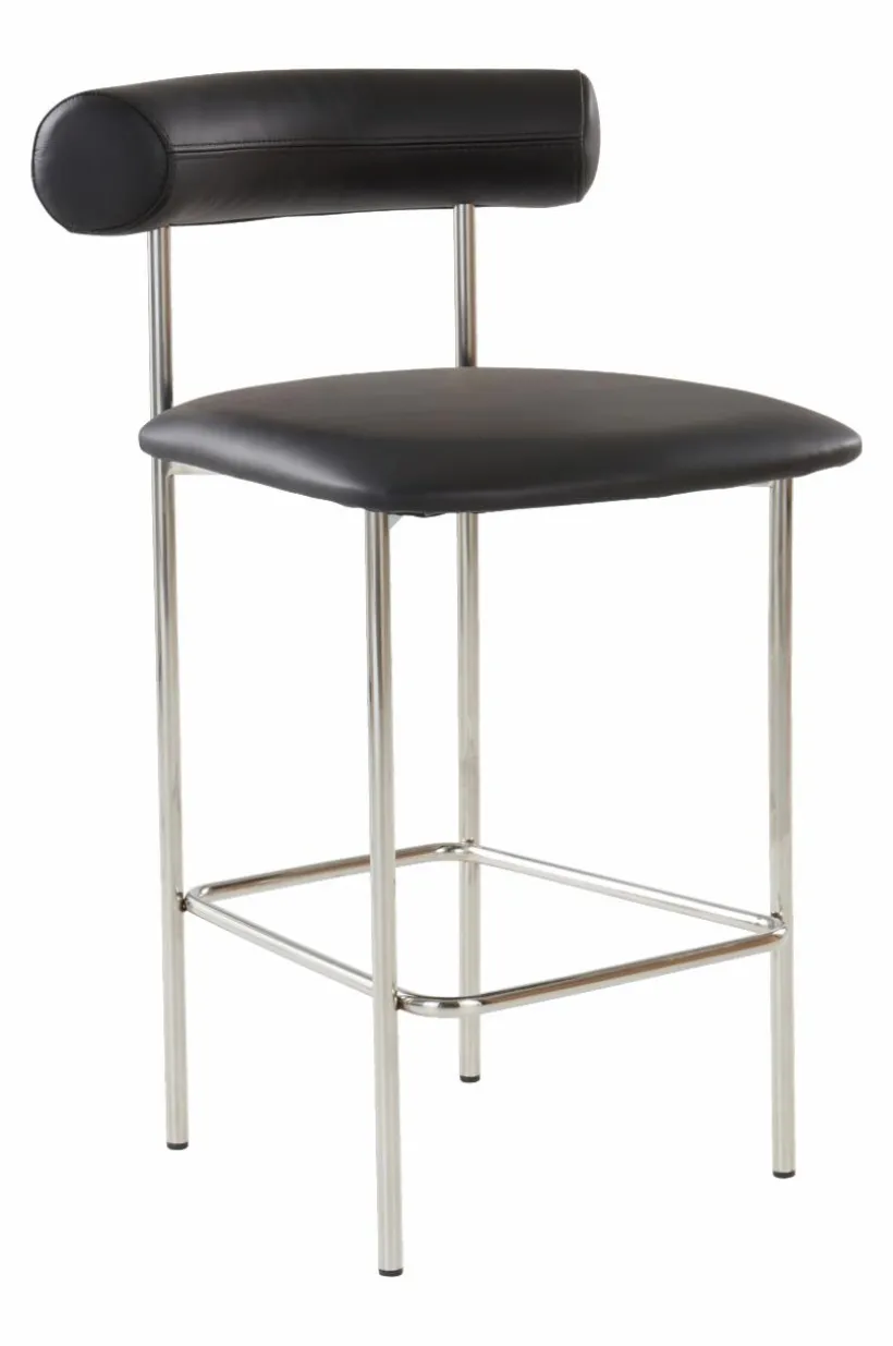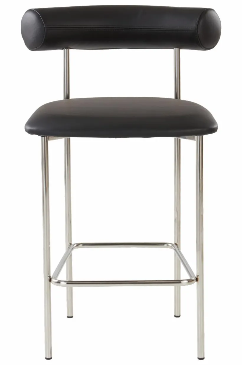 Barstol med stilren läderklädsel i smakfull kombination med kromat stål. Sitsen och det mjuka, rundade ryggstödet är mjukt stoppade, vilket gör stolen bekväm att sitta på, perfekt för långa, härliga måltider. Sitsens ram är tillverkad av plywood som är certifierad med FSC. Läder är ett slitstarkt material som du enkelt kan torka av vid behov.