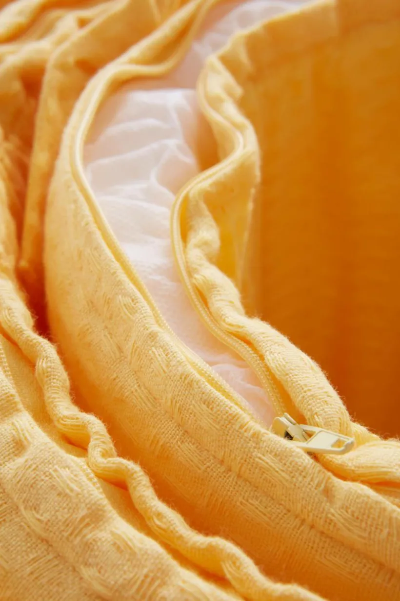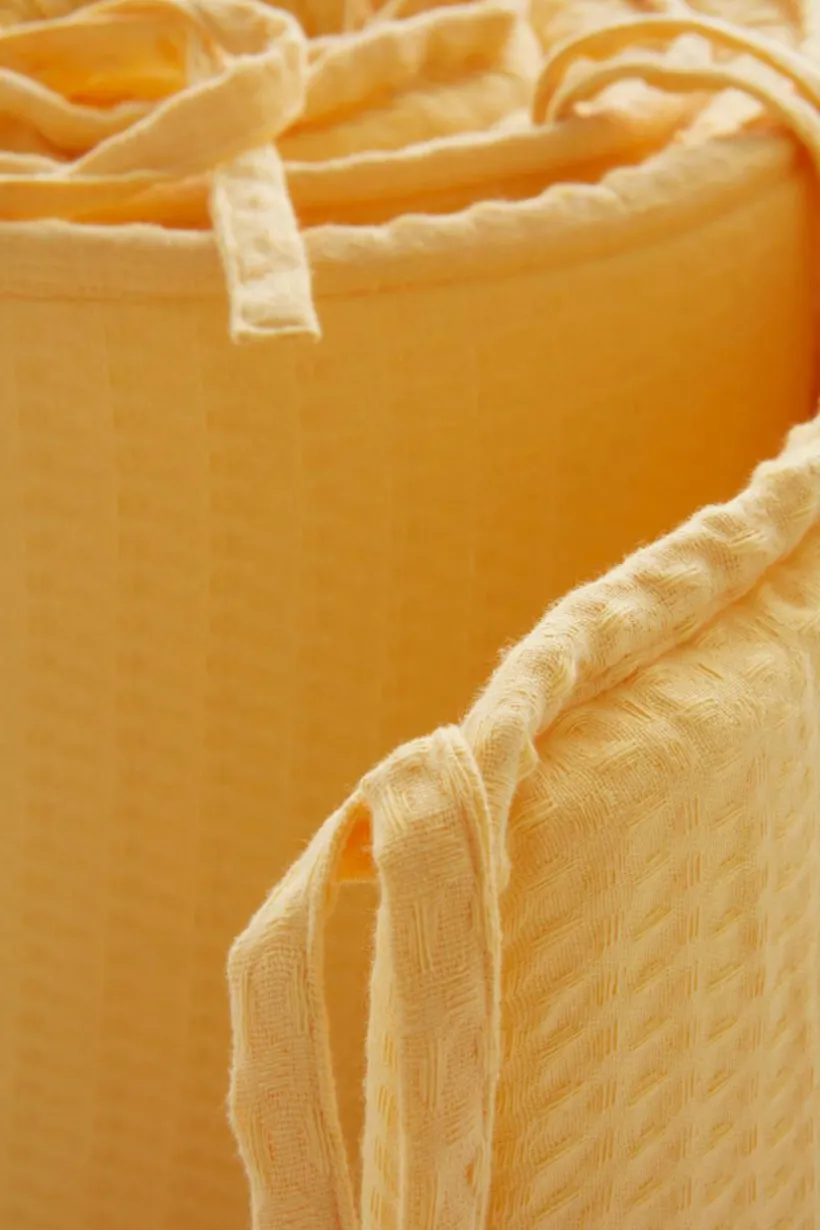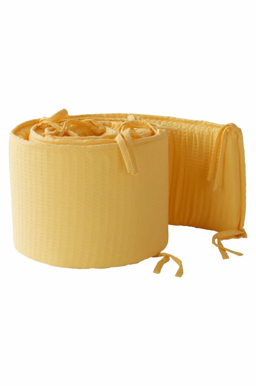 Spjälsängsskydd med yttertyg av ekologisk bomull i en mjuk och skön, våfflad kvalité. Tyget är plaggtvättat vilket innebär att det tvättats innan sömnad, och den våfflade kvalitén är extra mjuk och skön. Fyllning av polyester med mjuk skumgummikärna. Spjälskyddet gör spjälsängen mer ombonad och mysig, samtidigt som det hindrar barnet från att slå emot spjälorna i sömnen. Spjälsängsskyddet knyts fast med knytband. Yttertyget är avtagbart med dragkedja i öppningen och tvättbart. Spjälskyddet passar en spjälsäng med måtten 60×120 cm. Tygets gramvikt 230 g/m².
