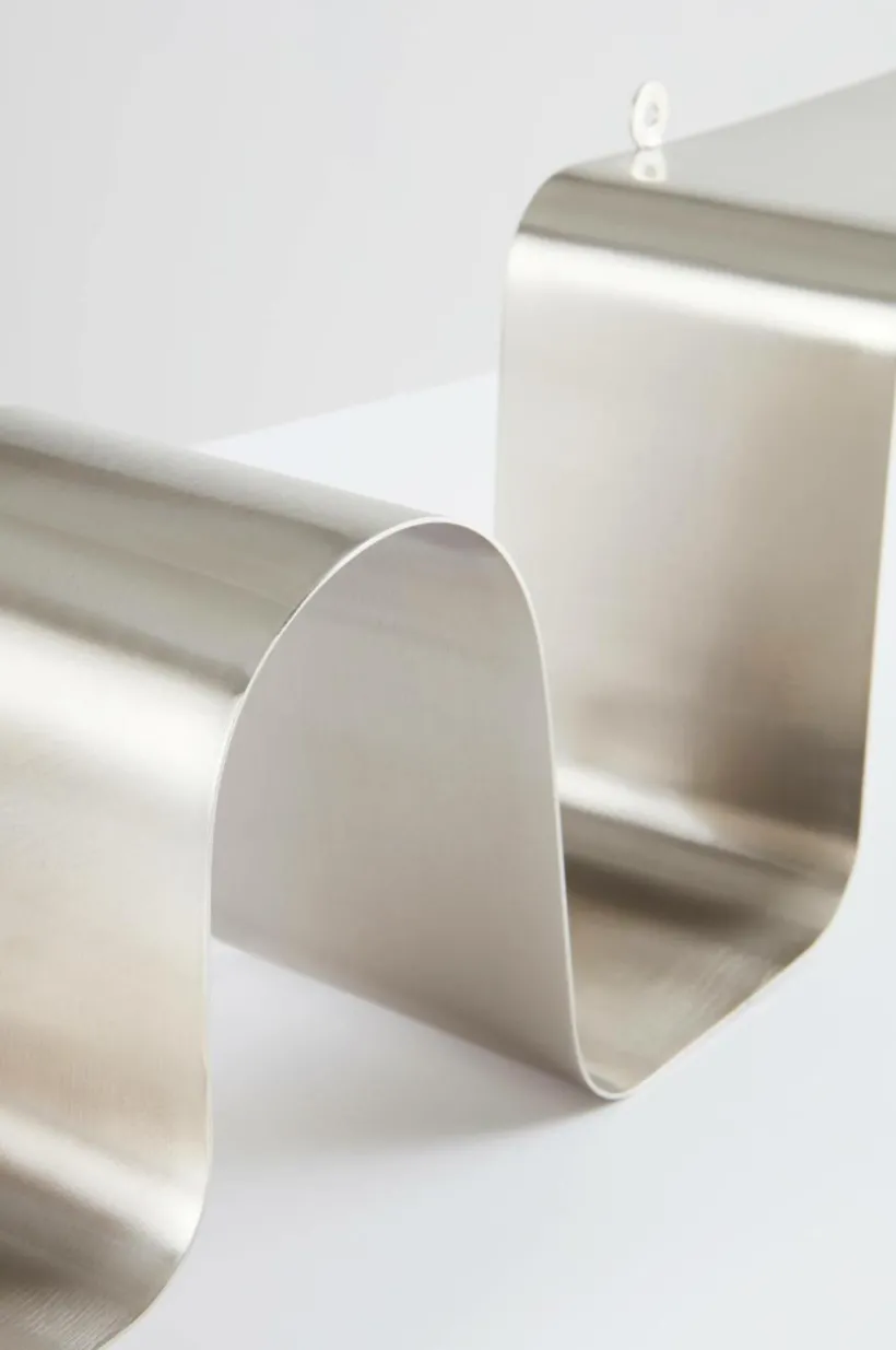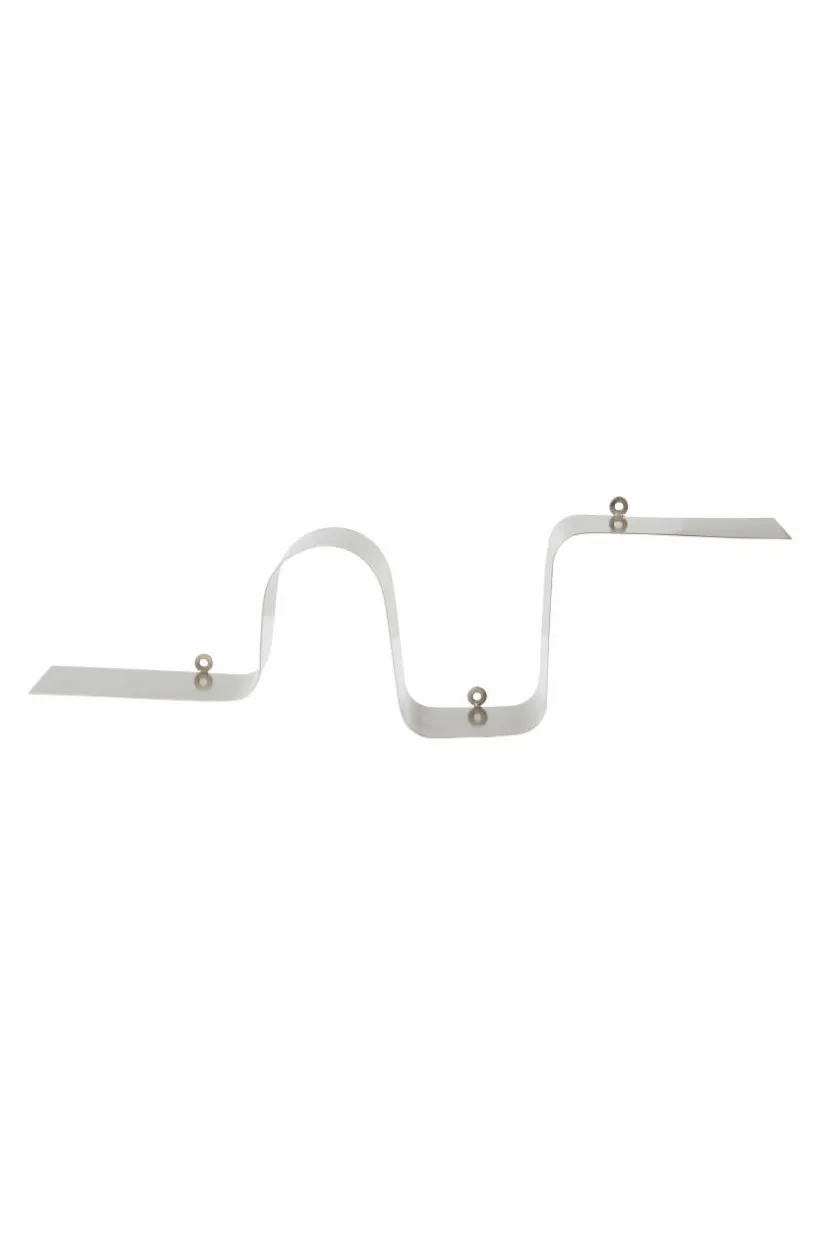 Vägghylla av metall i med unik och lekfull form. Stilren och smidig modell med hål för upphängning. De olika färgerna har olika ytbehandling. Den svarta är matt i lacken, lila och grön har rugglig yta och den metallicfärgade har borstad yta.