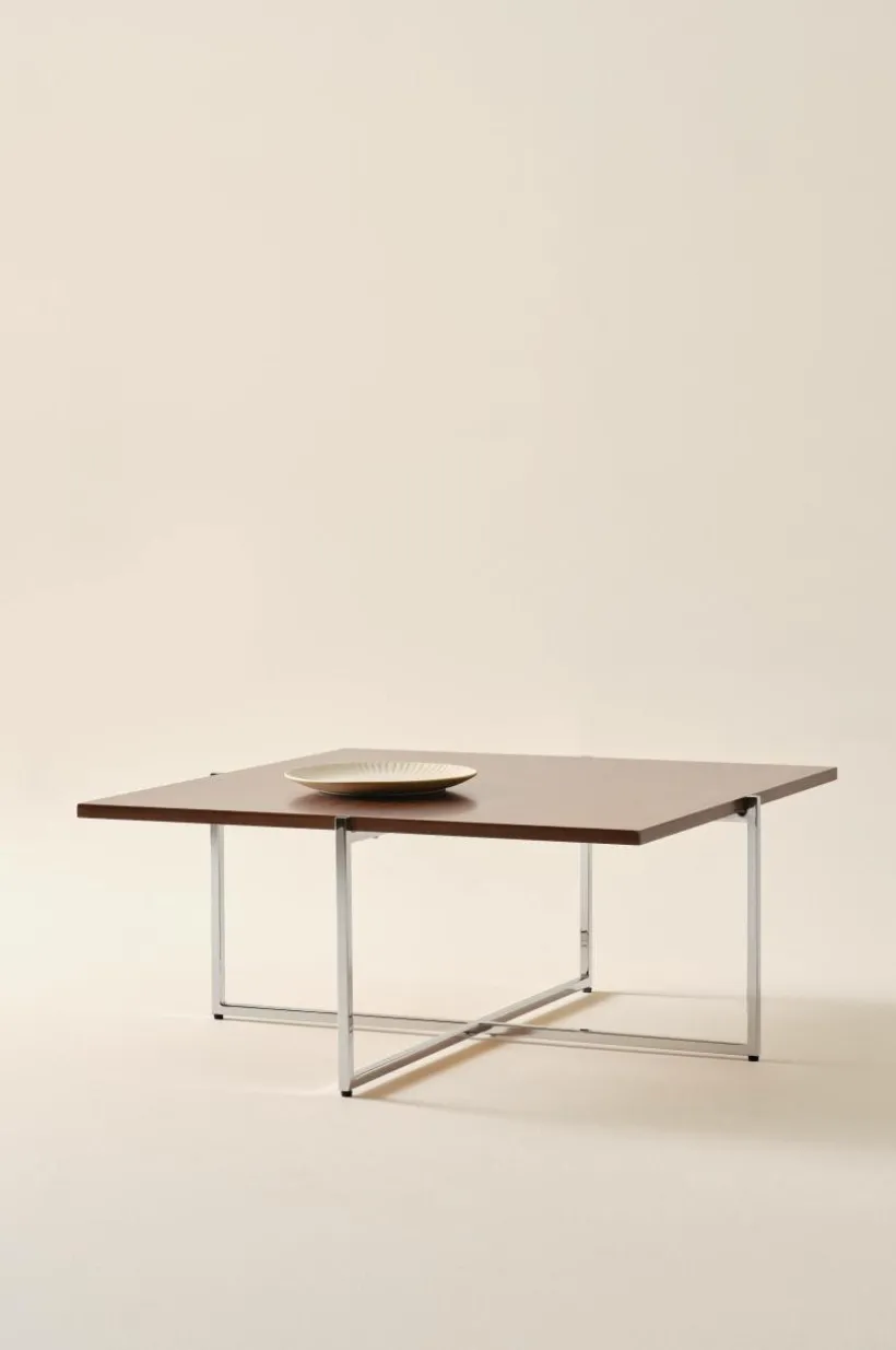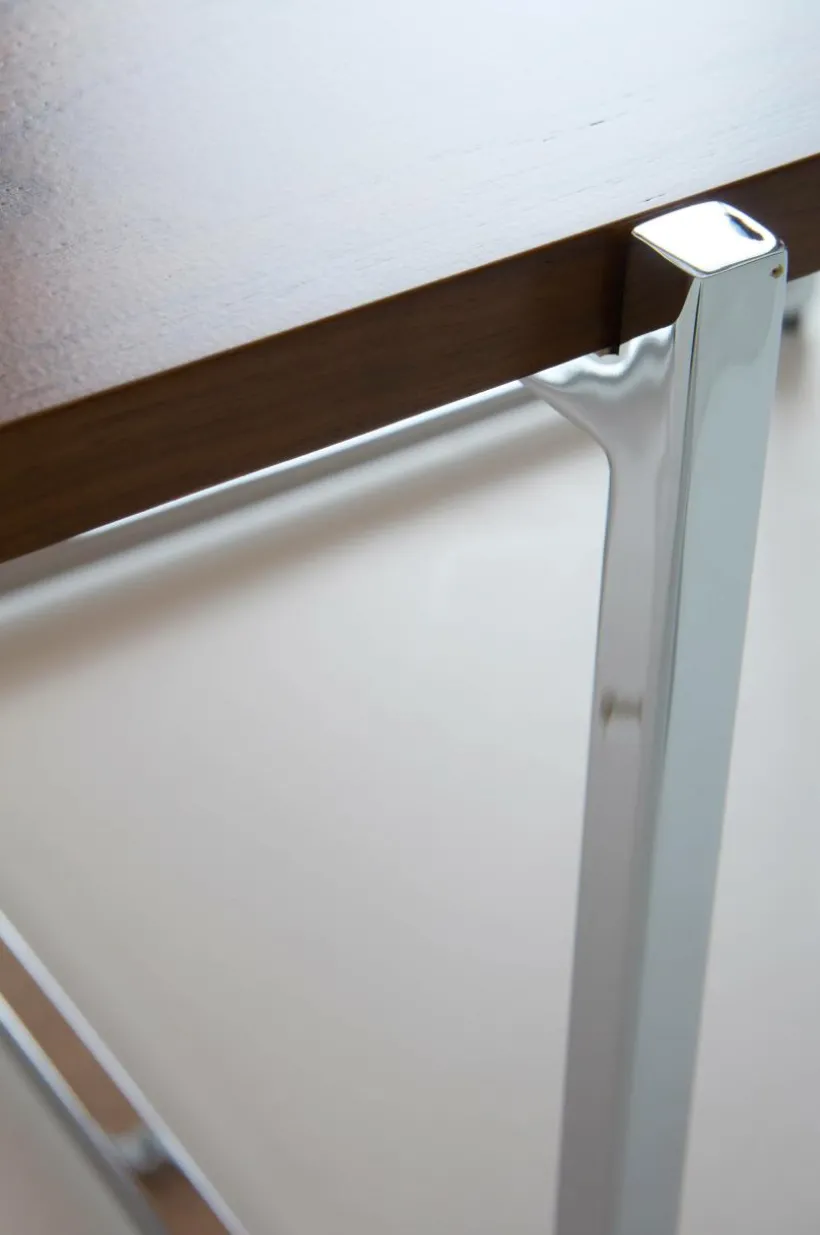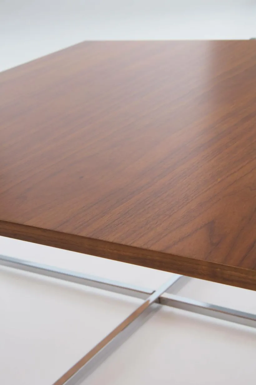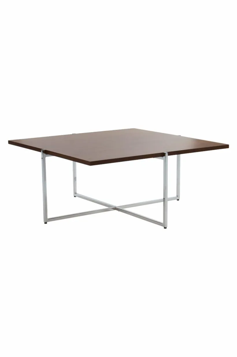 Ett elegant tillskott till alla moderna hem. Bordsskivan är tillverkad av MDF med valnötsfanér, vilket utstrålar värme och sofistikering. Benen i förkromat järn ger ett elegant stöd och en modern känsla. Detta soffbord är perfekt för att lyfta ditt vardagsrum och förenar funktion och estetik på ett sömlöst sätt.