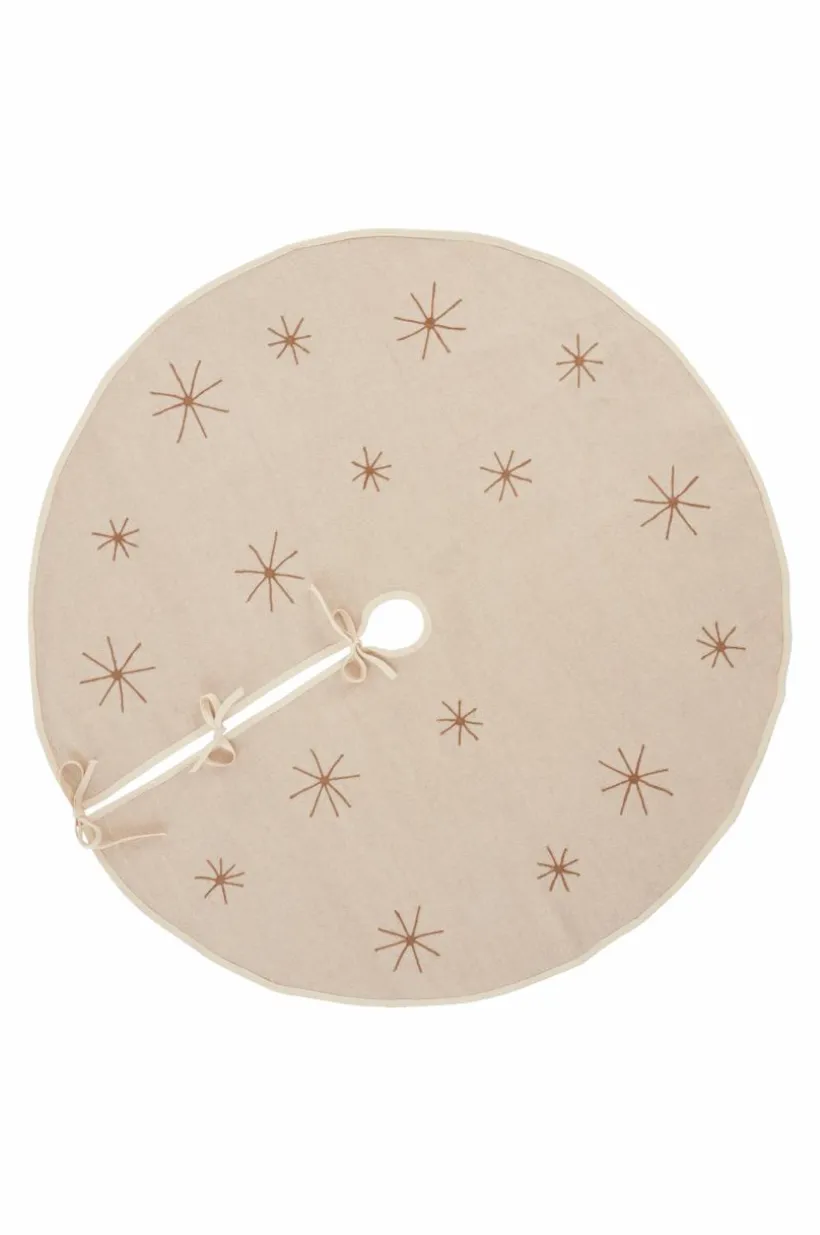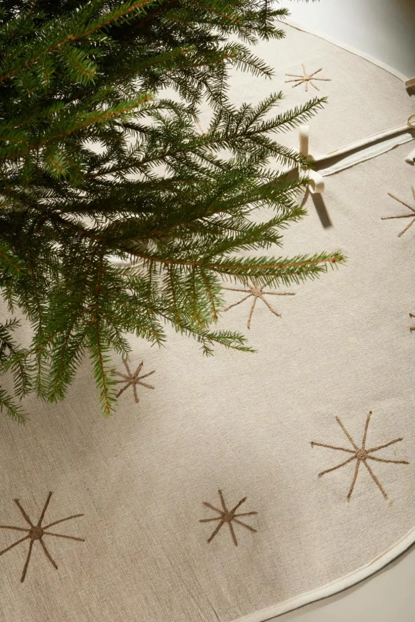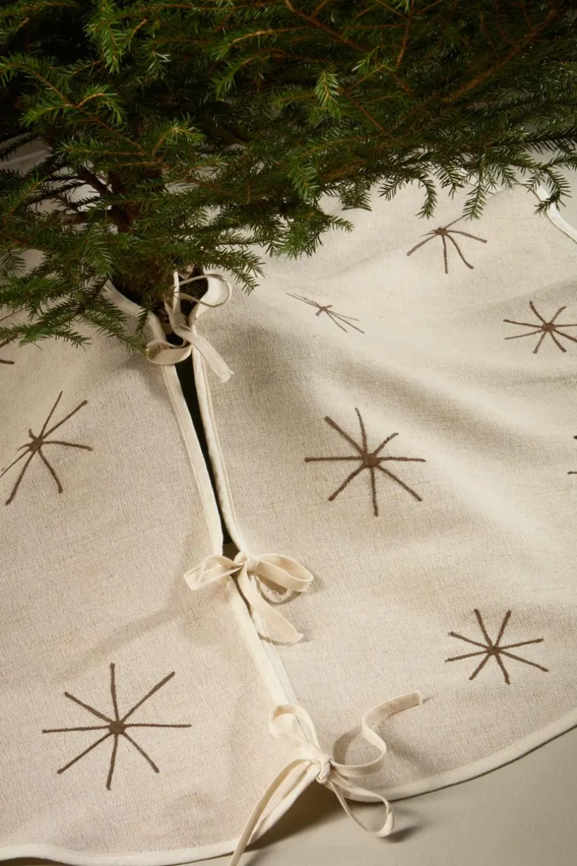 Julgranskappa/julgransmatta av jutemix med kantband runt om och broderade stjärnor. CHARON kan användas som kappa över julgransfoten så den hänger ner och döljer foten. Den kan också användas som en vanlig julgransmatta på golvet under julgranen. CHARON har ett hål i mitten och öppning med knytband. 400 g/m².
