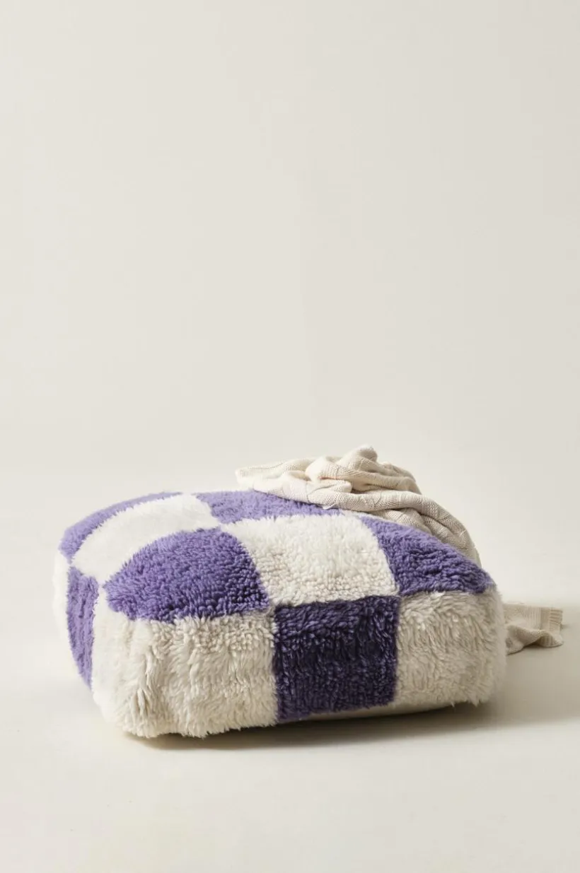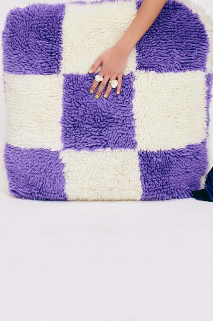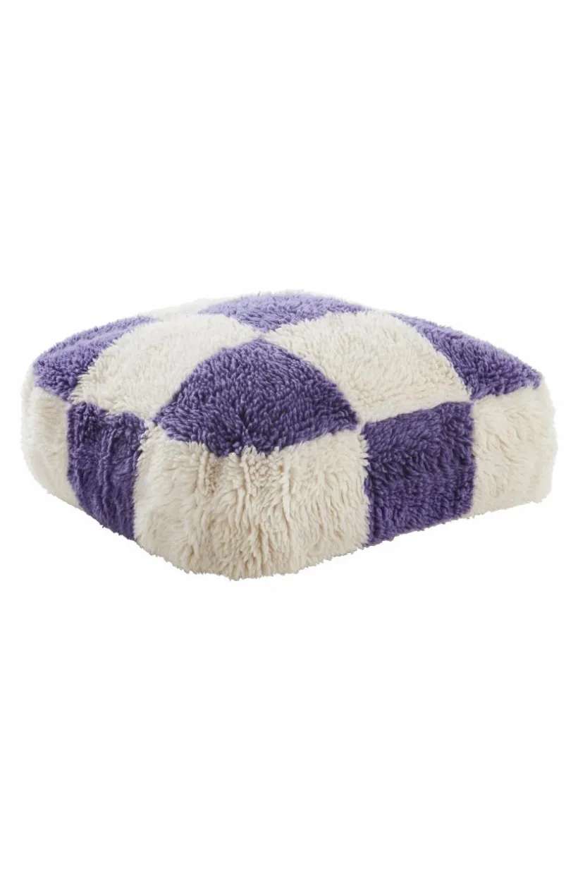 En stor och härlig, fyrkantig sittpuff med yttertyg som en skön ryamatta. Yttertyget är handtuftat och luggen är av mjuk och varm ull, tyget är av bomull. Mot golvet står puffen på ett vävt tyg, ingen lugg. Fyllningen är av cellplastkulor och den formar sig bekvämt när du slår dig ner. Tyg 1600-1800 g/m². Lugghöjd 2,8-3 cm.