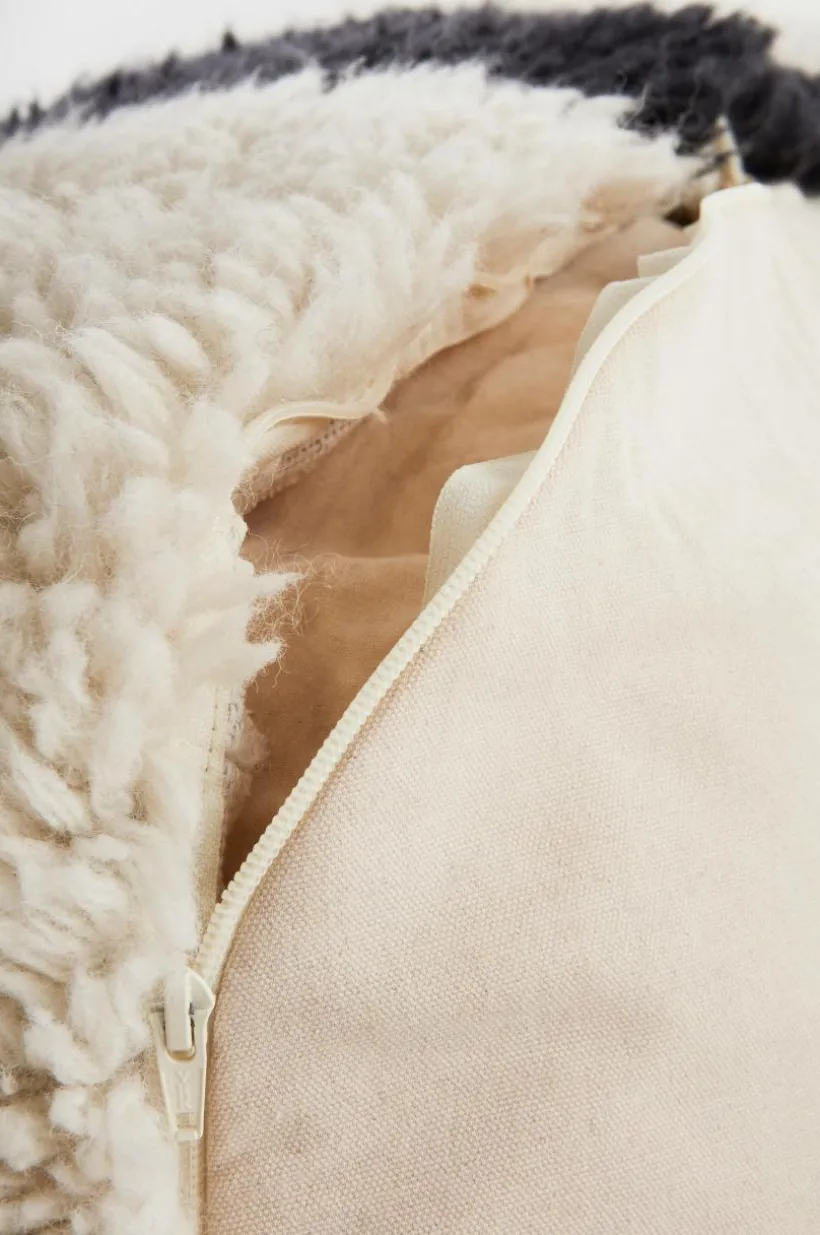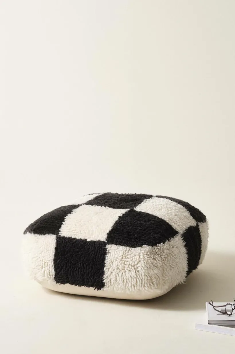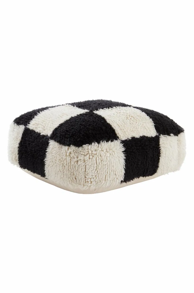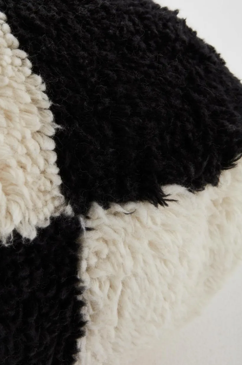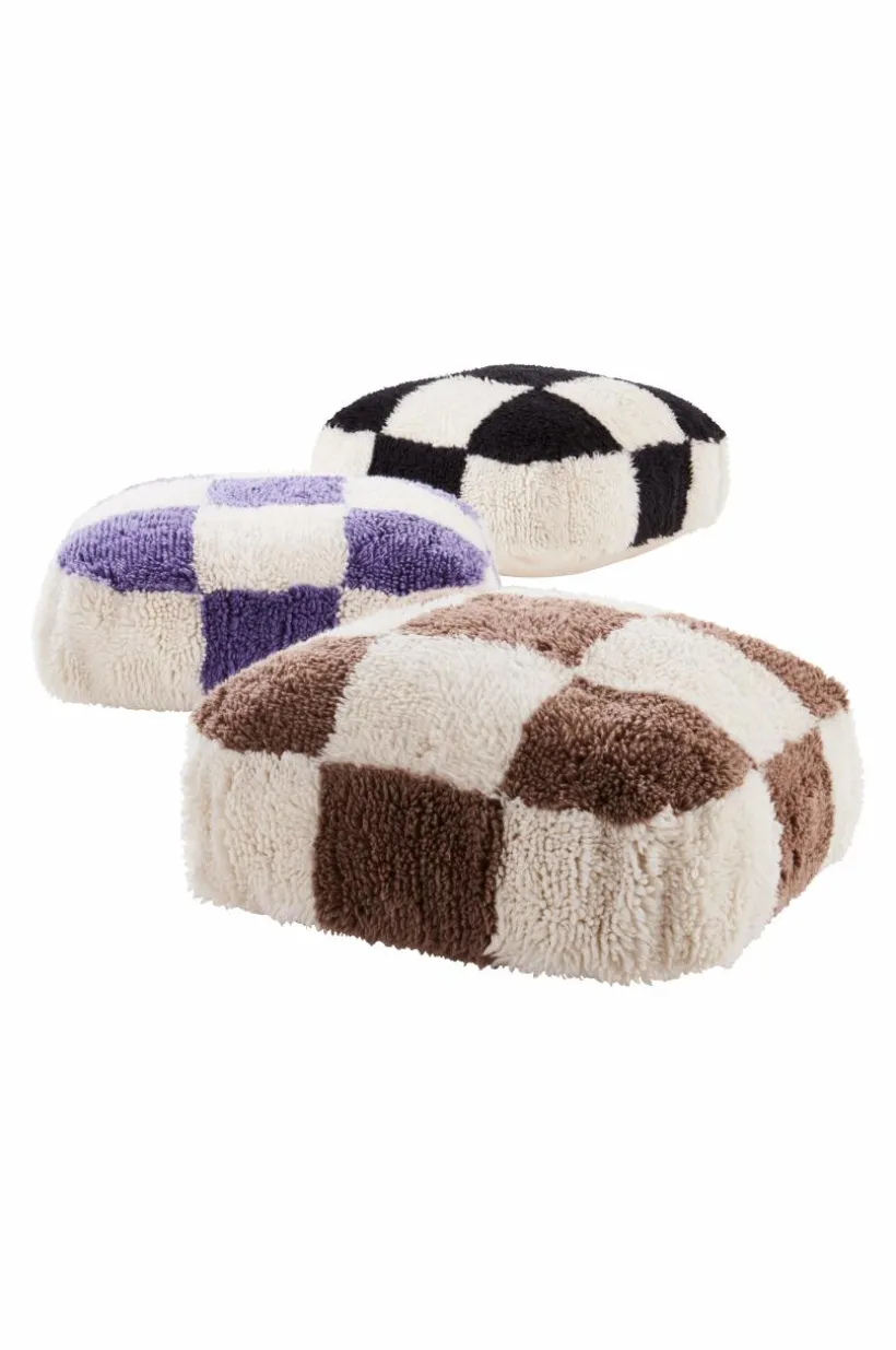 En stor och härlig, fyrkantig sittpuff med yttertyg som en skön ryamatta. Yttertyget är handtuftat och luggen är av mjuk och varm ull, tyget är av bomull. Mot golvet står puffen på ett vävt tyg, ingen lugg. Fyllningen är av cellplastkulor och den formar sig bekvämt när du slår dig ner. Tyg 1600-1800 g/m². Lugghöjd 2,8-3 cm.