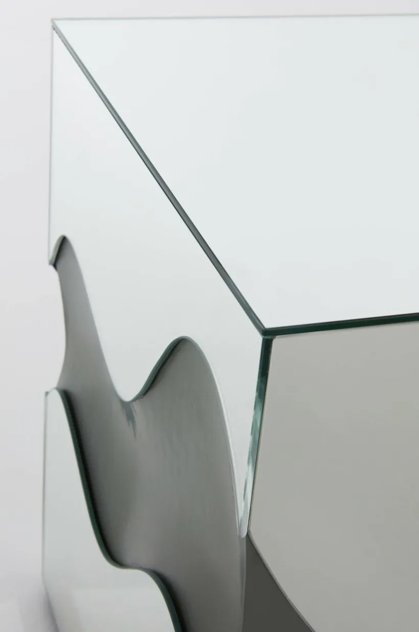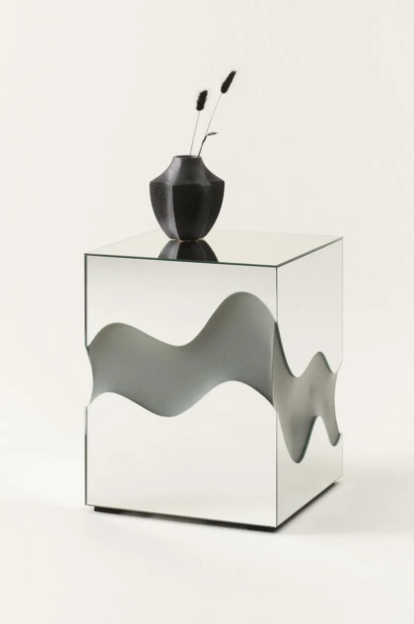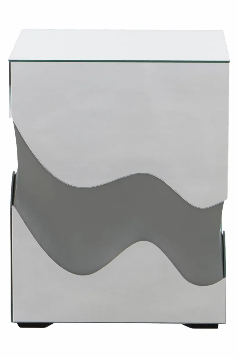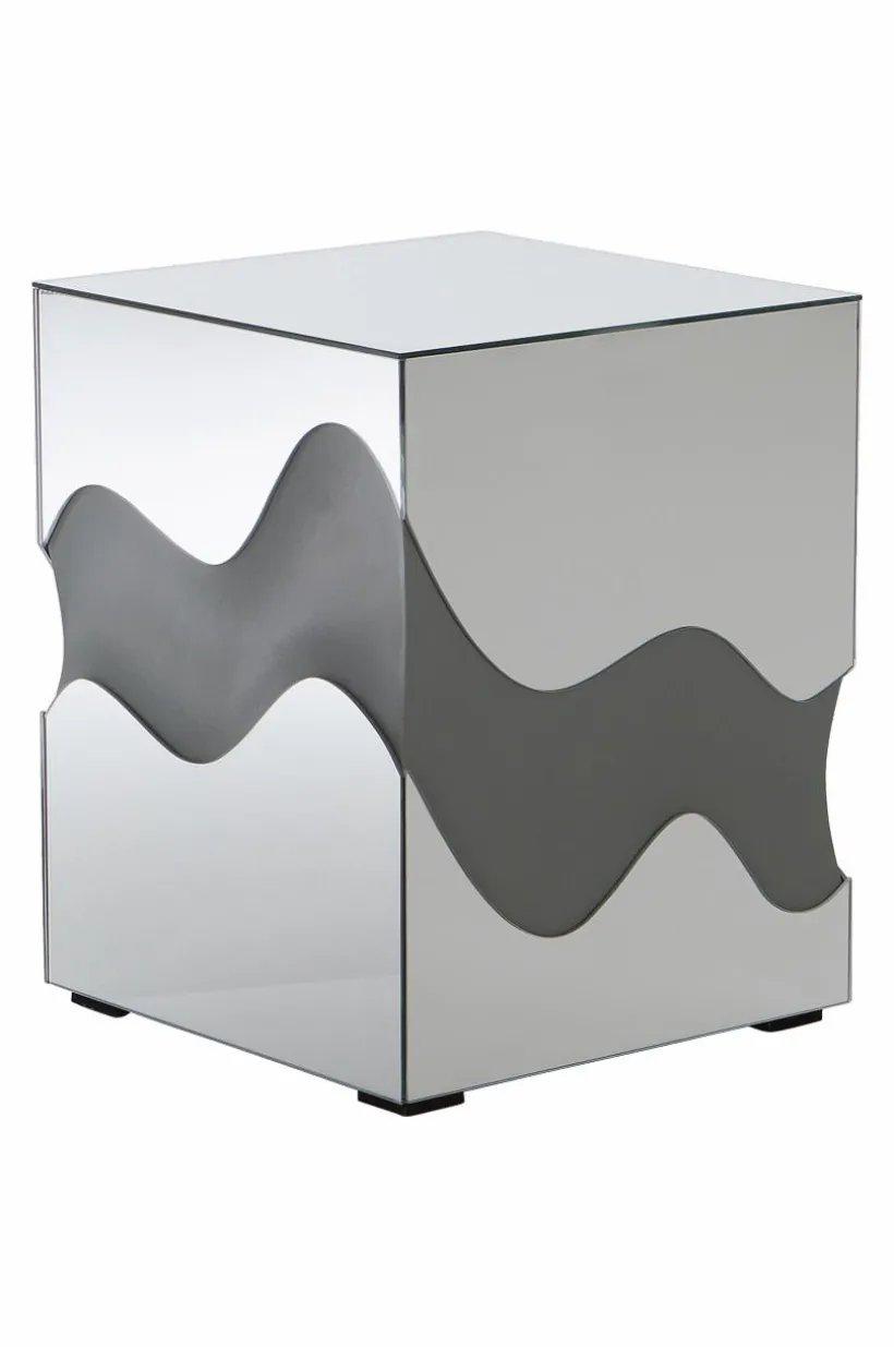 Kvadratiskt sidobord av glas med en dekorativ våg som böljar runt sidobordet. Stommen är av FSC-certifierad MDF. Sidobordet passar vid soffgruppen och den snygga designen gör att du med fördel kan använda det som piedestal med en vacker växt på eller varför inte en dekorativ vas?