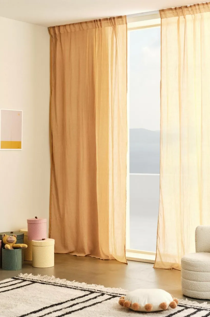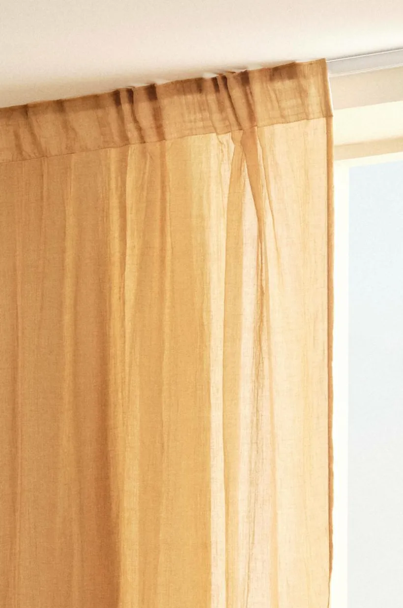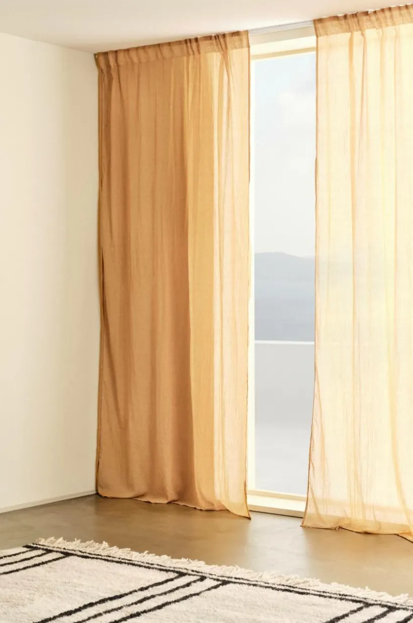 Två gardinlängder i mjuk bomullsblandning som ger ett fint fall. Påsytt multifunktionsband upptill gör att gardinen kan hängas upp med fingerkrokar, kanal samt dold hälla.