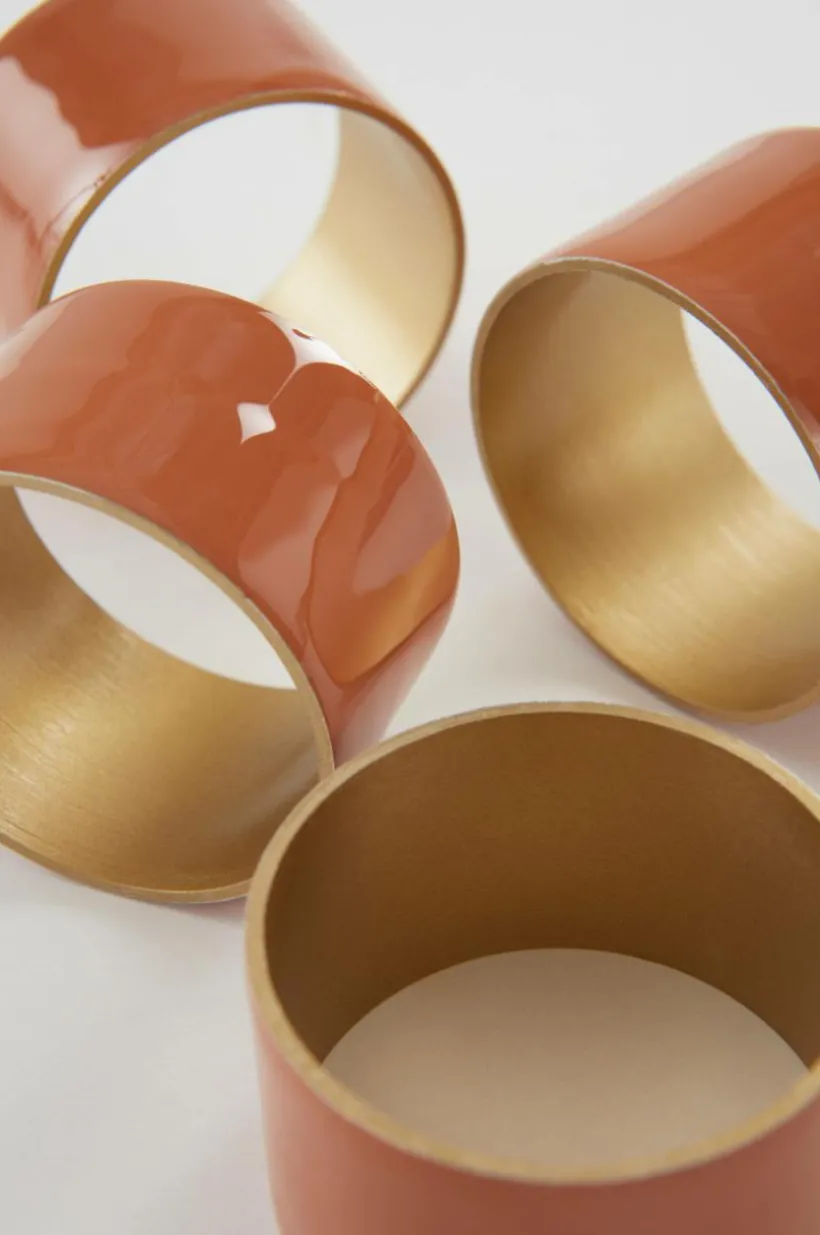 4-pack servettringar av aluminium. Servettringarna har pläterad insida i mässing- eller guldfärg och utsidan är emaljerad i mustig färg.