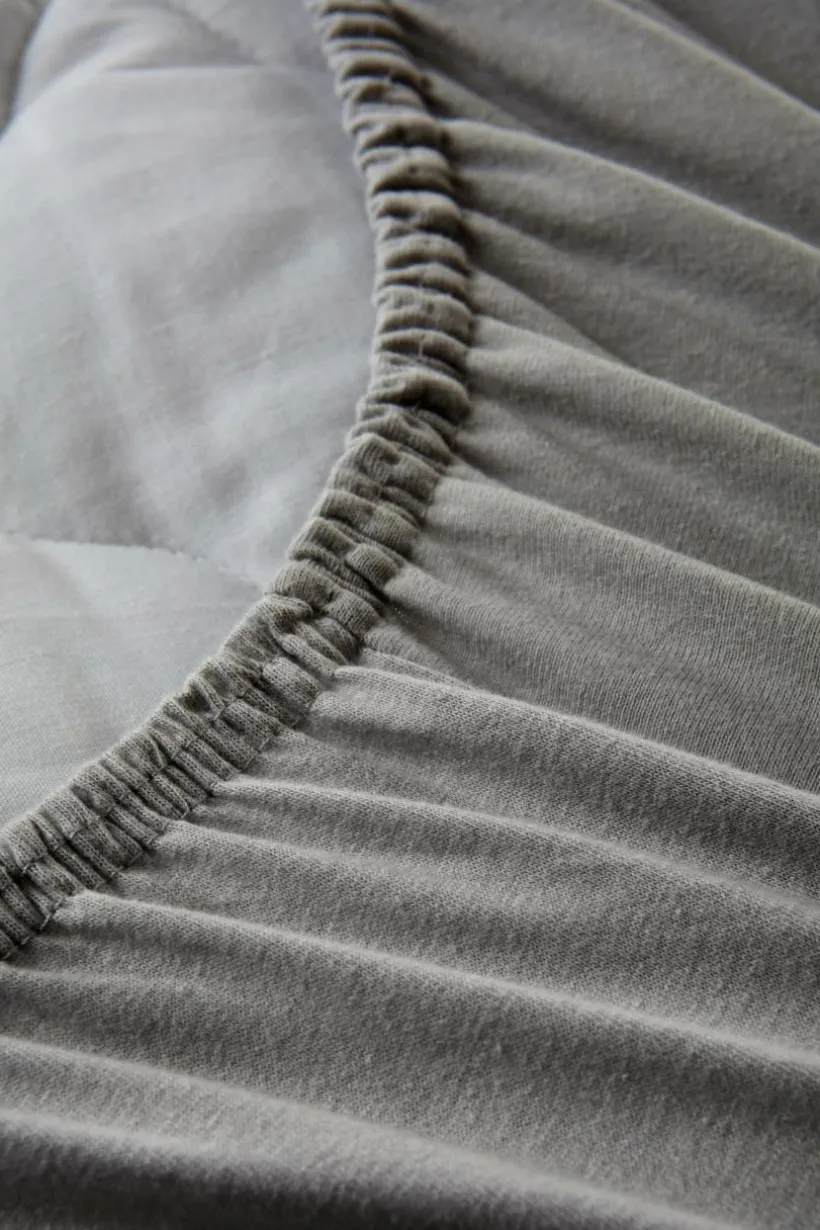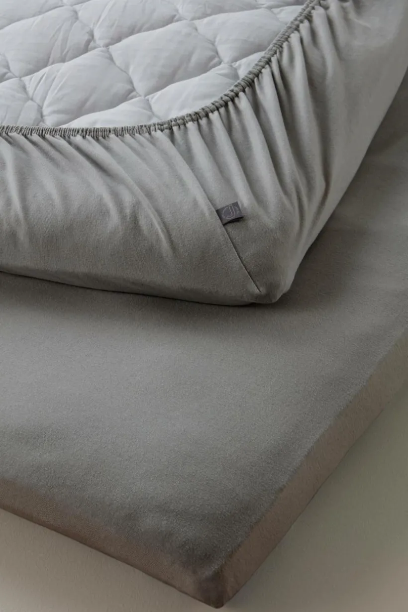 Enfärgat dra-på-lakan av mjuk och skön jersey av bomull. Den elastiska kanten runt varje hörn gör att lakanet sitter bra på madrassen. Trådtäthet på 150 tc. (Trådtätheten talar om antalet trådar, thread counts, per kvadrattum i ett tyg. Ju högre trådtäthet desto högre kvalité).