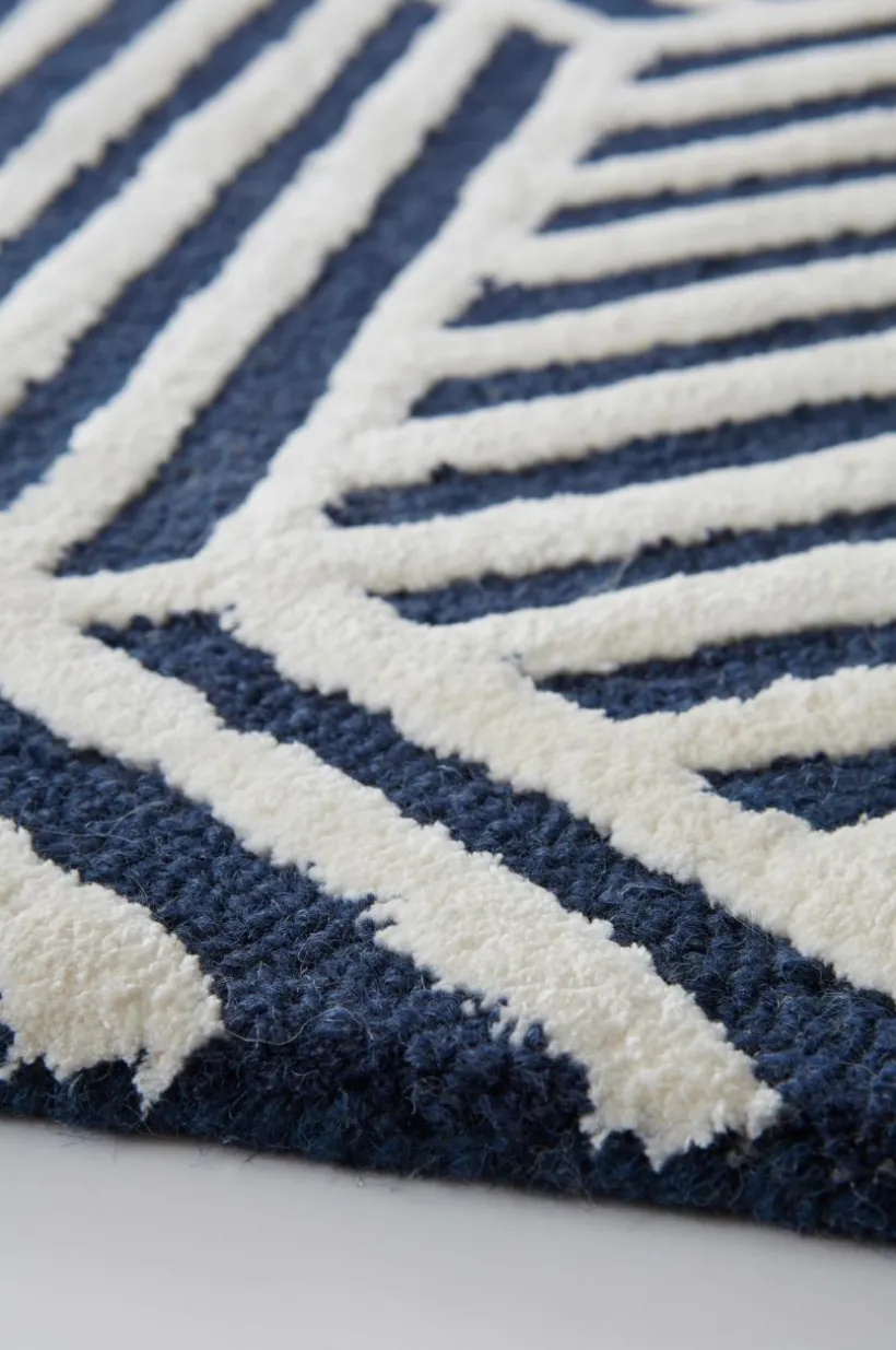 Handtuftad luggmatta av viskos. Det geometriska mönstret av ljusa och mörka ränder har olika höjd på luggen, klippt lugg kombinerat med vävda öglor. En handgjord matta är ett fint hantverk och varje matta är unik. Lugghöjd öglor 0,5-0,6 cm, klippt lugg 1-1,2 cm. Tjocklek 1,8-2 cm. 4400-4600 g/m².