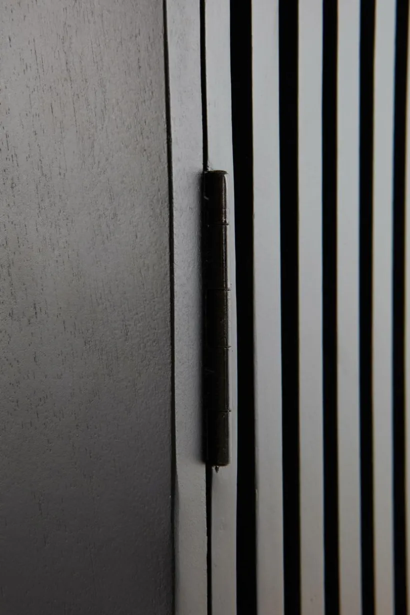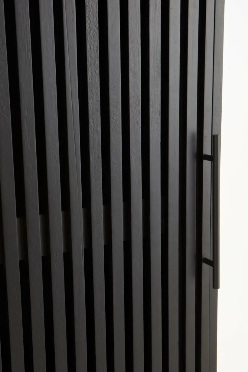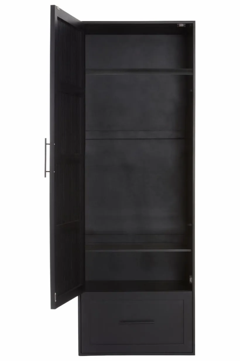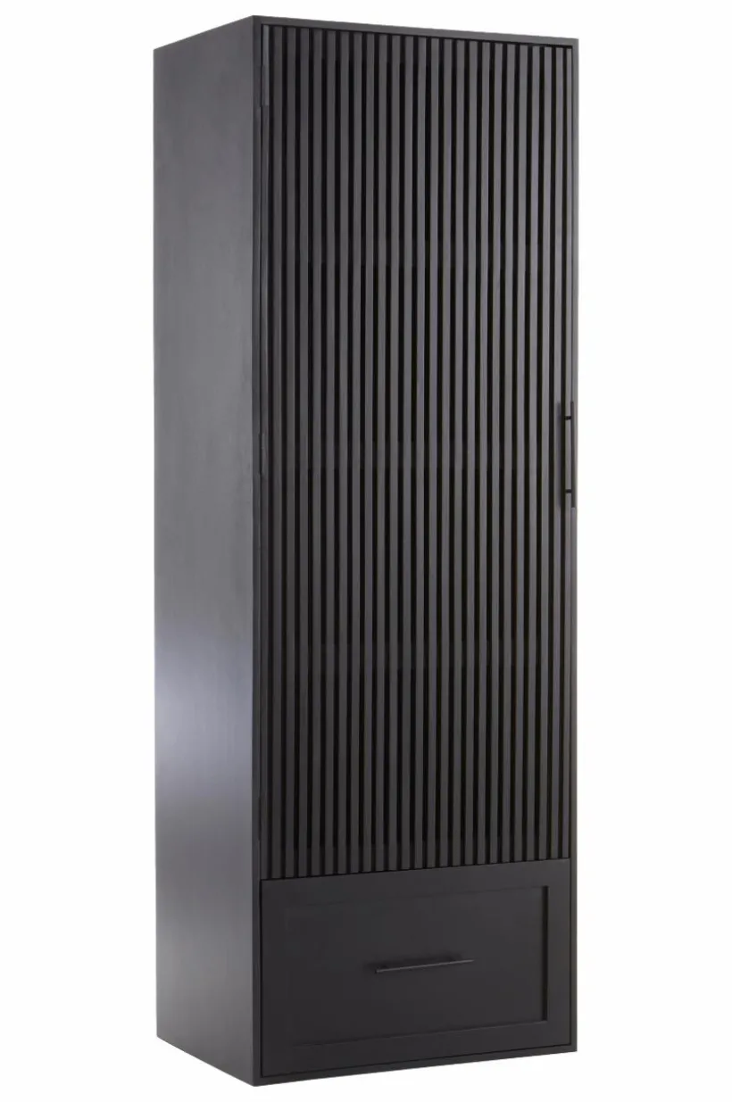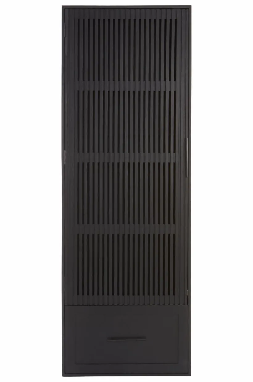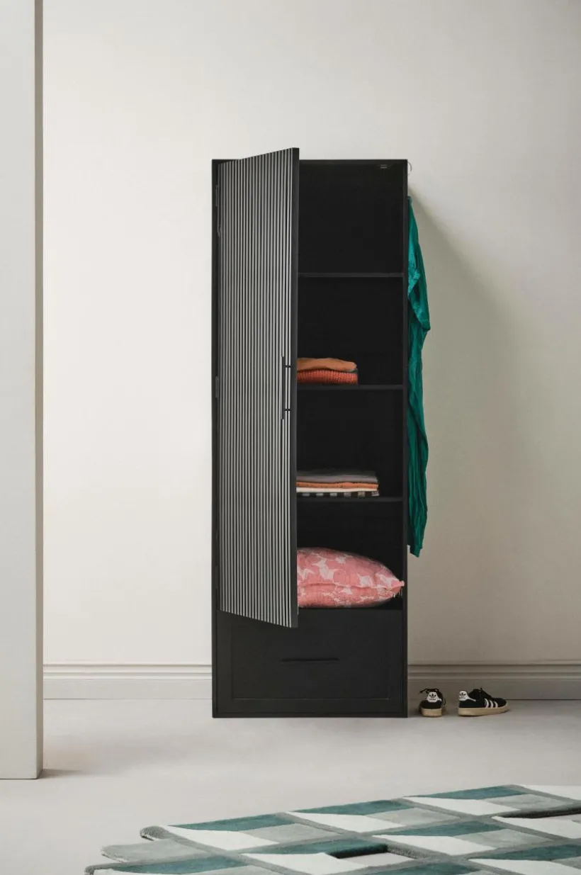 Garderob av mangoträ och MDF med matt finish. Dörren består av fyrkantiga ribbor som ger viss transparens. Nedtill har garderoben en låda. Invändigt har skåpet en klädstång av trä och ett fast hyllplan. Både låda och dörr har handtag av metall, dörren stängs med magnetlås.