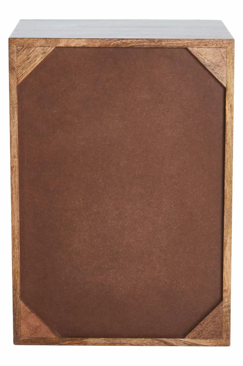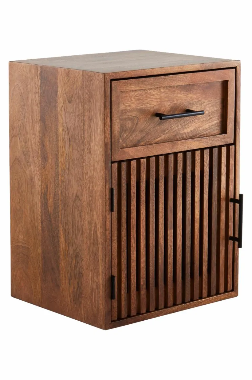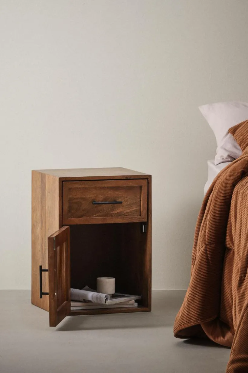 Sängbord av mangoträ och MDF med matt finish. Upptill har sängbordet en låda. Dörren till skåpsdelen består av fyrkantiga ribbor som ger viss transparens. Invändigt har skåpet ett fast hyllplan. Både låda och dörr har handtag av metall, dörren stängs med magnetlås.