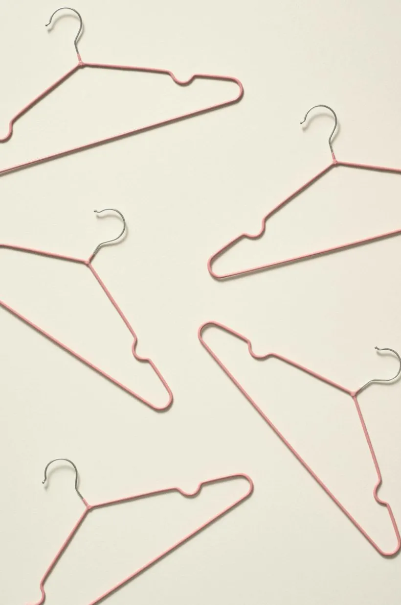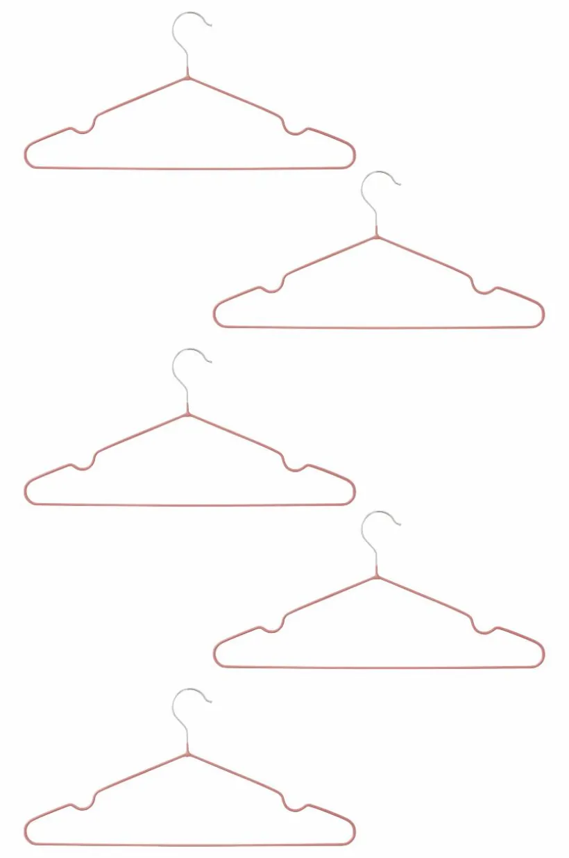 5-pack galgar av rostfritt stål med färgat plastöverdrag i glassiga färger. Galgarna är smidiga och tar liten plats i garderoben.
