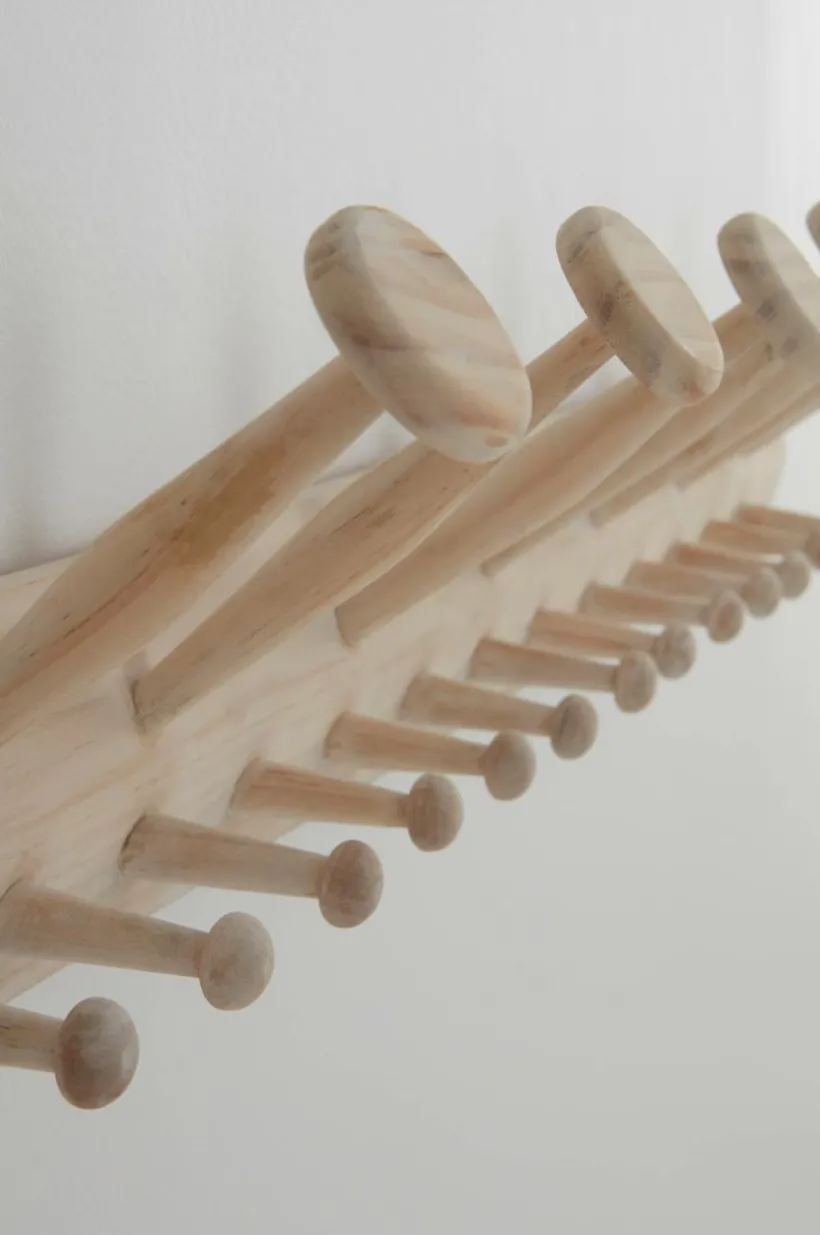 Hängaren COULTER är en charmig hängare av vitlaserad furu. COULTER är speciell och dekorativ med många hängare som rymmer mycket. Övre raden har stora hängare med stor knopp i ytterkanten. De passar perfekt för till exempel sjalar och väskor. Nedre raden har mindre hängare där du enkelt hänger upp kläder. COULTER erbjuder både praktisk och snygg förvaring i sängkammare eller hallen. Hängarna har bra form, så kläder och väskor hänger kvar utan att halka av. Viss montering krävs. Monteringsanvisning medföljer.