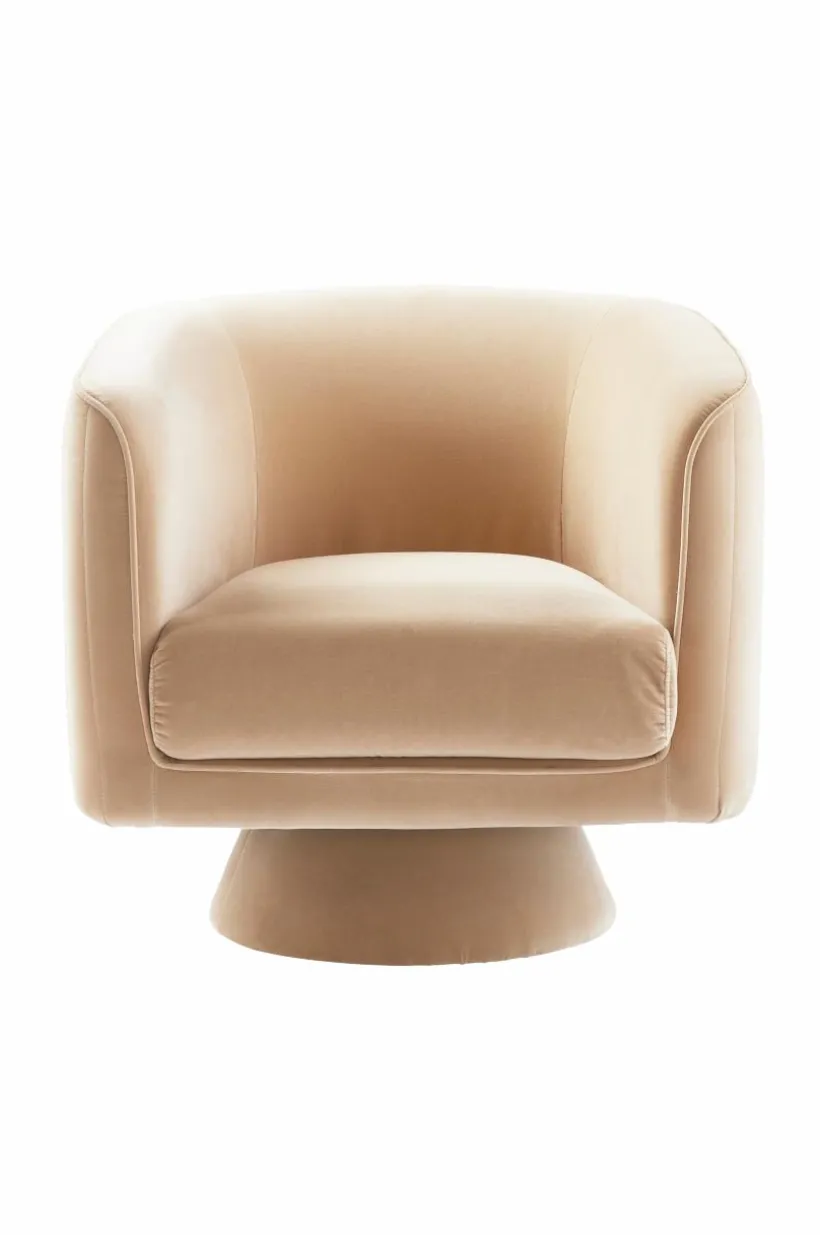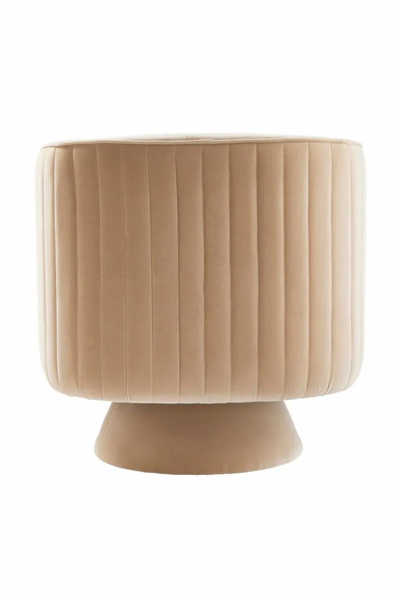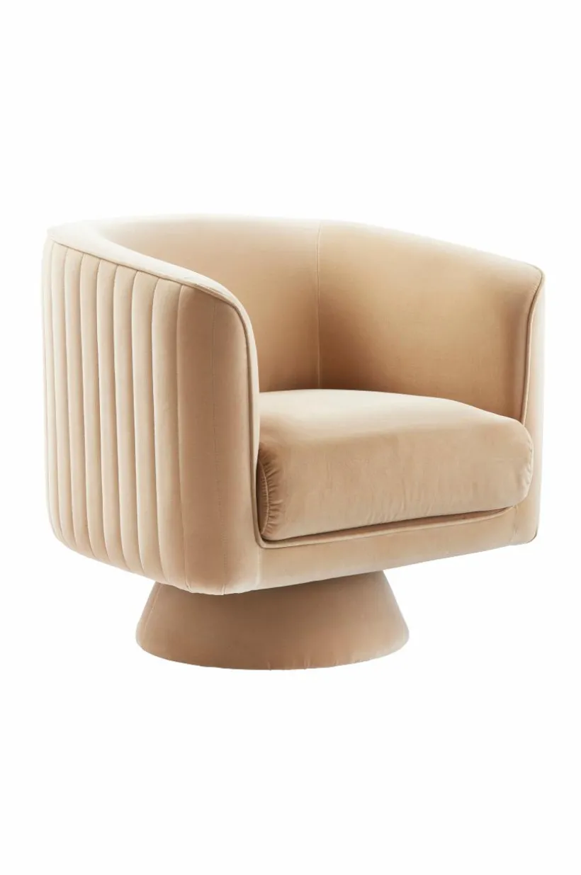 En lyxig och inbjudande sammetsfåtölj med härligt rund form och dessutom snurrfot så fåtöljen kan rotera 360 grader. Även foten är sammetsklädd. Fåtöljen har passpoalkanter och lodräta quiltsömmar runt ryggen.
