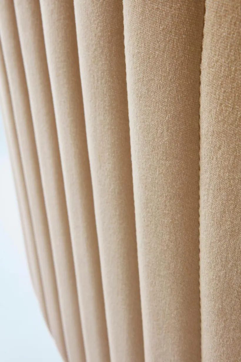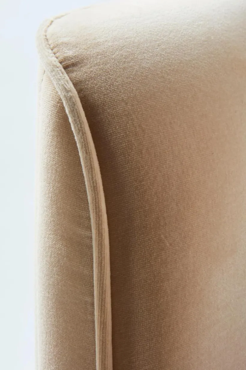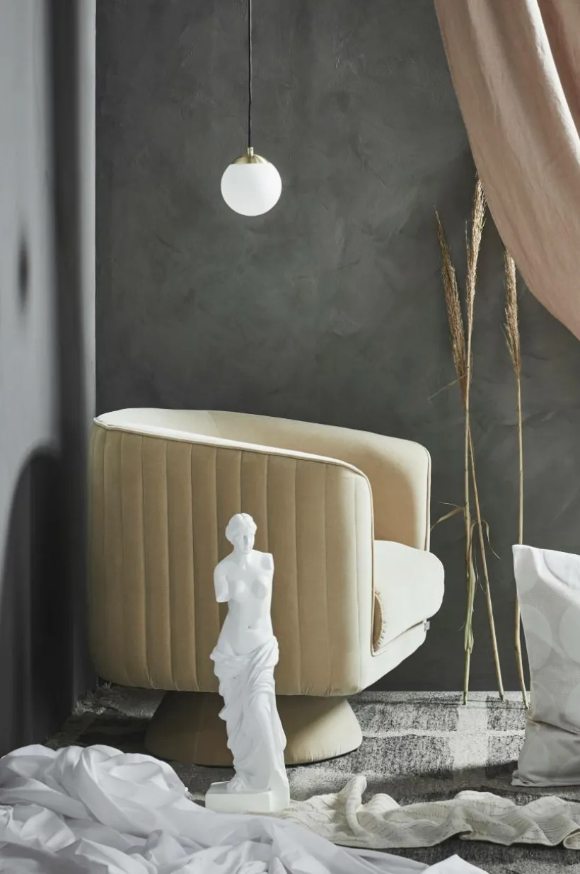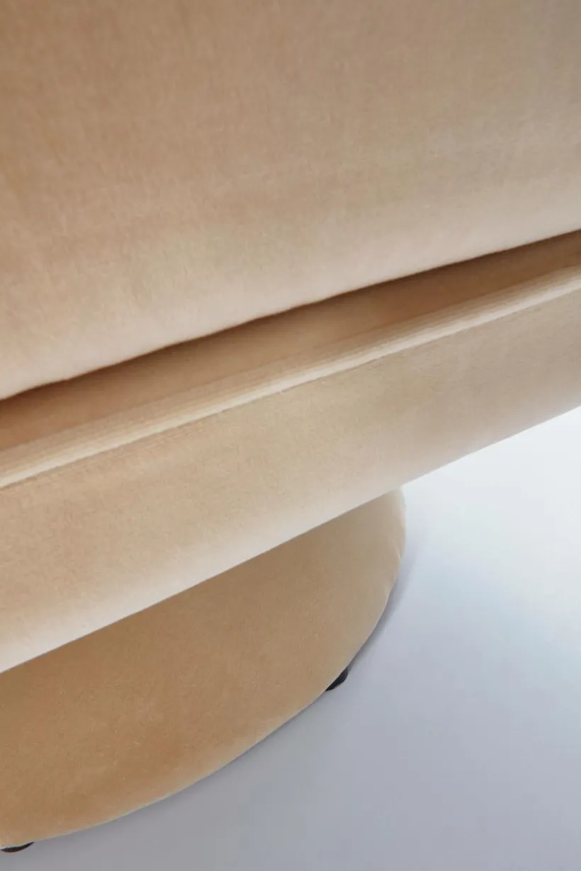 En lyxig och inbjudande sammetsfåtölj med härligt rund form och dessutom snurrfot så fåtöljen kan rotera 360 grader. Även foten är sammetsklädd. Fåtöljen har passpoalkanter och lodräta quiltsömmar runt ryggen.
