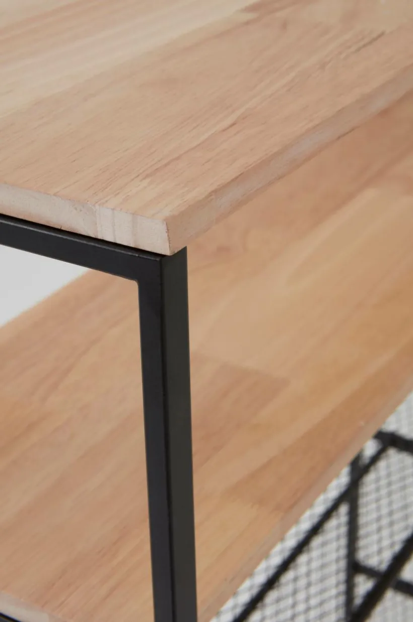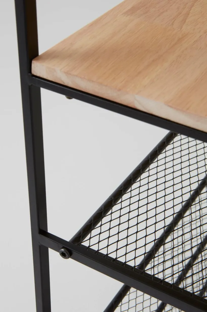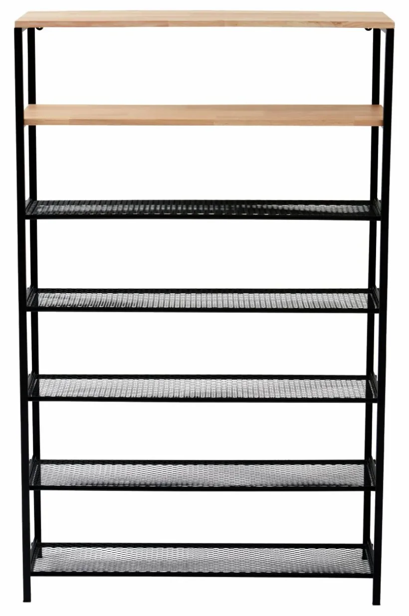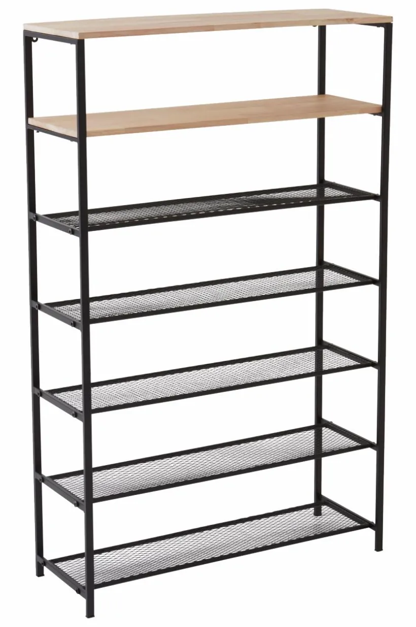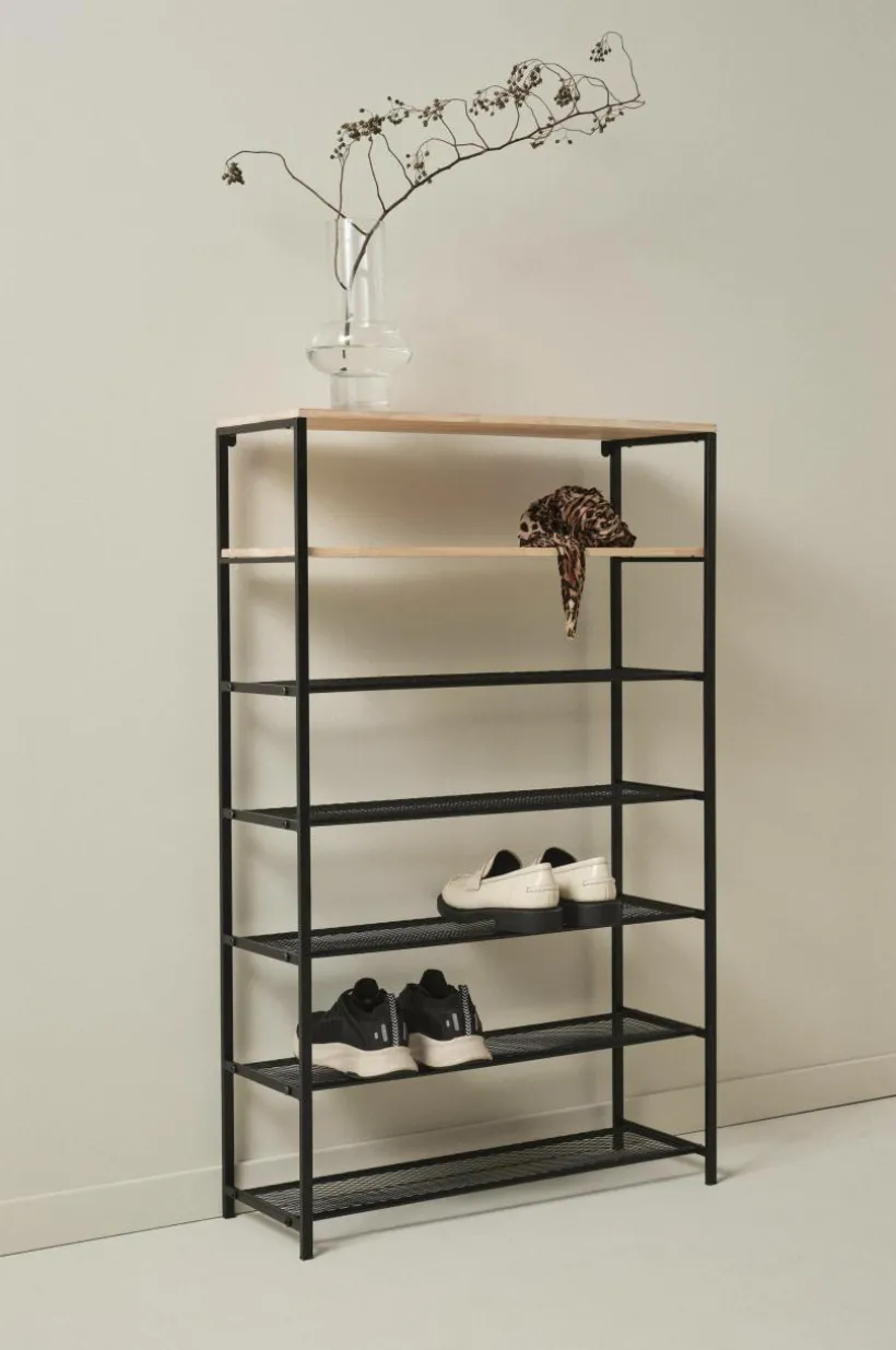 Skohylla i praktisk modell, tillverkad av järn och ek i snygg kombination. Denna skohylla rymmer många par skor då den har fem hyllplan för skor och överst har den dessutom två ekhyllor för allt från vantar till mobiler, nycklar och små väskor. Hyllan har fyrkantig profil i ramen, skohyllorna har klätts med fint nät av metall. De två översta trähyllorna har skönheten som bara ek kan ha. Att samla skorna på höjden är perfekt i en liten hall och du får mycket lättare att hålla ordning. Att golvyta frigörs är bra för framkomligheten. Viss montering krävs. Monteringsanvisning medföljer.