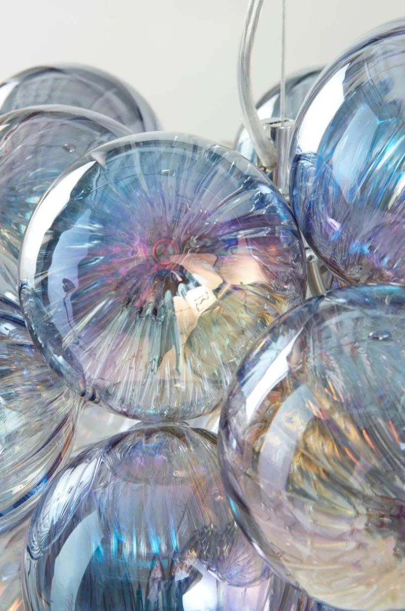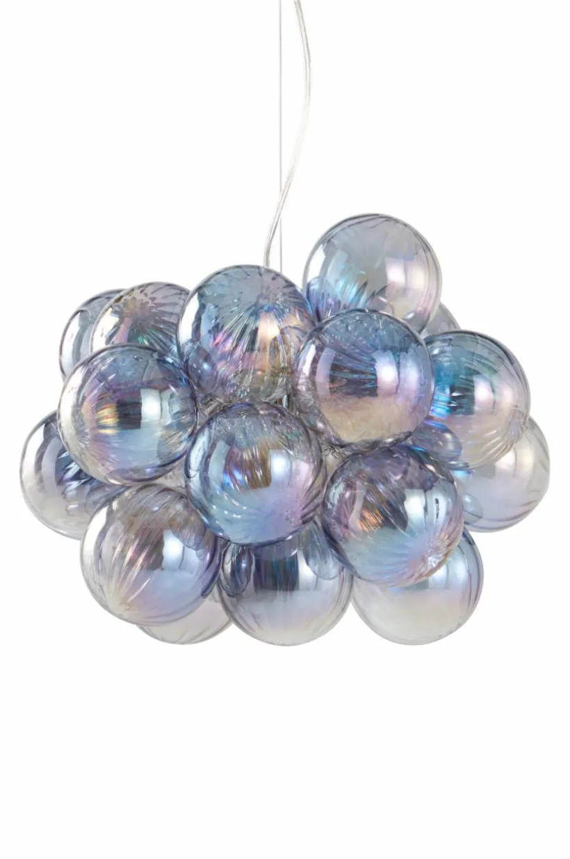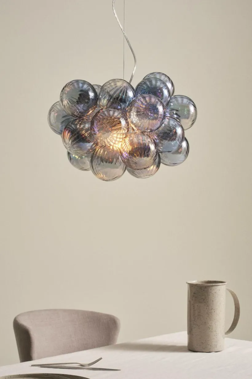 Taklampa av metall med kupor av läckert färgat glas som som skimrar i pärlemorlika nyanser. De 23 kuporna har randning i glaset och de sprider ett fint sken från ljuskällan i mitten av lampan. Takkoppen är i kromfärgad metall och har en krok för upphängning. Transparent sladd. Lampan är jordad, klass 1. På grund av EU-regler behövs en separat takkontakt i vissa länder. Takkontakten ska vara jordad (klass 1) och köps separat.