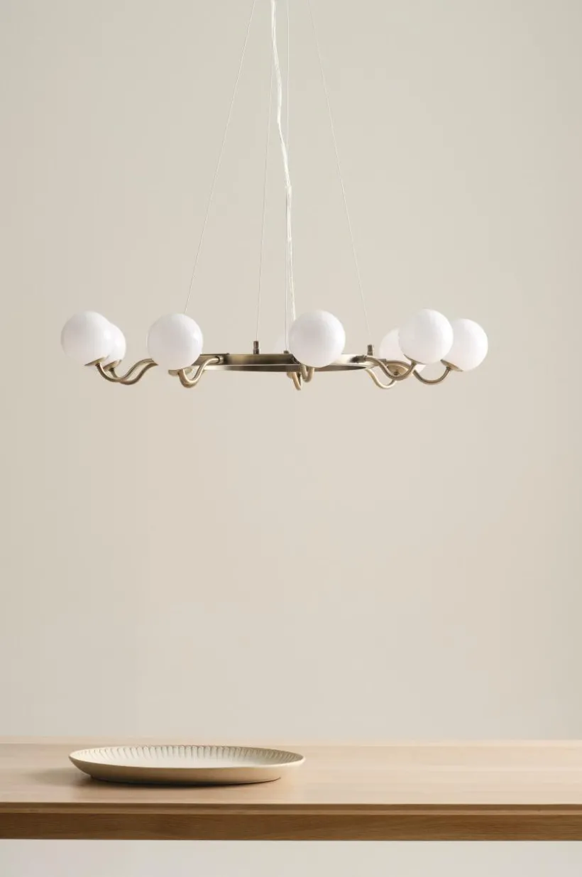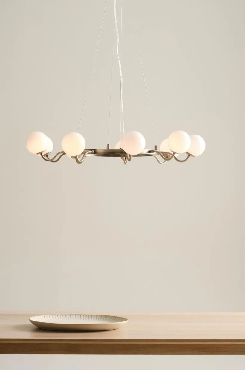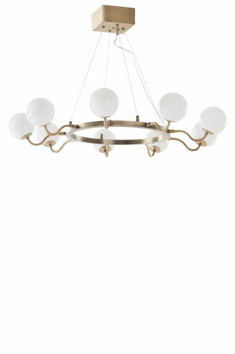 Ljuskronan CURVY är stor och elegant, tillverkad av metall med nio glaskupoler, vilket gör den till en fantastisk fokuspunkt för olika rum. Den här ljuskronan är perfekt att hänga över matbord och förhöjer även stämningen i sovrum och vardagsrum. Den sofistikerade designen ger en touch av lyx och charm och smälter in i olika inredningsstilar samtidigt som den ger riklig belysning.